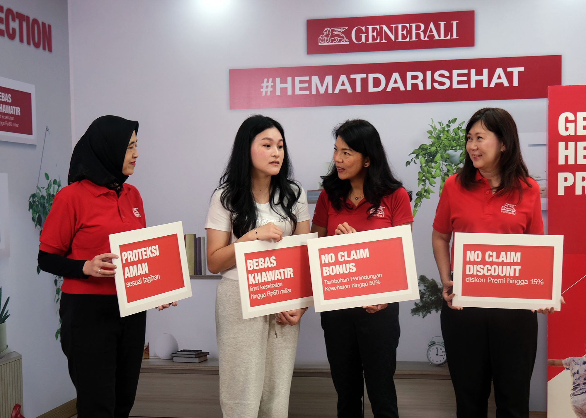 President Director dan Chief Executive Officer PT Asuransi Jiwa Generali Indonesia Rebecca Tan (kanan) didampingi Director Chief Agency Officer Jutany Japit (kedua kiri) dan Operation Group Head Suzwamela Zawawi (kiri) bersama nasabah Lisadea saat acara peluncuran GEN HealthCare Protection di Jakarta, Kamis (11/9).