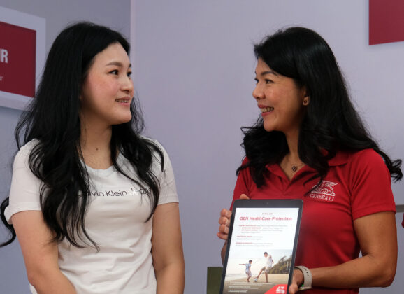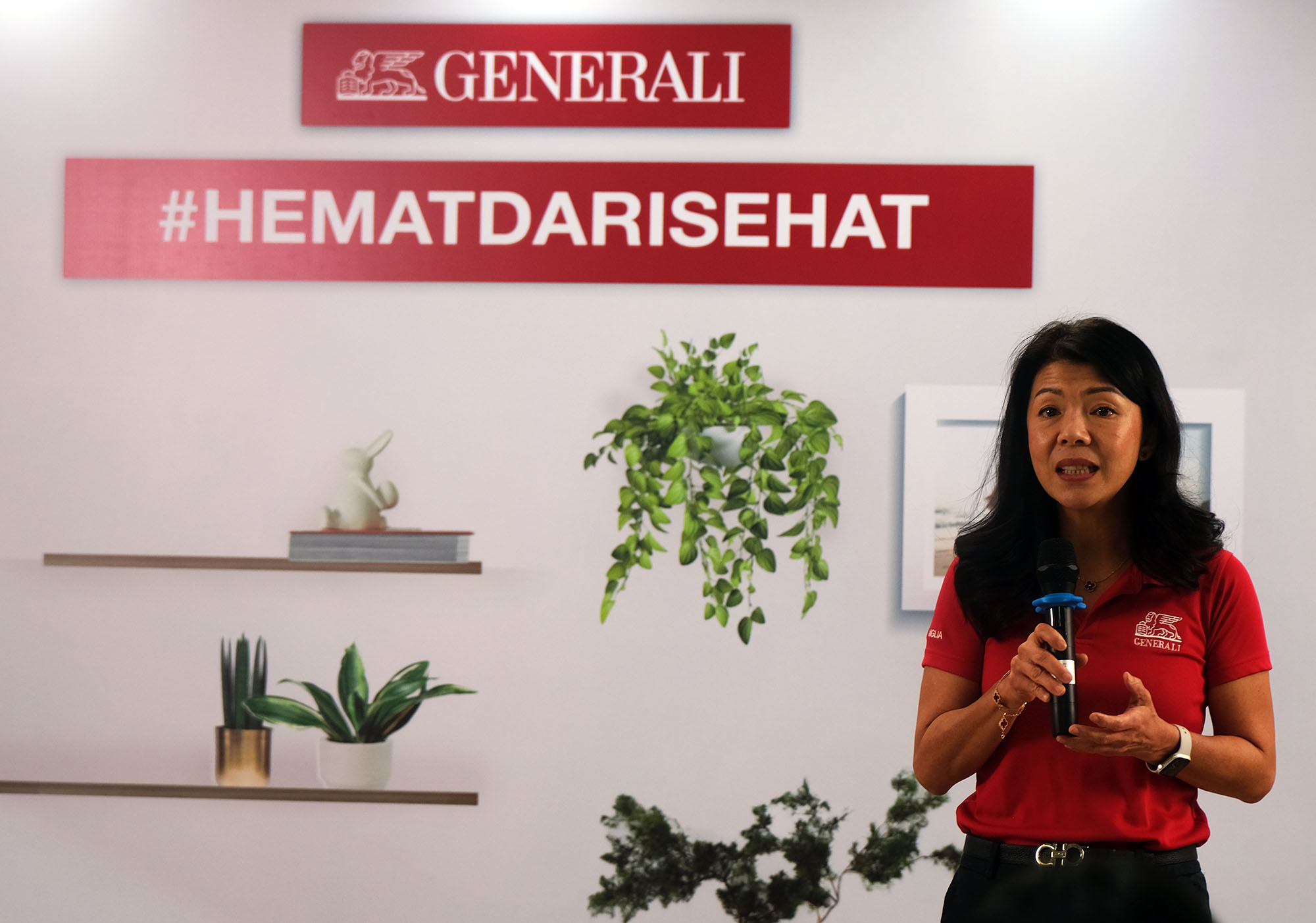 President Director dan Chief Executive Officer PT Asuransi Jiwa Generali Indonesia Rebecca Tan (kanan) berbincang dengan nasabah Lisadea saat acara peluncuran GEN HealthCare Protection di Jakarta, Kamis (11/9).