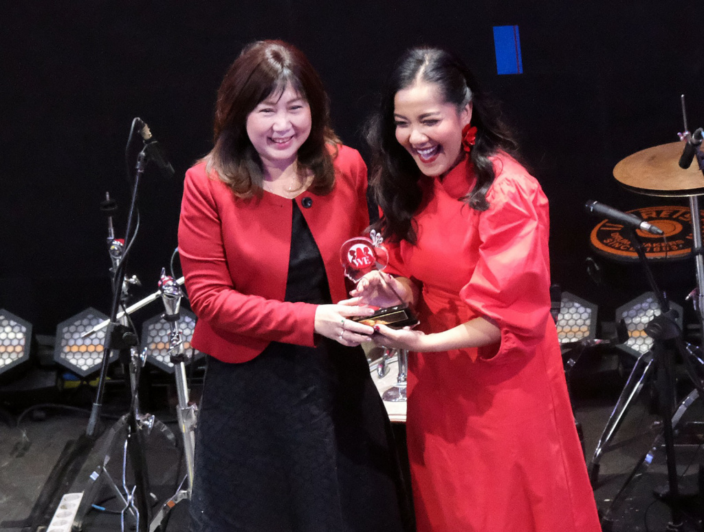 Direktur and Chief Agency Officer Generali Indonesia, Jutany Japit (kiri), menyerahkan cinderamata kepada public figure, Ivy Batuta (kanan) saat acara peluncuran WE Community atau Women Empowerment Community, di Gading Serpong, Tangerang, Banten, Sabtu (26/7/2025).