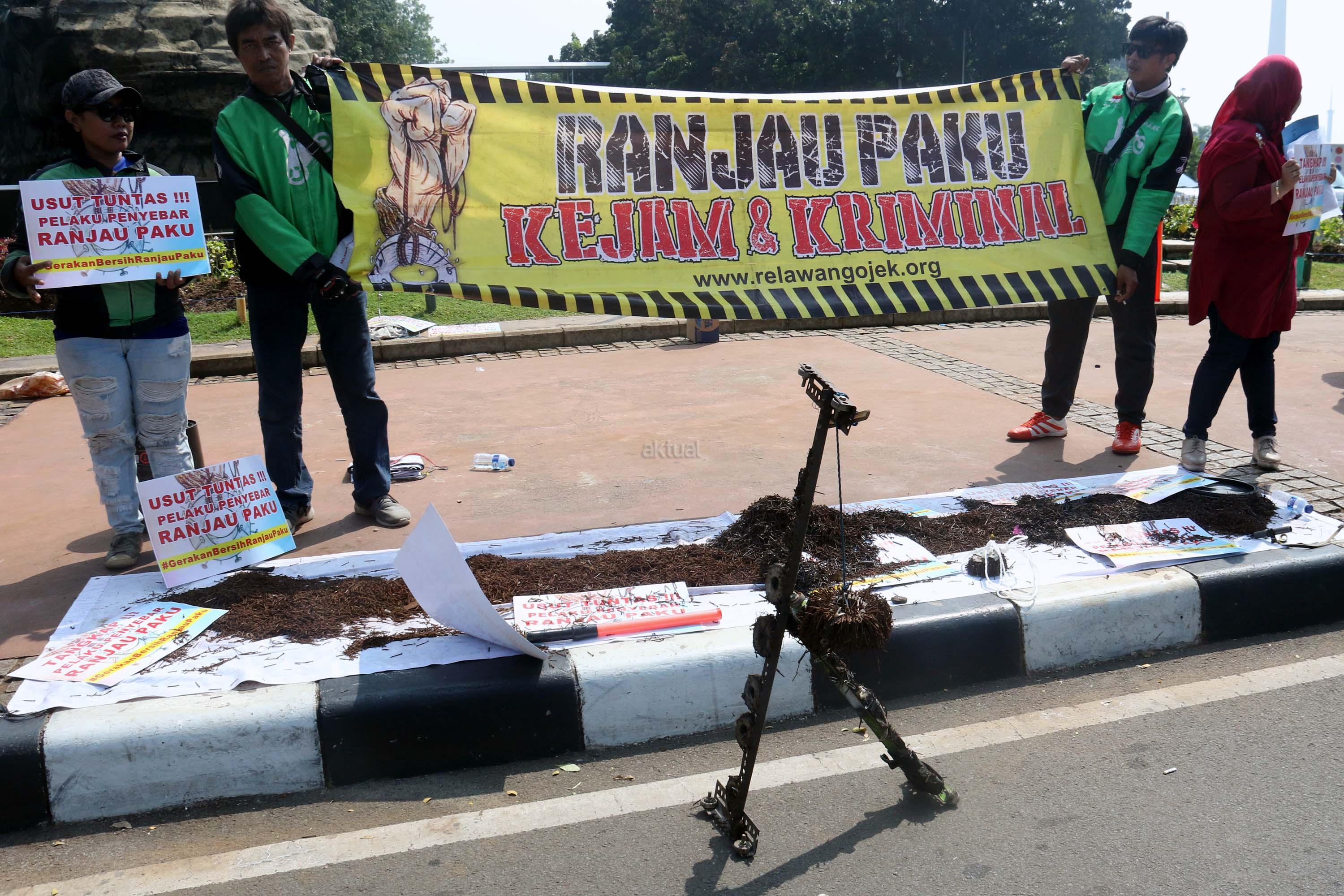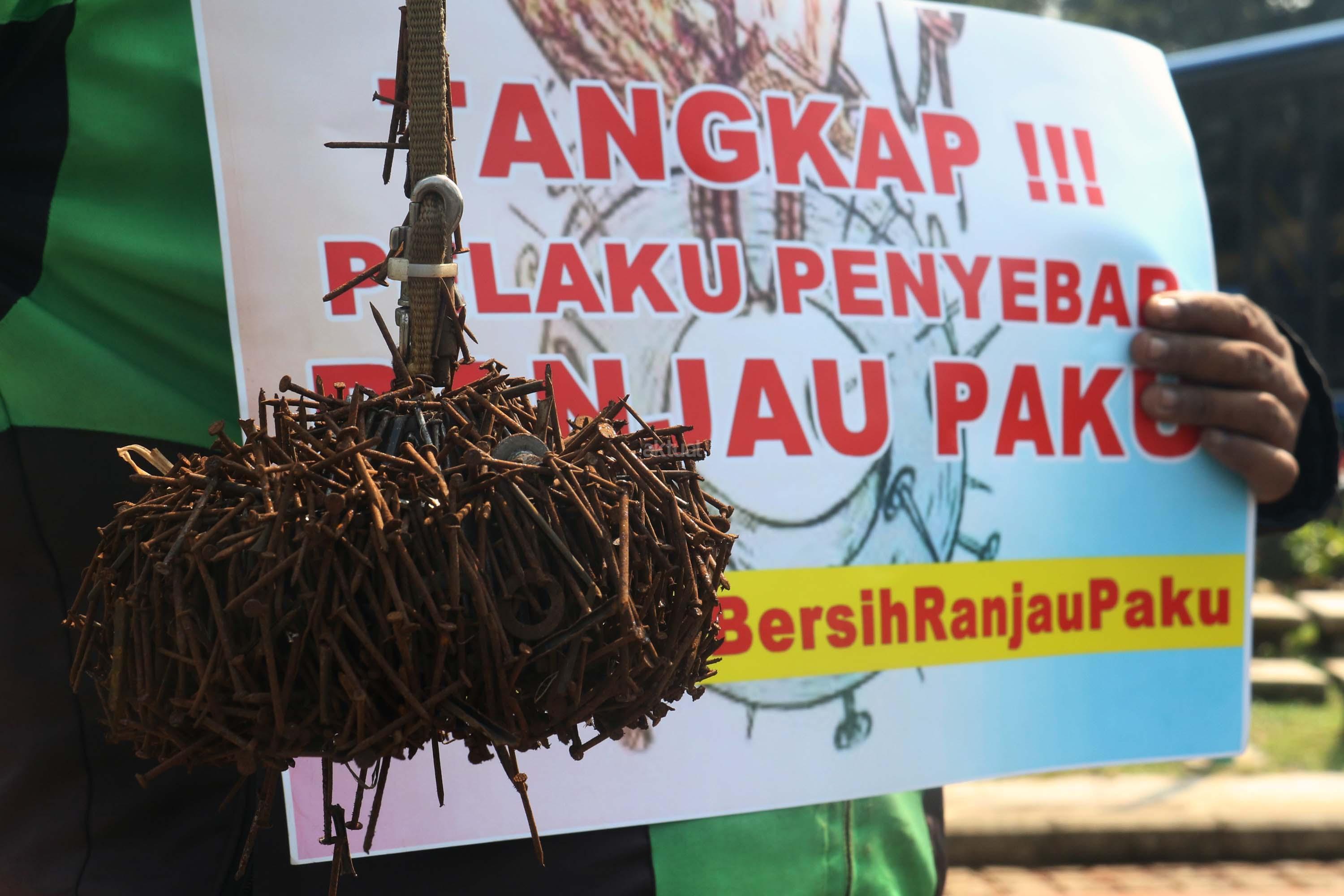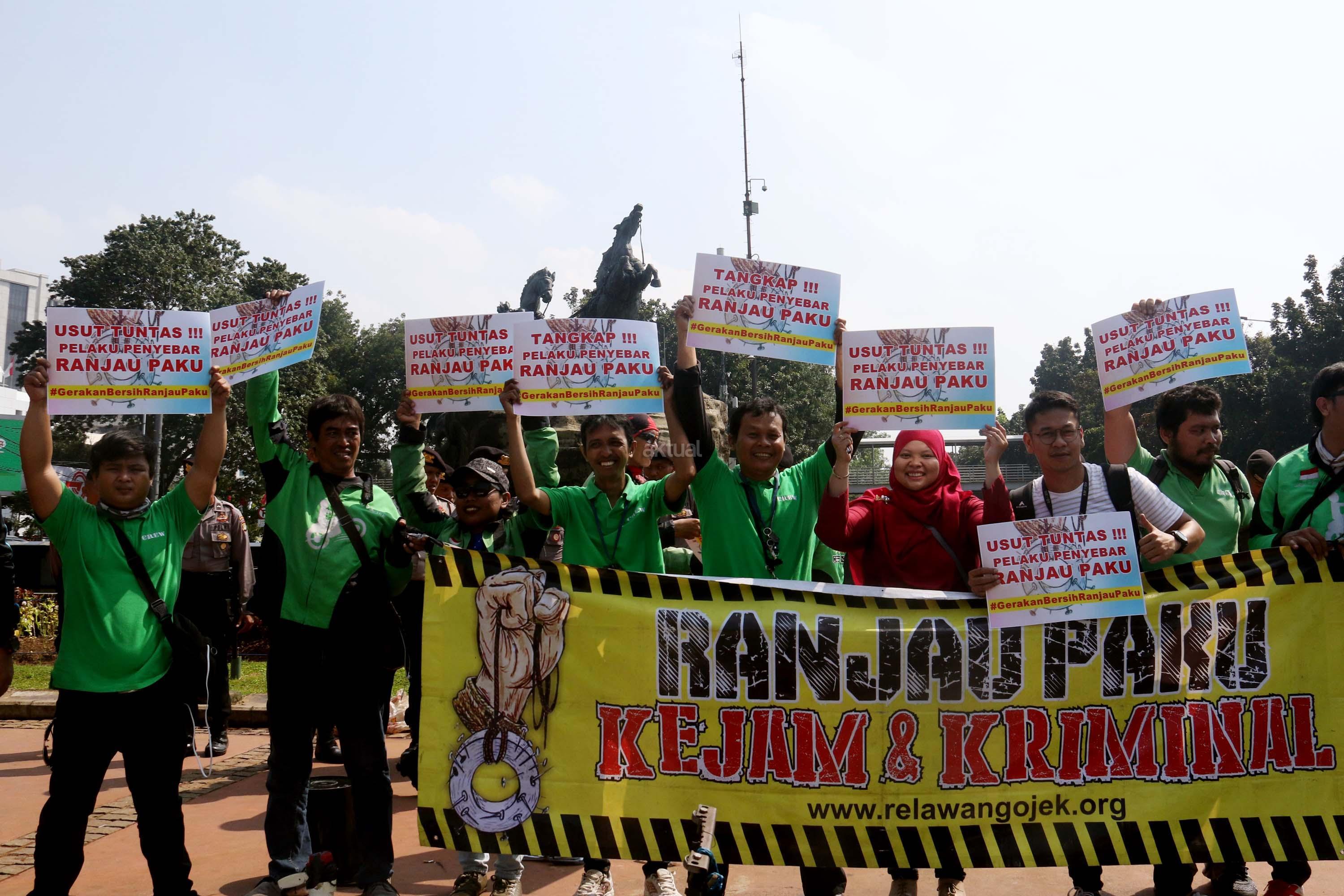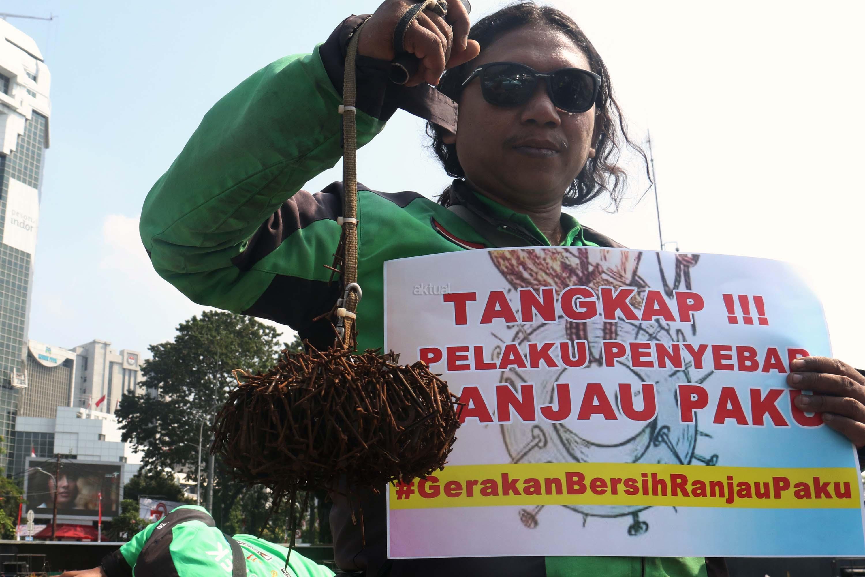 Sejumlah driver ojek online yang tergabung dalam Komunitas Gerakan Bersih Ranjau Paku (GBRP) melakukan aksi unjuk rasa di depan bundaran patung kuda, Jakarta, Senin (31/7/2017). Dalam aksinya para driver ojek online mendesak pihak pemerintah ataupun penegak hukum untuk mengusut tuntas pelaku ranjau paku. AKTUAL/Munzir