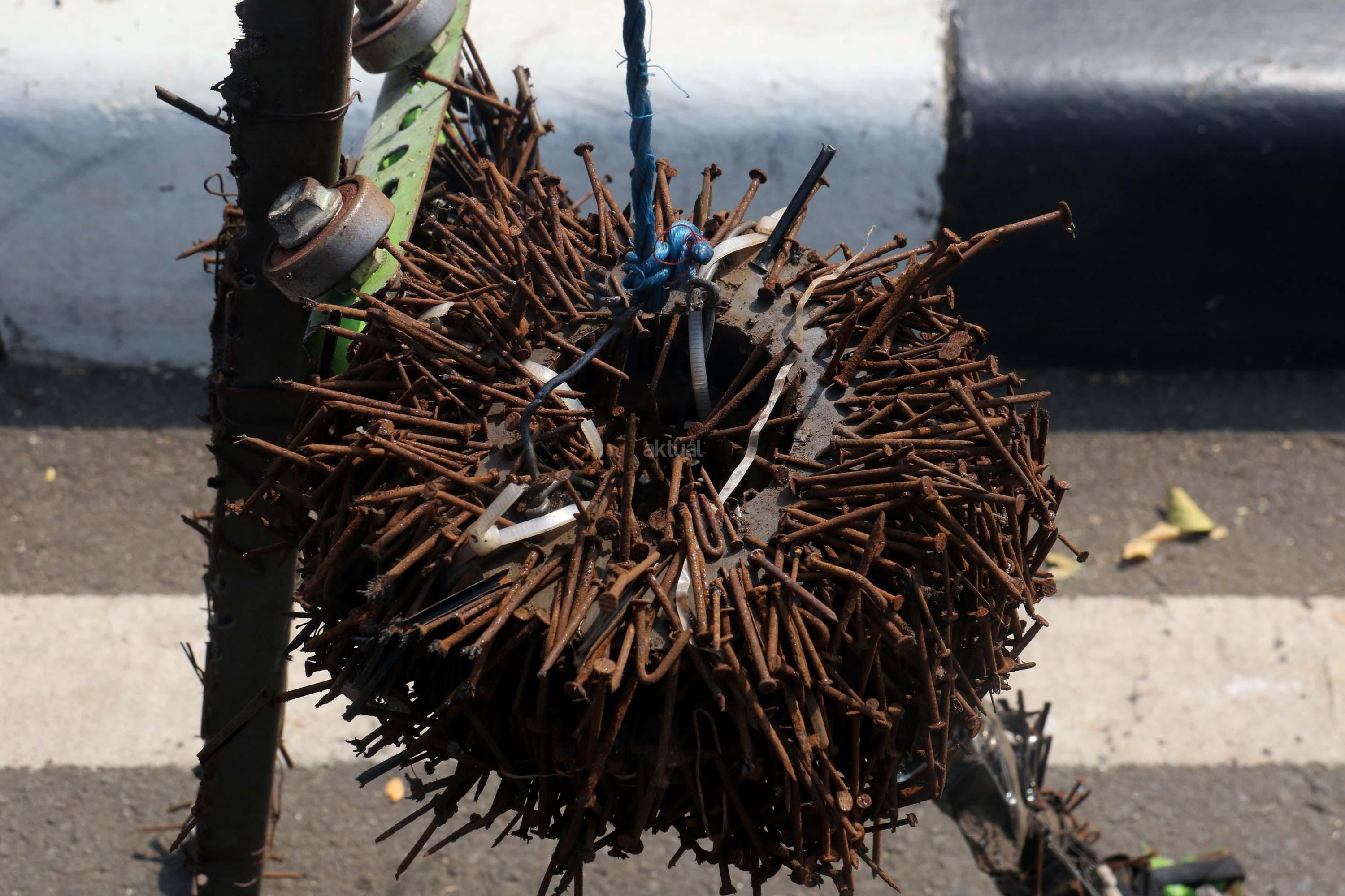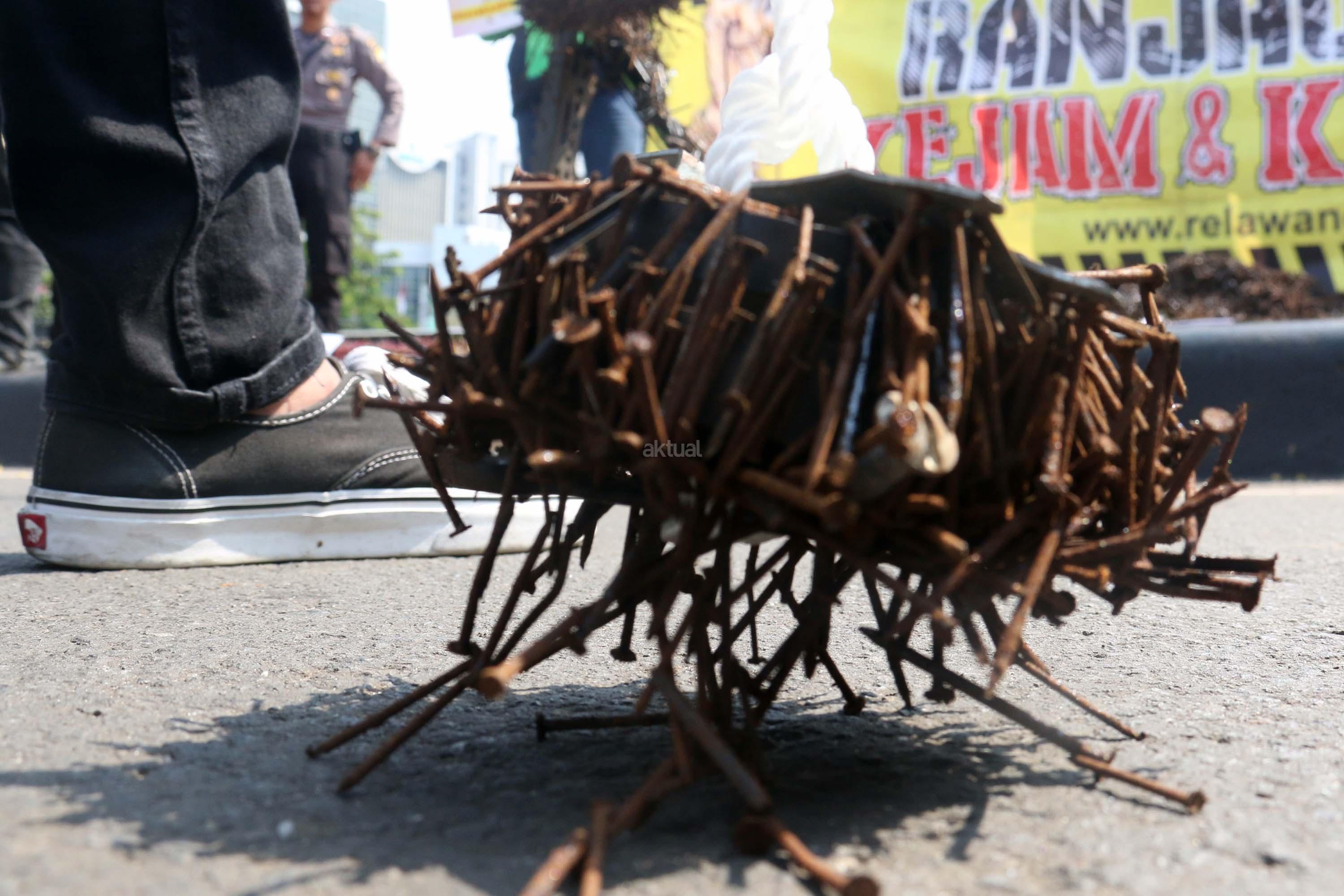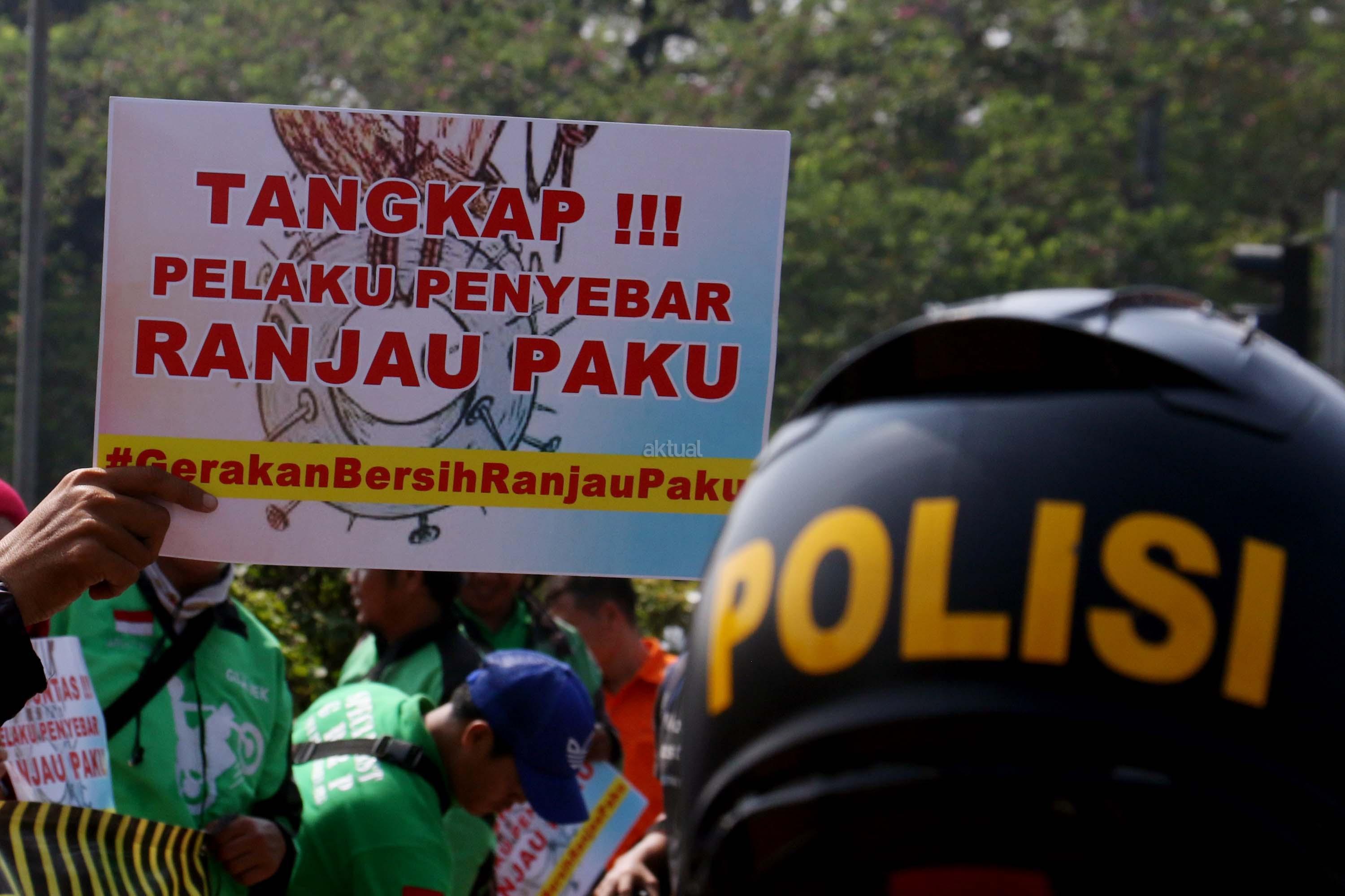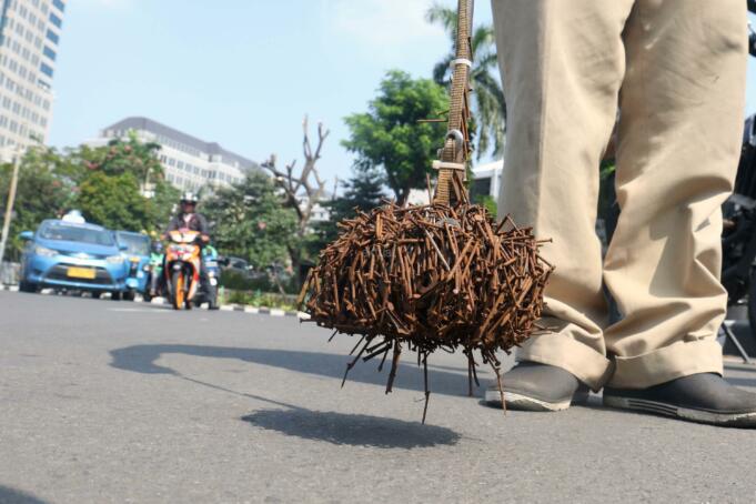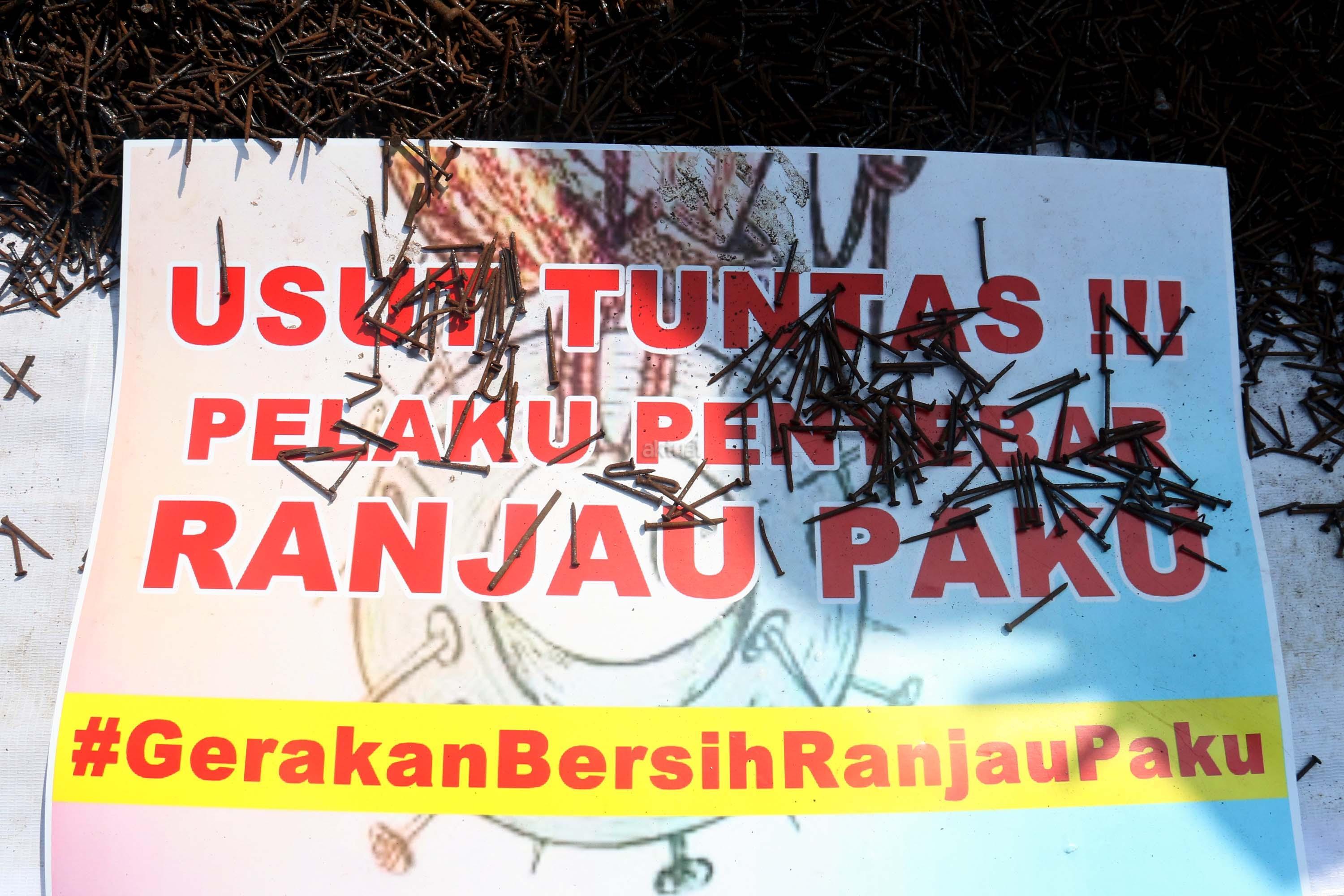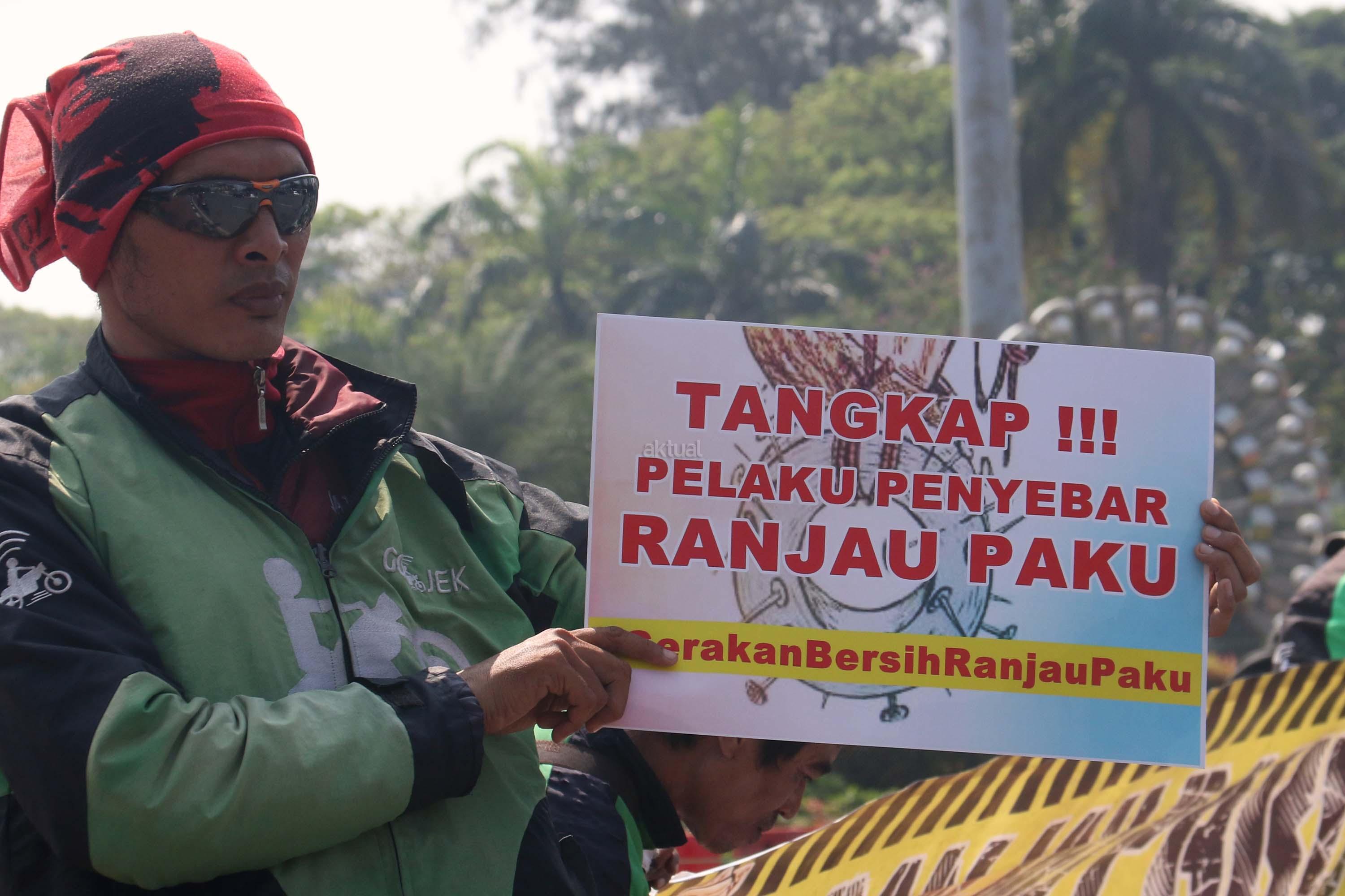 Sejumlah driver ojek online yang tergabung dalam Komunitas Gerakan Bersih Ranjau Paku (GBRP) melakukan aksi unjuk rasa di depan bundaran patung kuda, Jakarta, Senin (31/7/2017). Dalam aksinya para driver ojek online mendesak pihak pemerintah ataupun penegak hukum untuk mengusut tuntas pelaku ranjau paku. AKTUAL/Munzir
