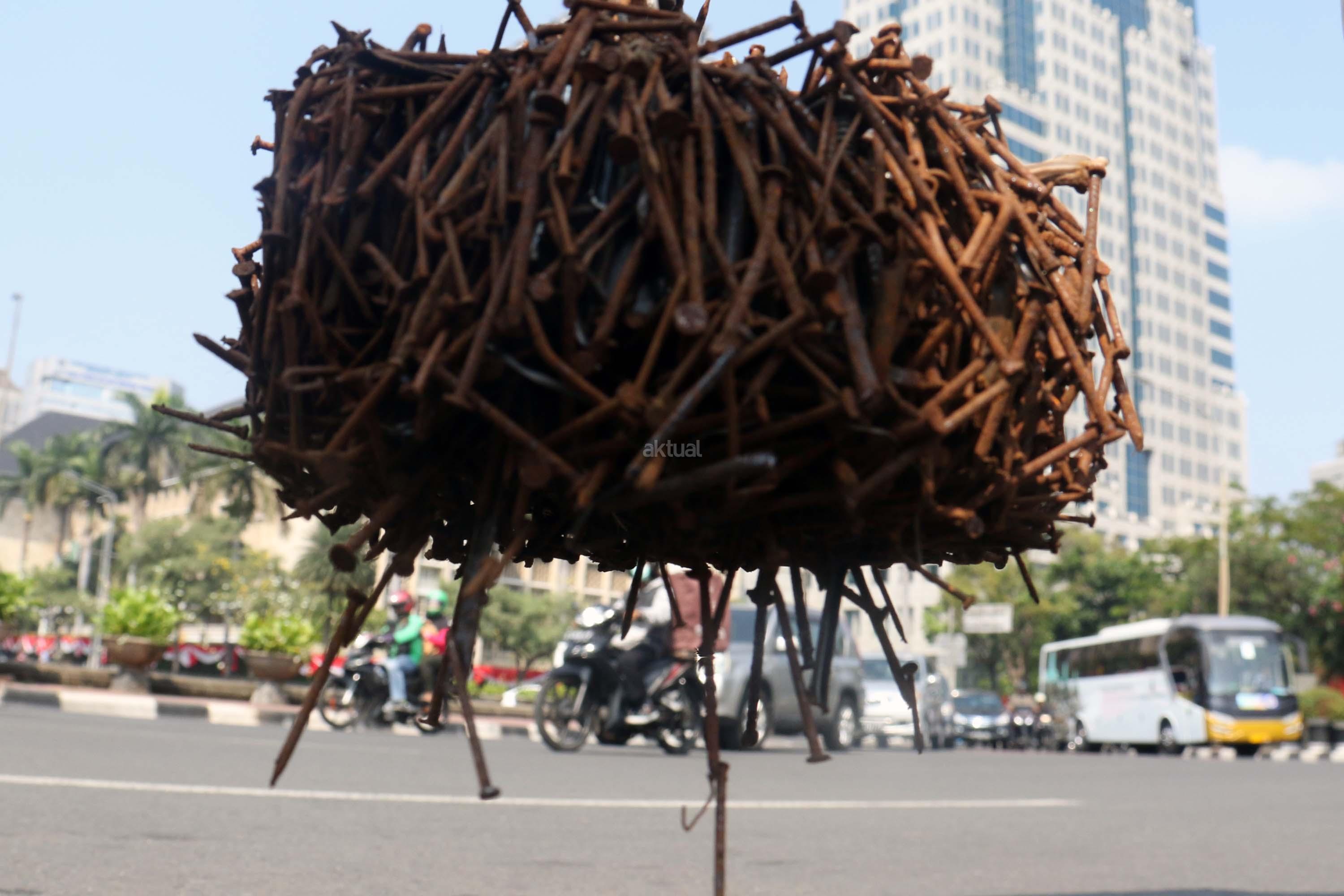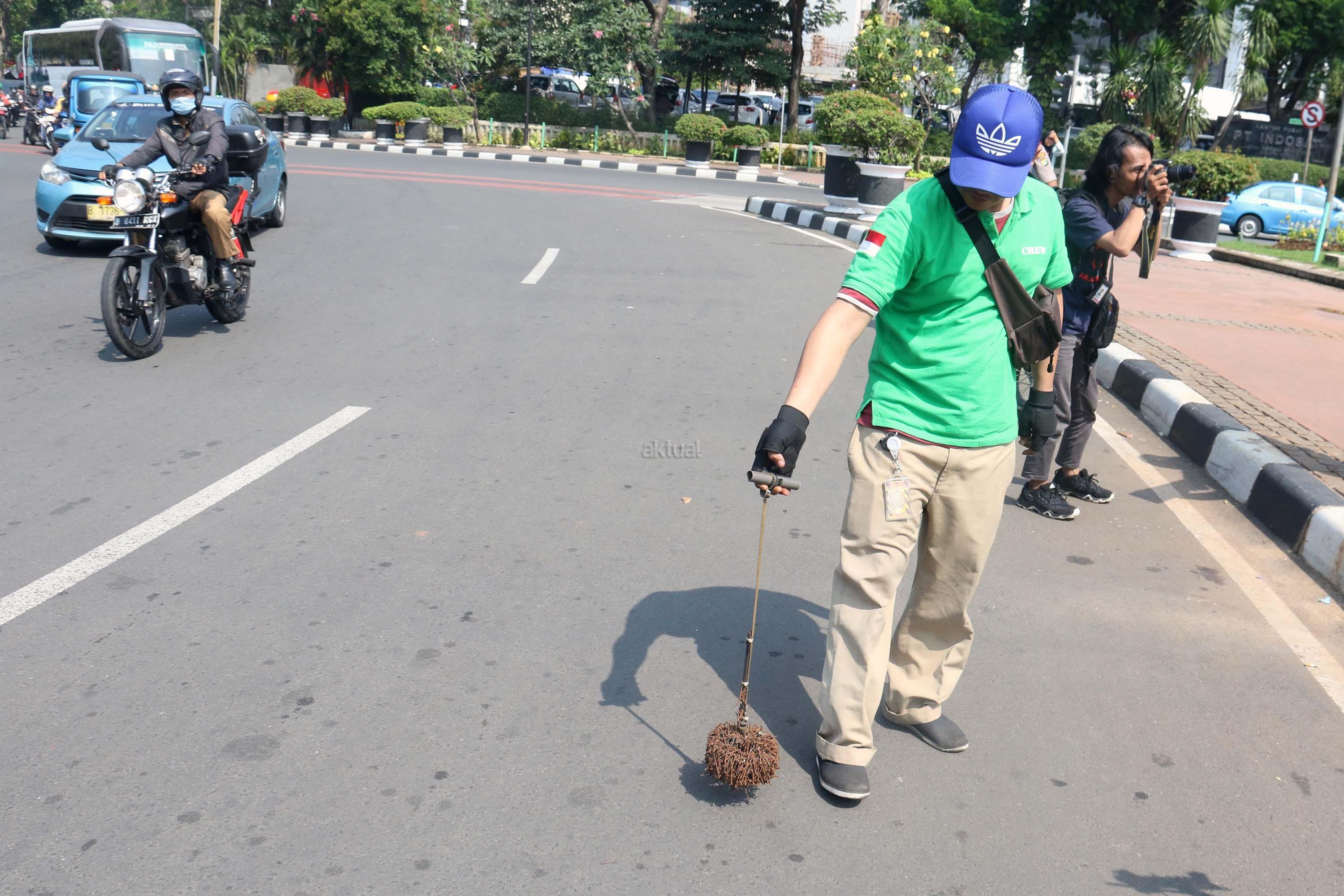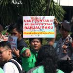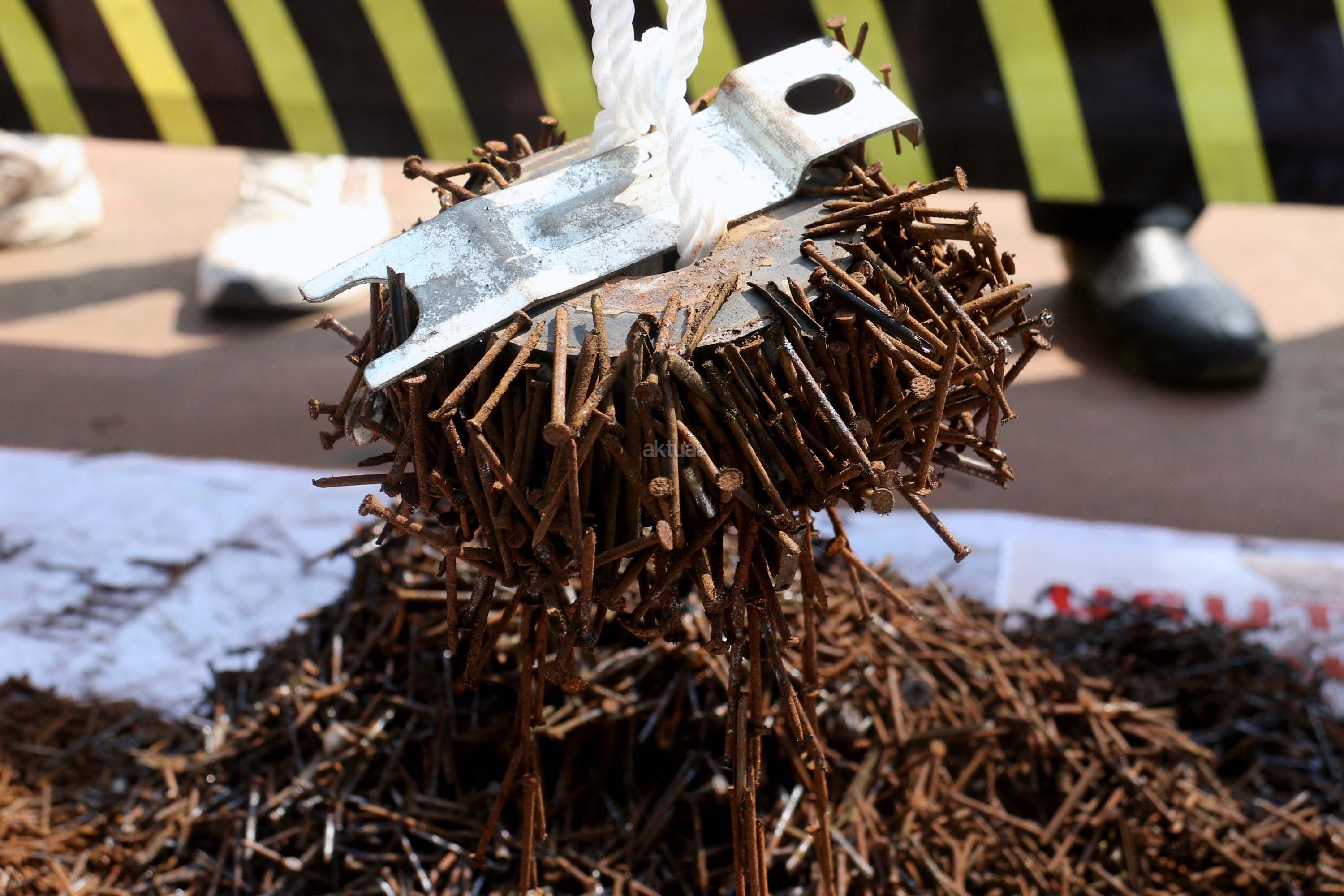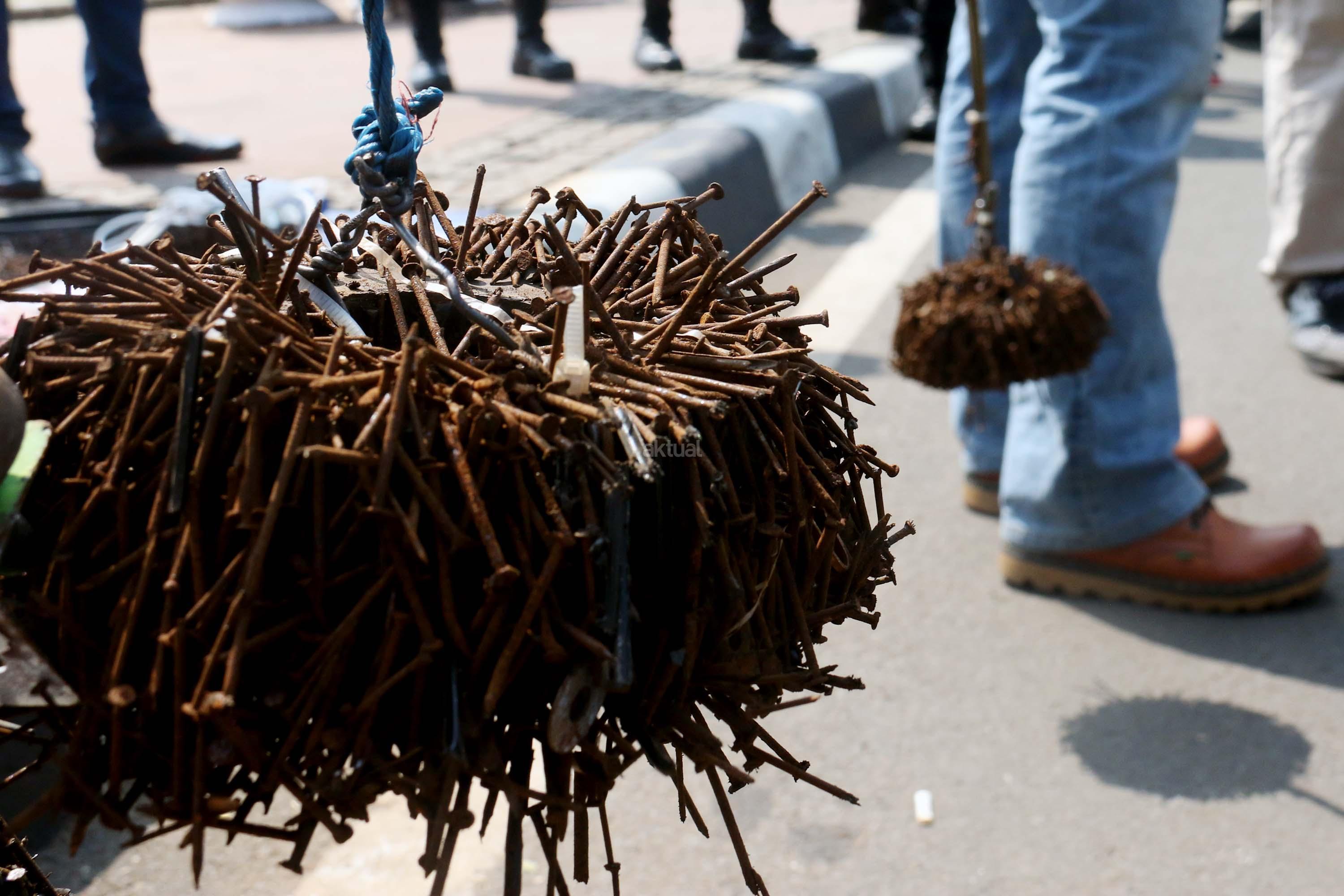 Sejumlah driver ojek online yang tergabung dalam Komunitas Gerakan Bersih Ranjau Paku (GBRP) melakukan aksi unjuk rasa di depan bundaran patung kuda, Jakarta, Senin (31/7/2017). Dalam aksinya para driver ojek online mendesak pihak pemerintah ataupun penegak hukum untuk mengusut tuntas pelaku ranjau paku. AKTUAL/Munzir