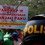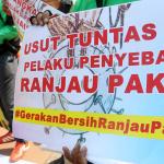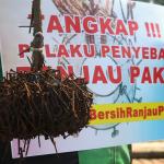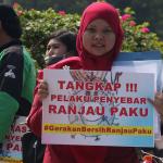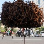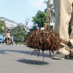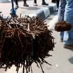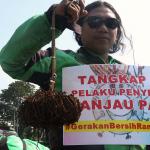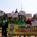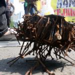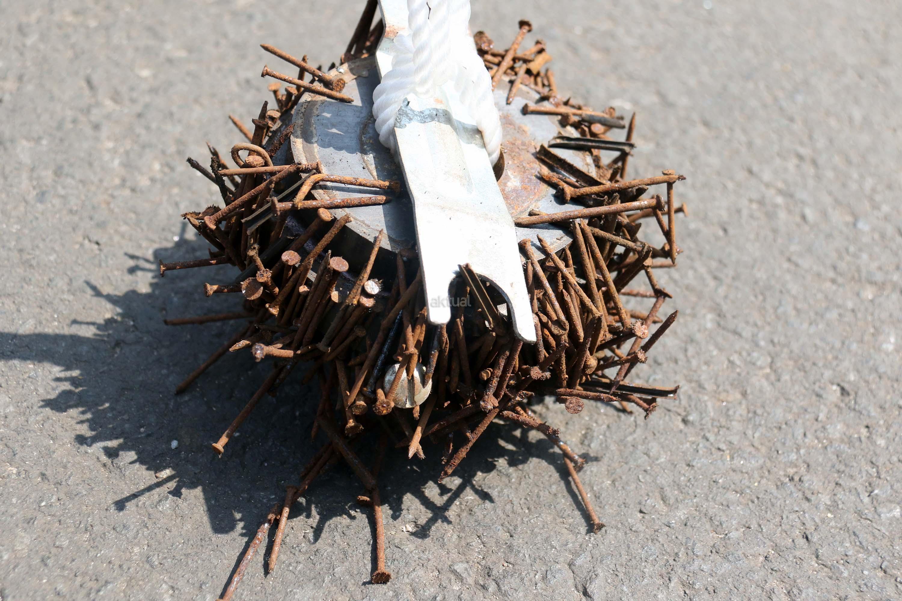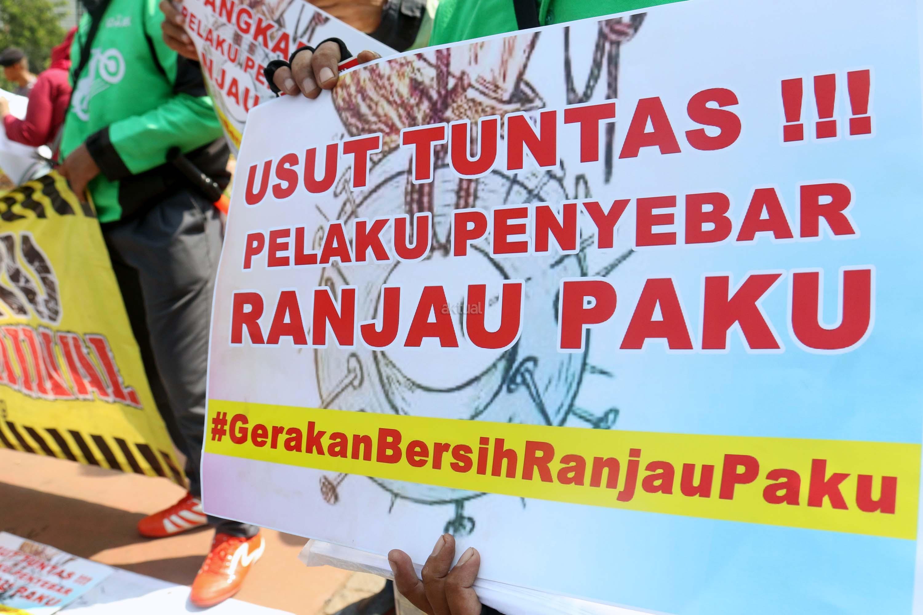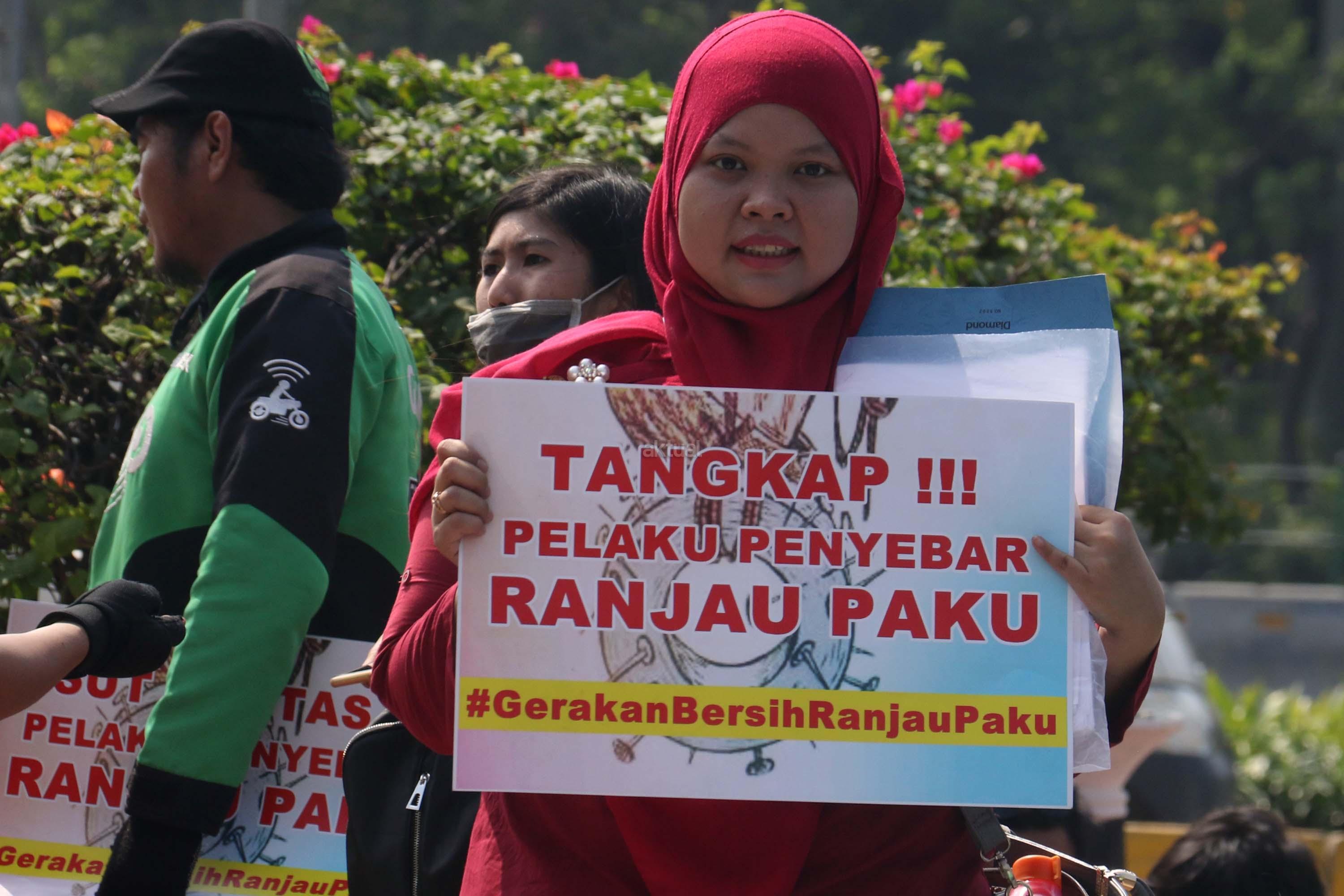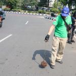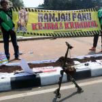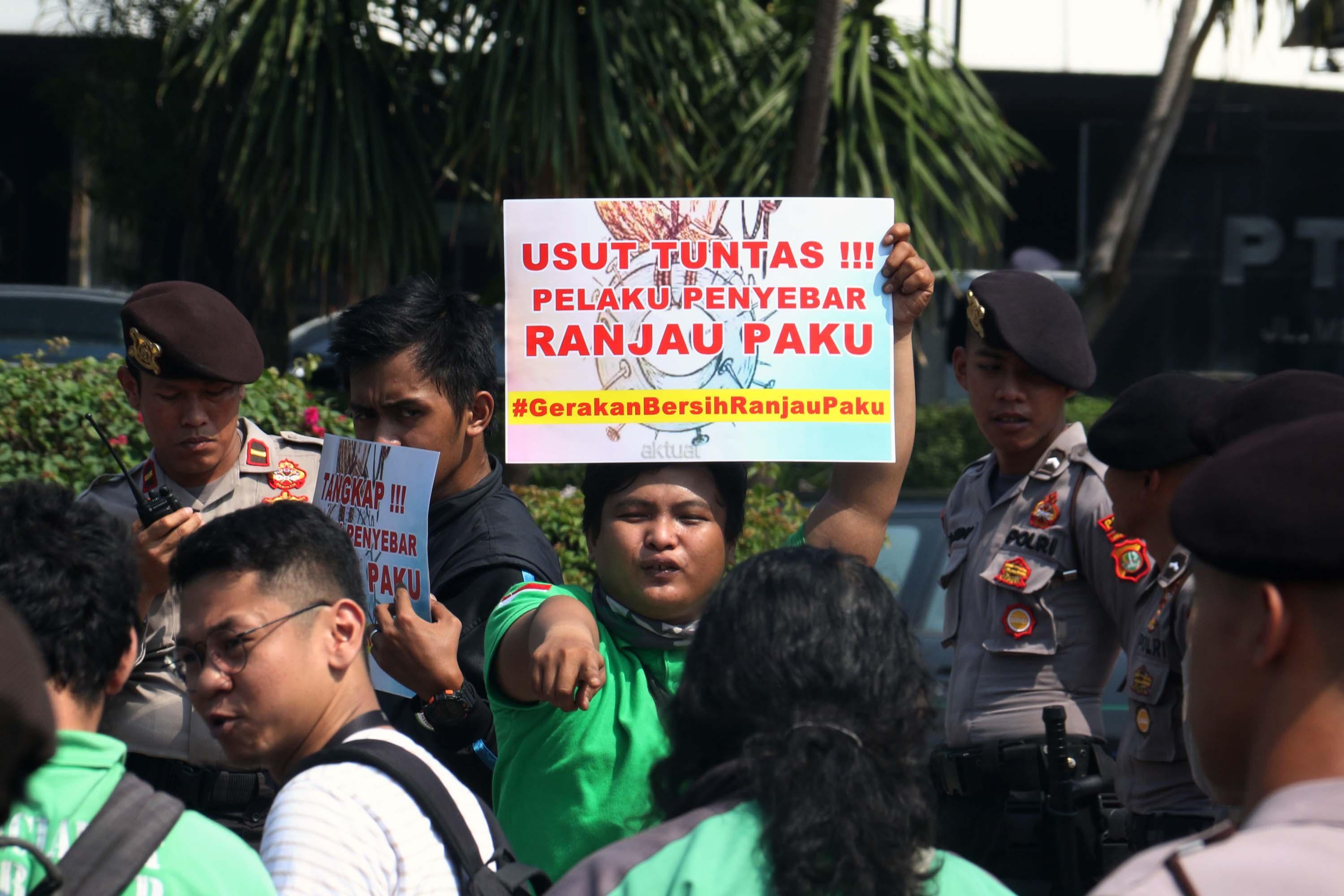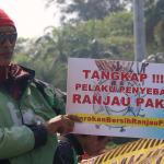Sejumlah driver ojek online yang tergabung dalam Komunitas Gerakan Bersih Ranjau Paku (GBRP) melakukan aksi unjuk rasa di depan bundaran patung kuda, Jakarta, Senin (31/7/2017). Dalam aksinya para driver ojek online mendesak pihak pemerintah ataupun penegak hukum untuk mengusut tuntas pelaku ranjau paku. AKTUAL/Munzir