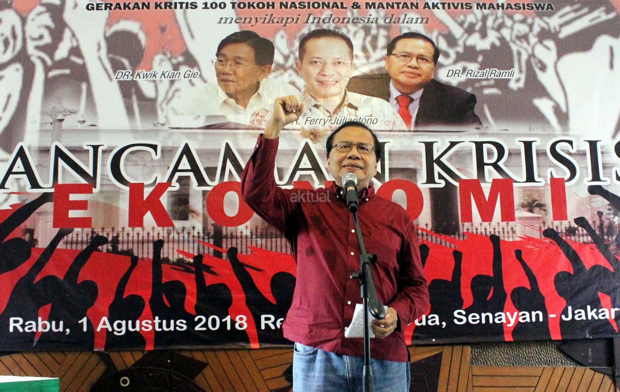 Ekonom yang juga mantan Menko Kemaritiman Rizal Ramli saat berpidato dalam acara Gerakan kritis 100 tokoh dan mantan aktivis mahasiswa di Jakarta, Rabu (1/8/2018). Acara Gerakan Kritis 100 tokoh dan mantan aktivis mahasiswa yang dihadiri ratusan aktivis dan undangan mengambil tema “Ancaman Krisis Ekonomi. AKTUAL/Tino Oktaviano