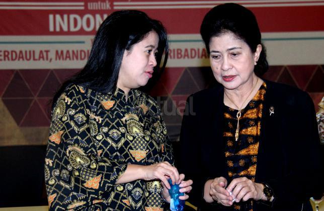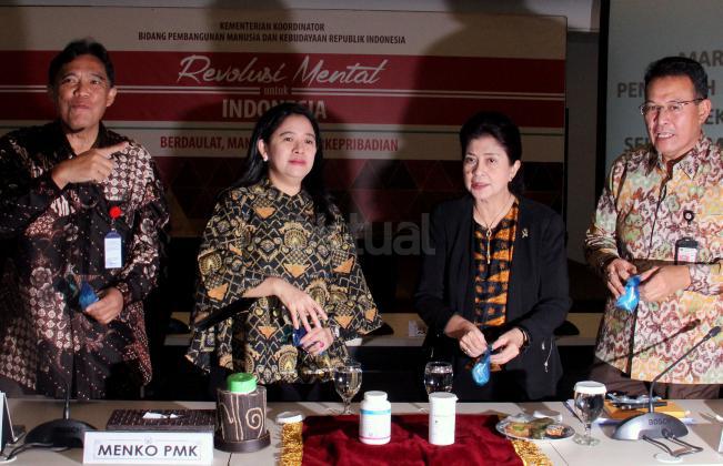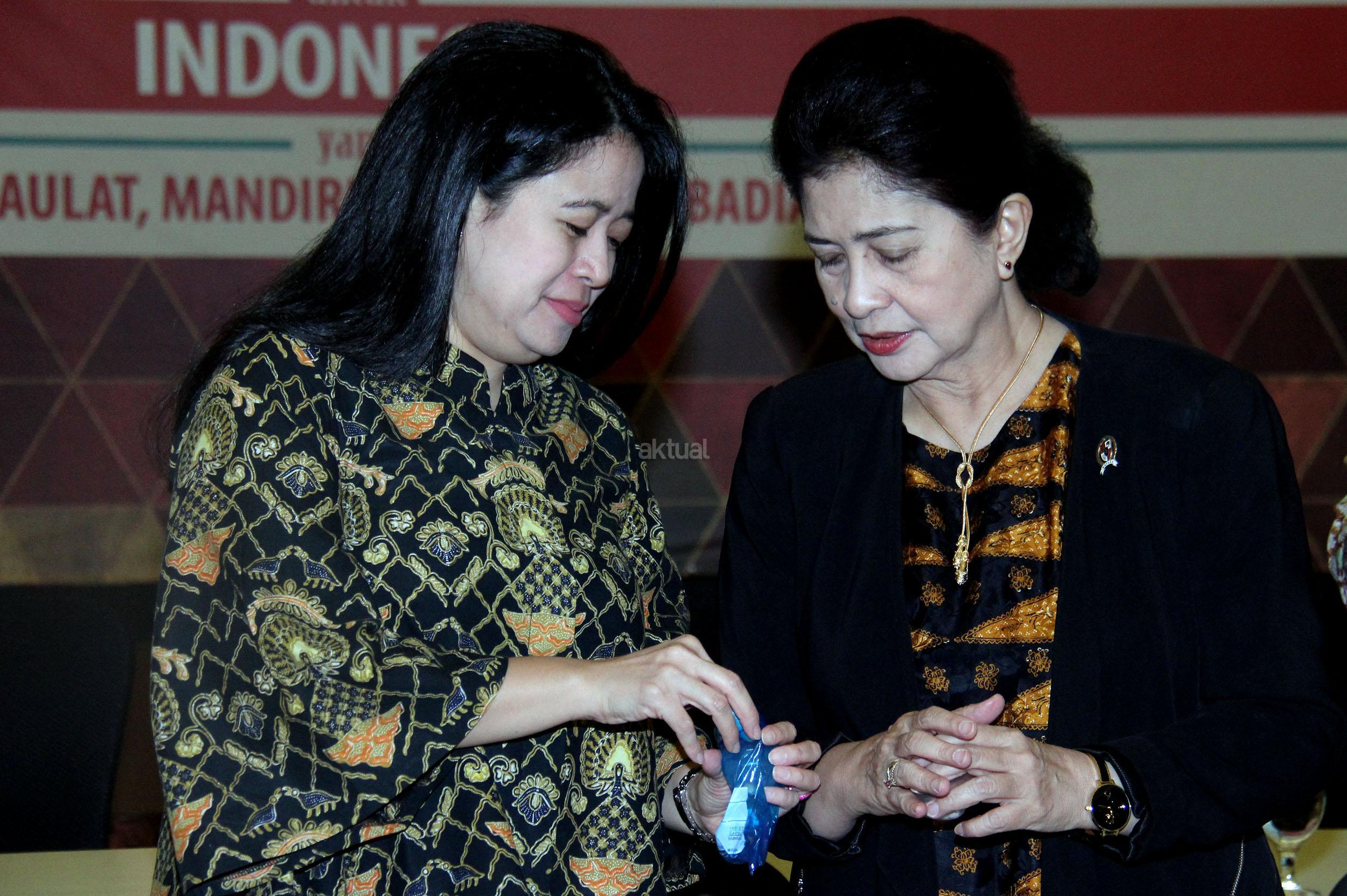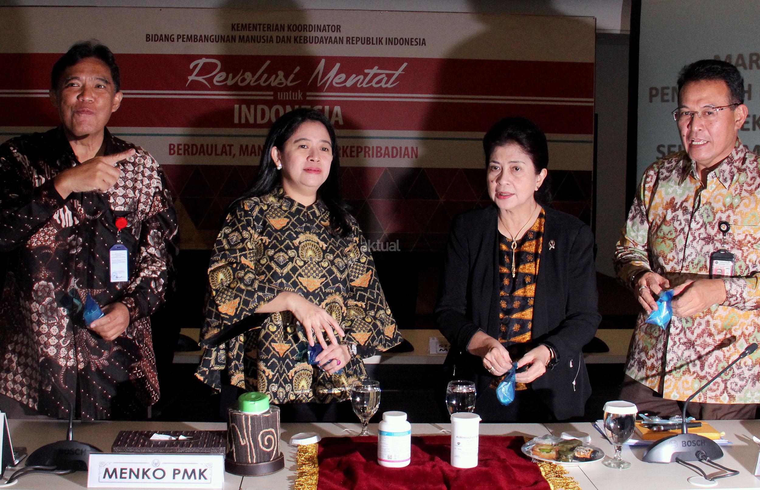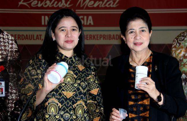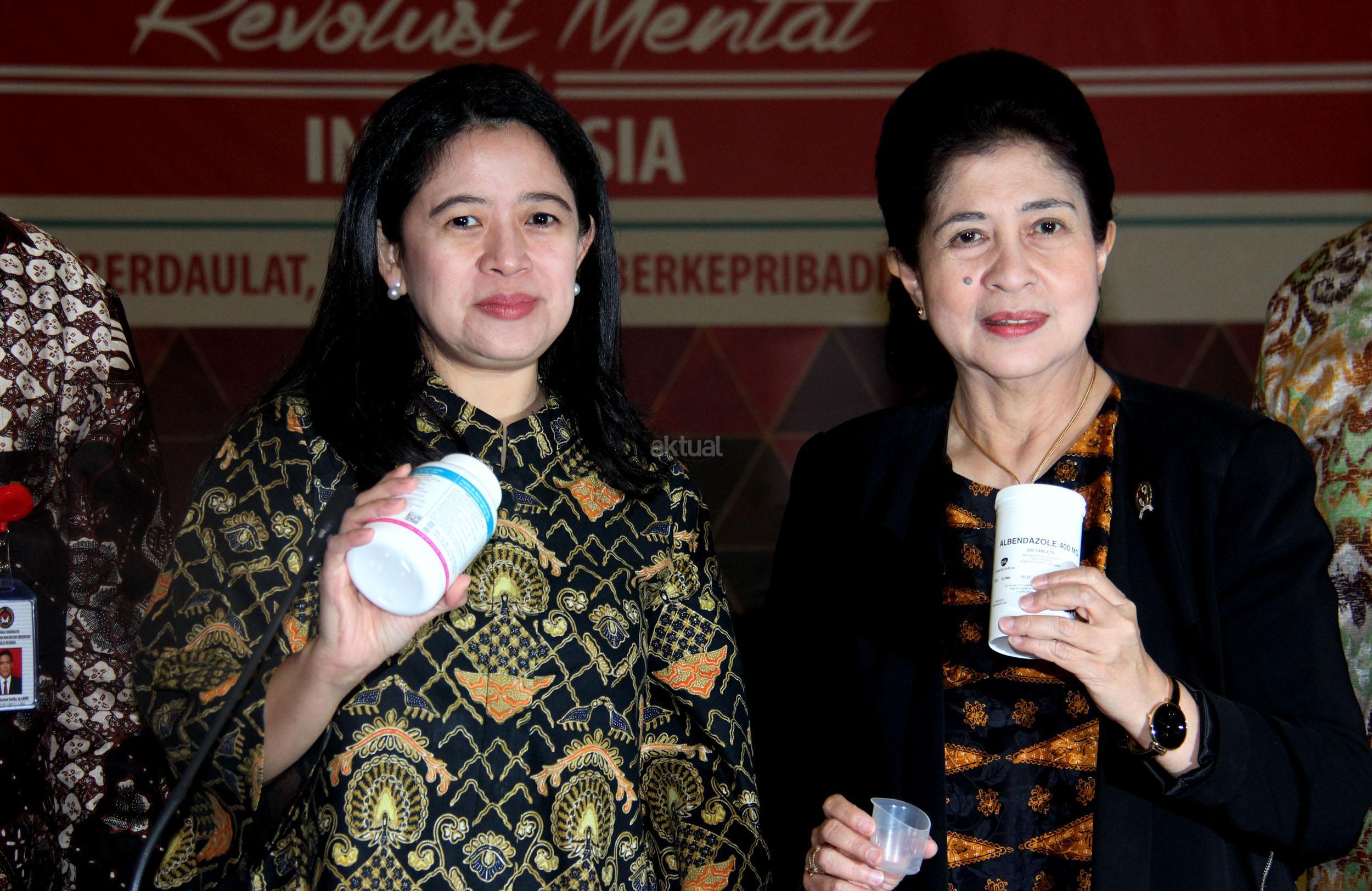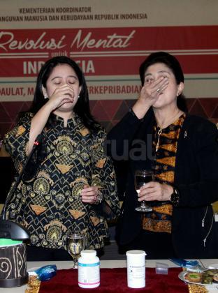 Menteri Koordinator bidang Pembangunan Manusia dan Kebudayaan, Puan Maharani bersama Menteri Kesehatan, Nila Djuwita F. Moeloek meminum obat pencegah infeksi kaki gajah, usai menggelar rapat koordinasi tingkat menteri terkait Bulan Eliminasi Kaki Gajah di kantor Kemenko PMK, Jakarta, Jumat (7/8/2015). Melalui Gerakan Eliminasi Kaki Gajah, pemerintah mencanangkan tahun 2020 dapat menurunkan jumlah kasus baru filariasis hingga kurang dari 1 persen. Saat ini, diperkirakan infeksi kaki gajah masih menjangkiti 105 juta penduduk di 5 provinsi dan 241 kabupaten dan kotamadya seluruh Indonesia.