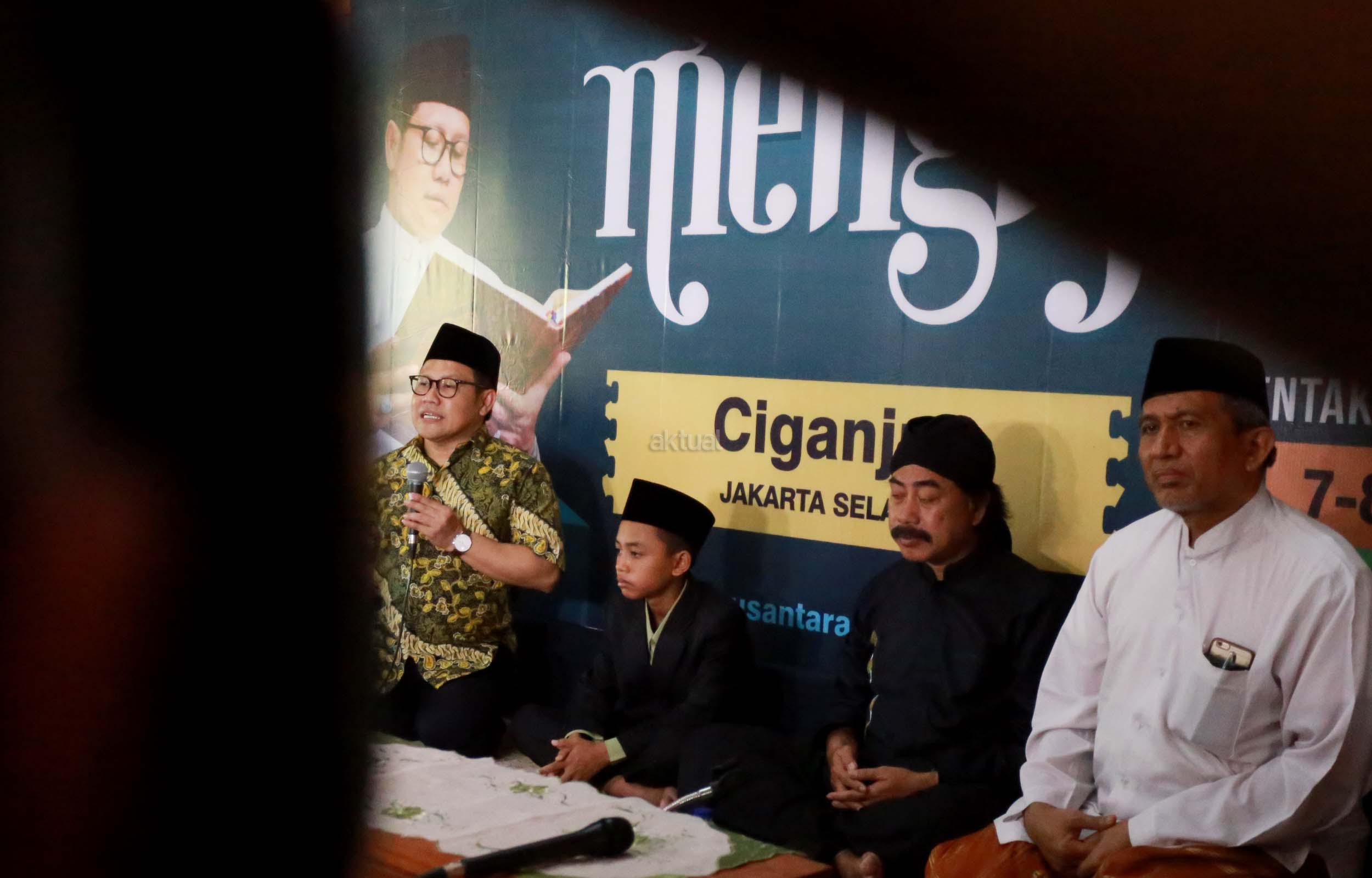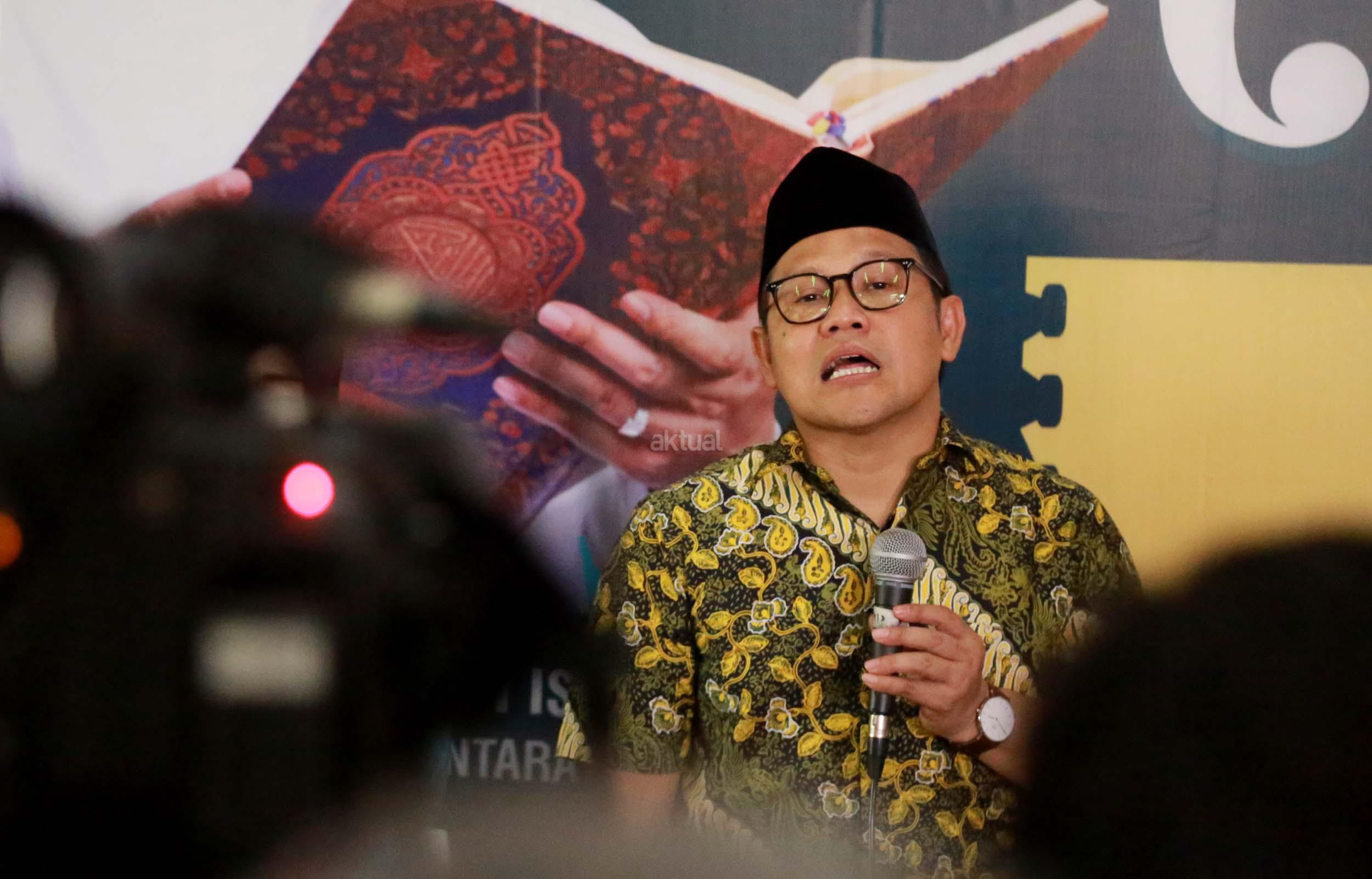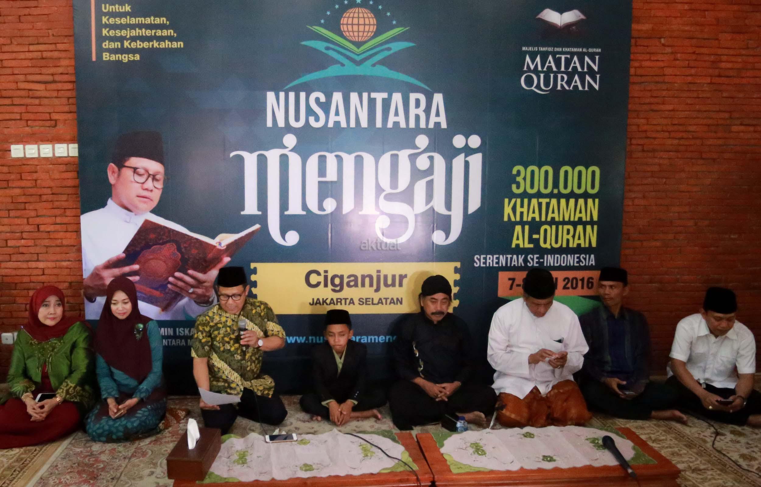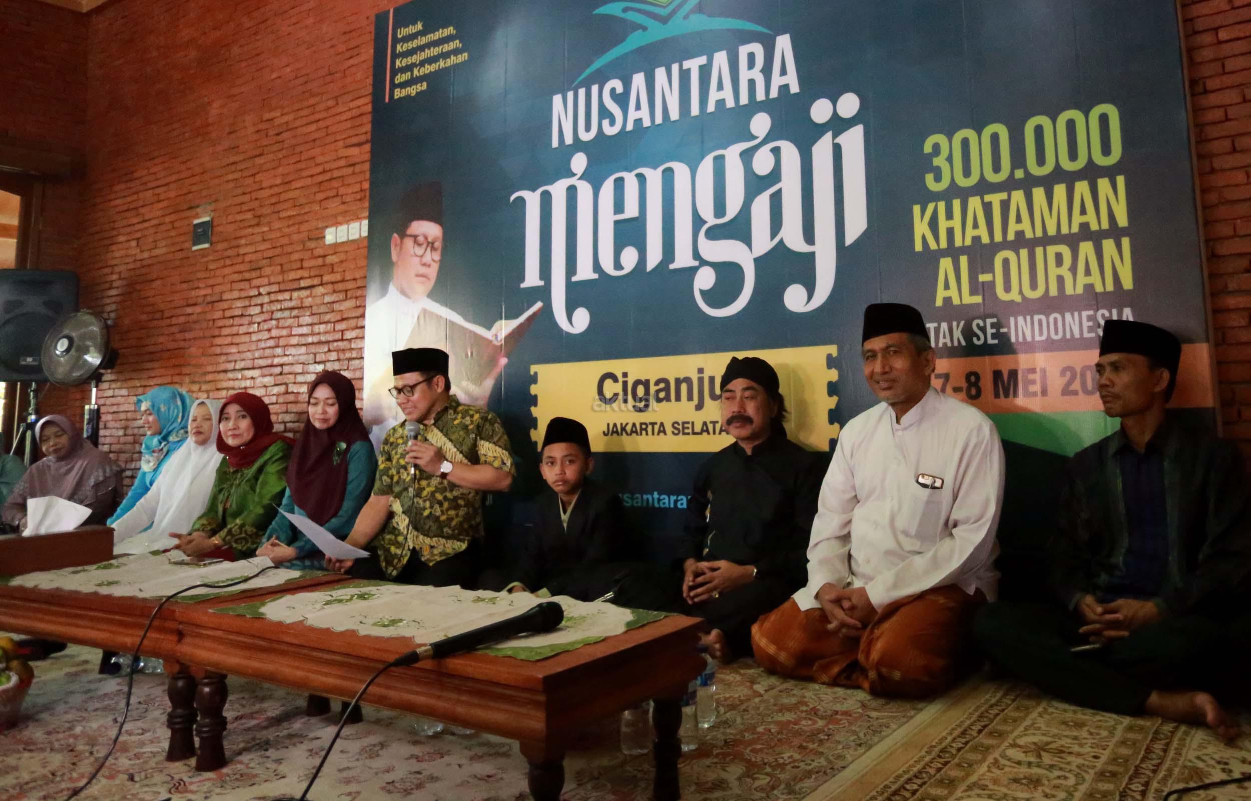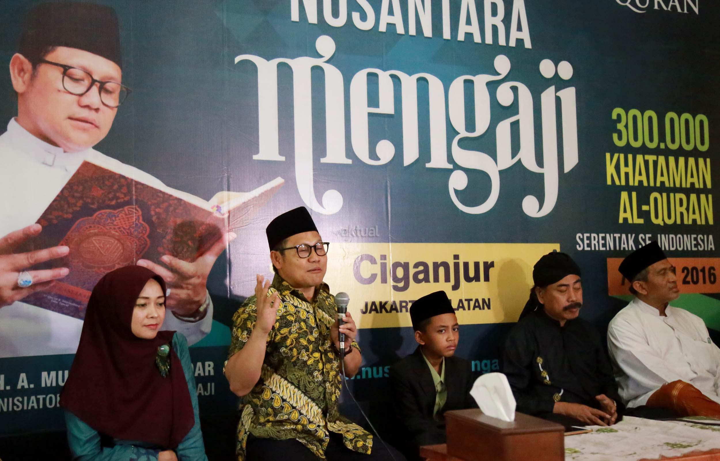Inisiator Nusantara Mengaji Muhaimin Iskandar berbicara saat menggelar konferensi pers di Jakarta, Jumat (5/5/2016). Gerakan Nusantara Mengaji akan menyelenggarakan 300.000 khataman Al Quran pada tanggal 7-8 Mei 2016, sampai hari ini telah tercatat 313.339 khataman Al Quran yang akan dibaca di 67.183 lokasi di 401 Kabupaten/Kota dari 34 provinsi se-Indonesia.