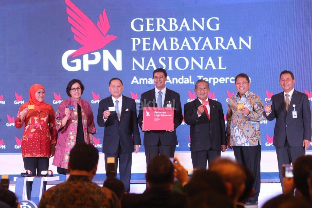 Gubernur Bank Indonesia Agus Martowardojo (ketiga kiri) didampingi Ketua Asosiasi Sistem Pembayaran Indonesia (ASPI) Anggoro Eko Cahyo (tengah), berfoto bersama Menteri Kordinator Bidang Perekonomian RI Darmin nasution (ketiga kanan), Menteri Keuangan RI Sri Mulyani Indrawati (kedua kiri), Menteri Komunikasi dan Informatika RI Rudiantara (kedua kanan), Menteri Sosial RI Khofifah Indar Parawansa (kiri) dan Deputi Bidang Usaha Jasa Keuangan, Jasa Survei dan Konsultan, Kementerian BUMN RI Gatot Trihargo, usai peluncuran Gerbang Pembayaran Nasional di Jakarta, Senin (4/11/2017). Gerbang Pembayaran Nasional diluncurkan dalam rangka memastikan terselenggaranya pemrosesan seluruh transaksi pembayaran ritel domestik secara interkoneksi dan interoperabilitas yang aman, efisien, andal, dan lancar. AKTUAL/Eko S Hilman