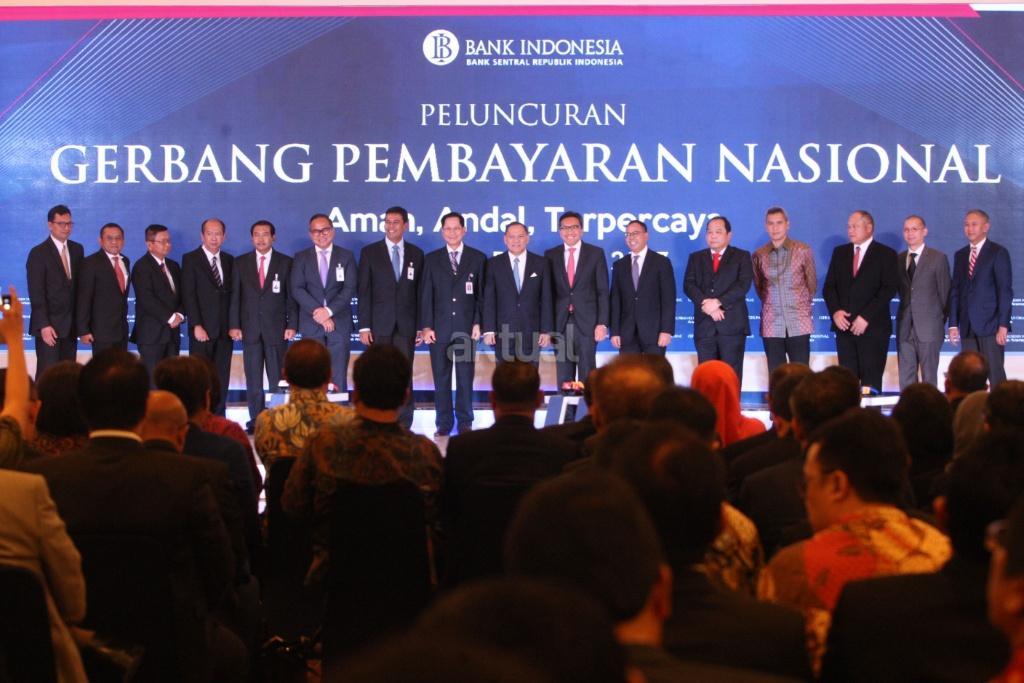 Pihak-pihak yang ikut mendukung Gerbang Pembayaran Nasioanl usai peluncuran program tersebut di Jakarta, Senin (4/11/2017). Gerbang Pembayaran Nasional diluncurkan dalam rangka memastikan terselenggaranya pemrosesan seluruh transaksi pembayaran ritel domestik secara interkoneksi dan interoperabilitas yang aman, efisien, andal, dan lancar. AKTUAL/Eko S Hilman