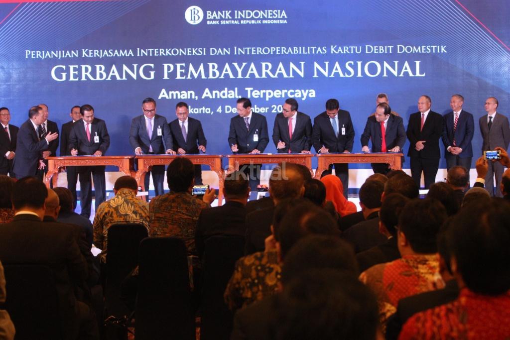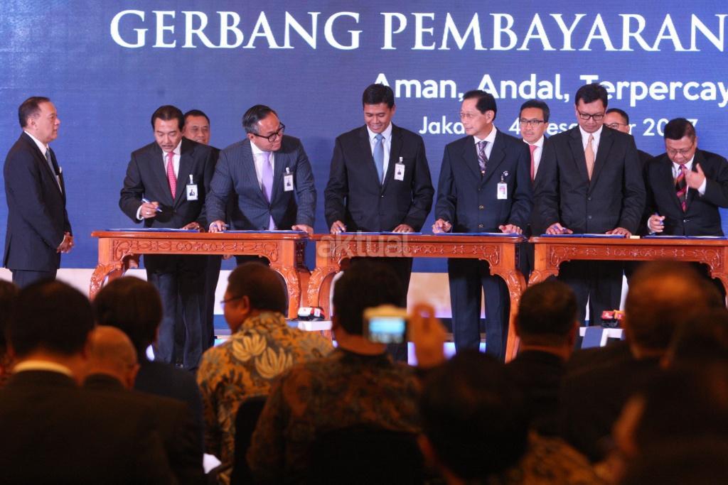 Gubernur Bank Indonesia Agus Martowardojo menyaksikan penandatanganan Perjanjian Kerja Sama Interkoneksi dan Interoperabilitas Kartu Debit Domestik oleh, dari kiri ke kanan, Direktur Utama PT Bank Rakyat Indonesia Tbk (BRI) Suprajarto, Direktur Utama PT Bank Mandiri Tbk Kartika Wirjoatmodjo, Direktur Utama PT Bank Negara Indonesia Tbk (BNI) Ahmad Baiquni, Presiden Direktur PT Bank Central Asia Tbk (BCA) Jahja Setiaatmadja, Presiden Direktur PT CIMB Niaga Tbk Tigor M. Siahaan, Presiden Direktur PT Bank Permata Tbk Ridha M Wirakusumah, dan Direktur Utama PT Bank Artha Graha Andy Kasih dalam rangka Peluncuran Gerbang Pembayaran Nasional di Jakarta, Senin (4/12/2017). Gerbang Pembayaran Nasional diluncurkan dalam rangka memastikan terselenggaranya pemrosesan seluruh transaksi pembayaran ritel domestik secara interkoneksi dan interoperabilitas yang aman, efisien, andal, dan lancar. AKTUAL/Eko S Hilman