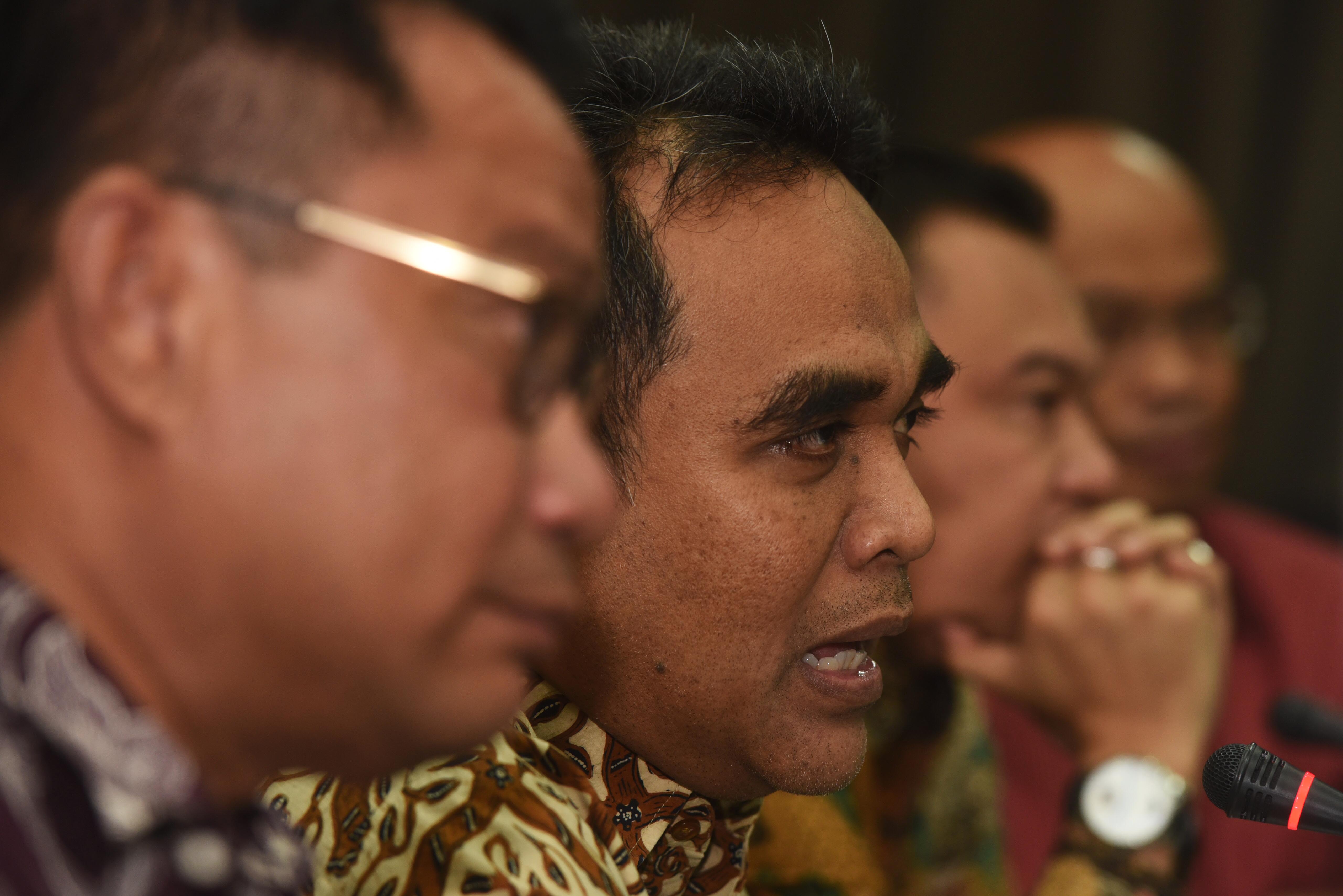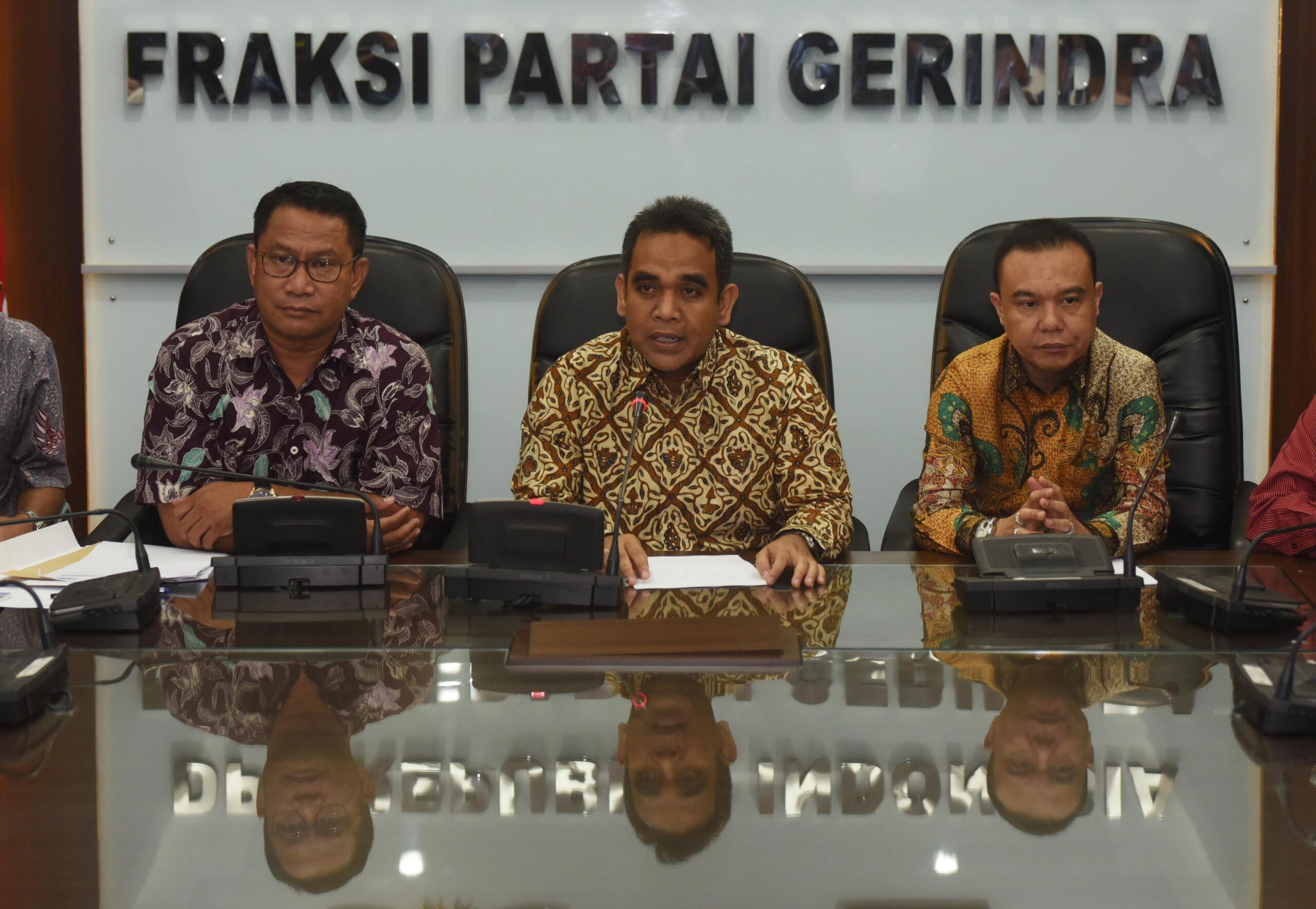 Ketua Fraksi Partai Gerindra Ahmad Muzani (tengah) didampingi Sekretaris Fraksi Fery Djami Francis (kiri) dan Anggota Sufmi Dasco Ahmad memberikan keterangan pers terkait kelanjutan Koalisi Merah Putih di Kompleks Parlemen Senayan, Jakarta, Kamis (19/5). Gerindra menyatakan akan tetap menjadi oposisi pemerintah meskipun telah ditinggalkan anggota-anggota KMP. ANTARA FOTO/Akbar Nugroho Gumay/aww/16.