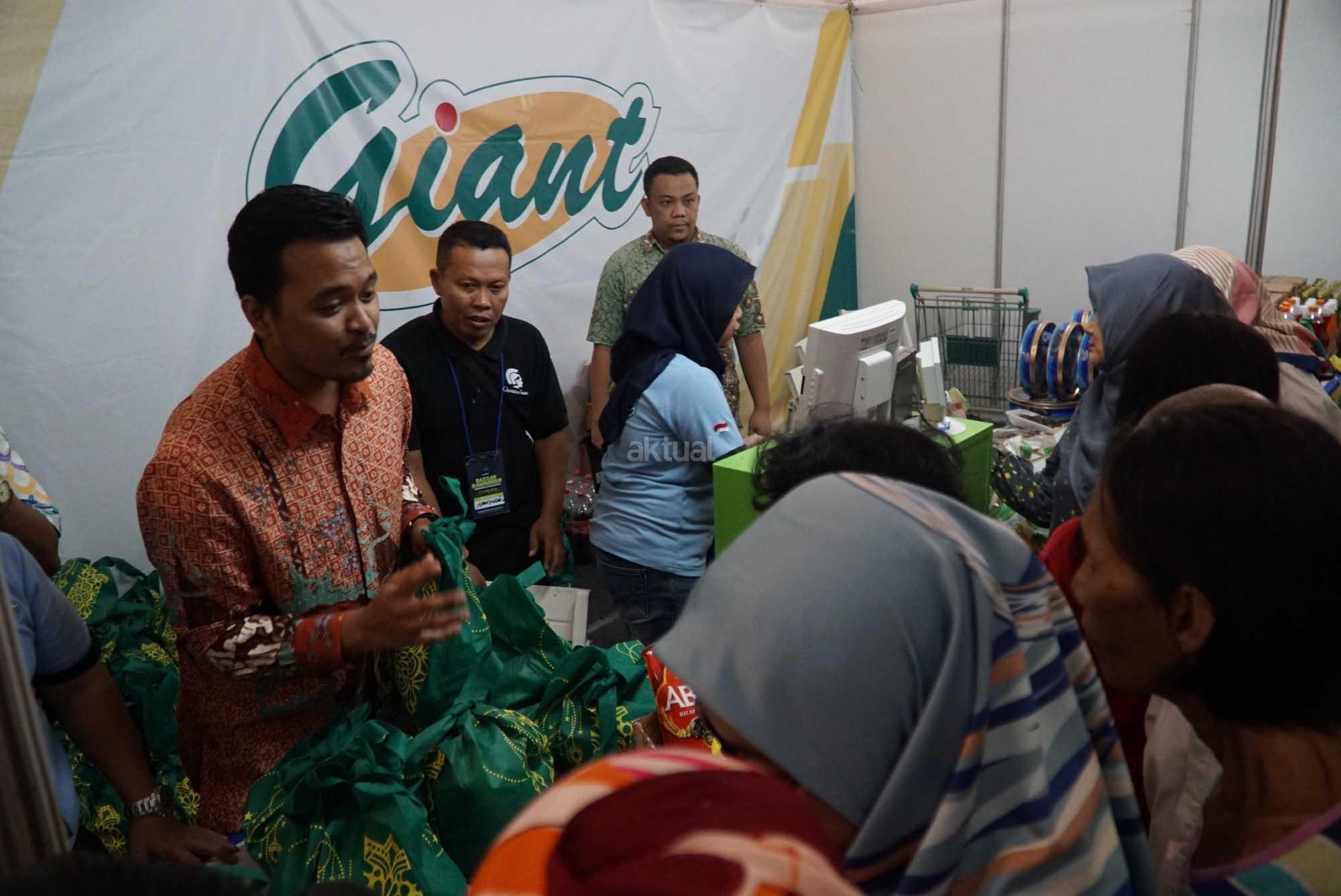 Manager CSR Giant, Arya Kusumo sedang melakukan penjualan perdana Paket Sembako Murah Giant pada acara Bazar Ramadan 2018 di Kementerian Perdagangan, Jakarta Pusat. Giant menyediakan 2000 paket sembako murah seharga Rp 20.000 selama bazar berlangsung dari tanggal 4-7 Juni 2018. AKTUAL/Eko S Hilman