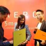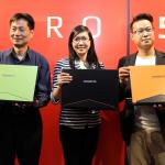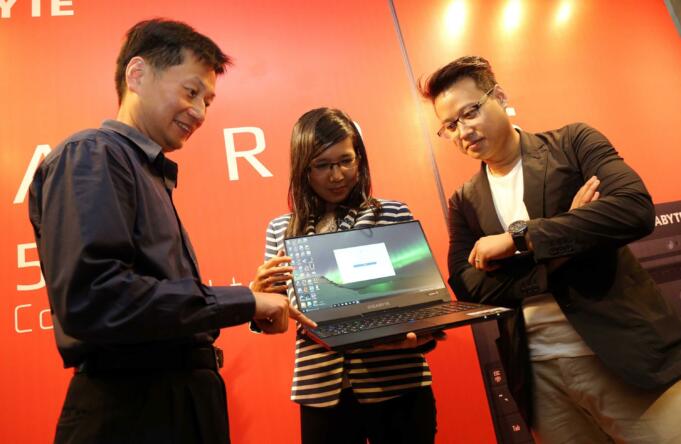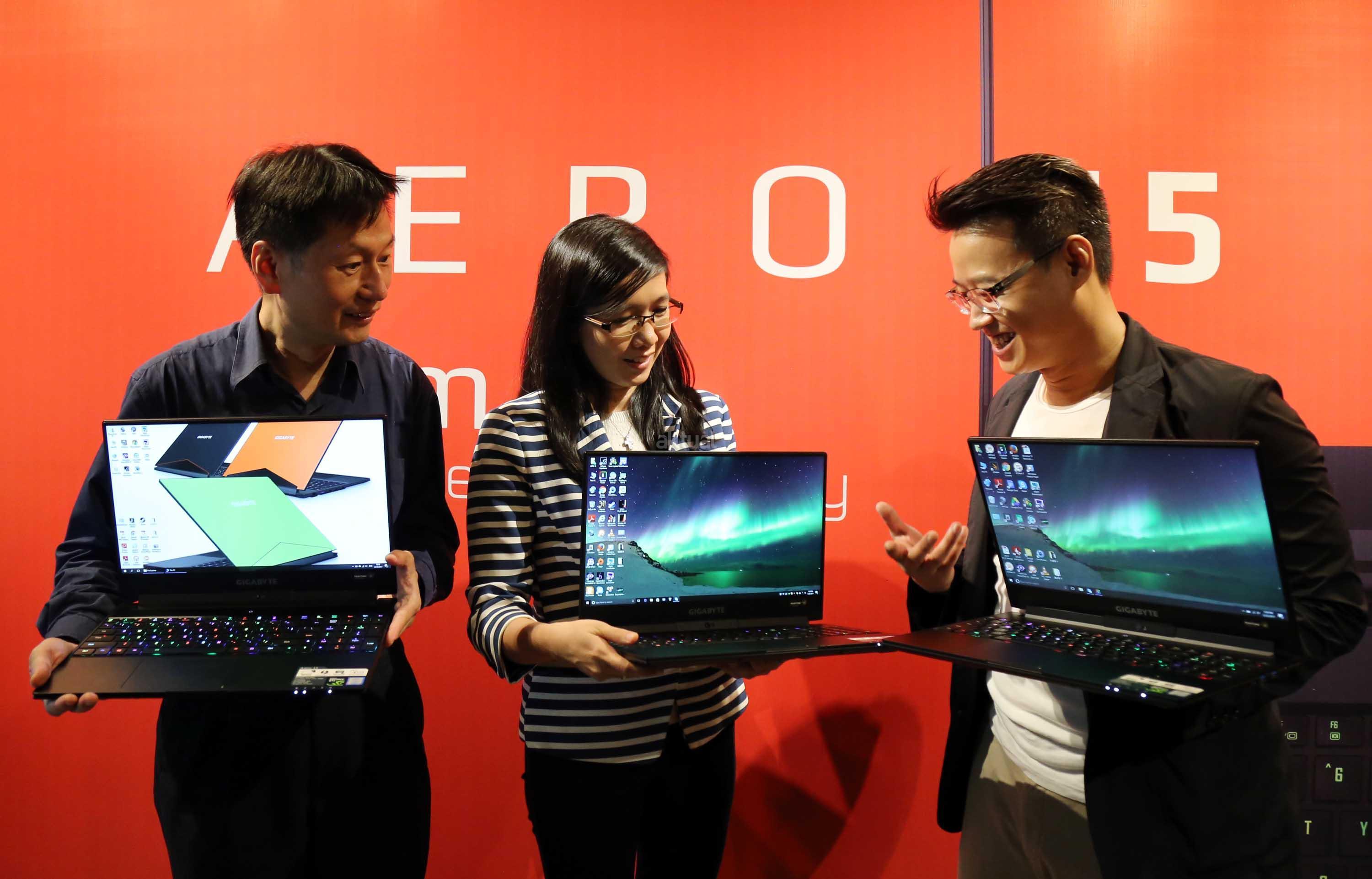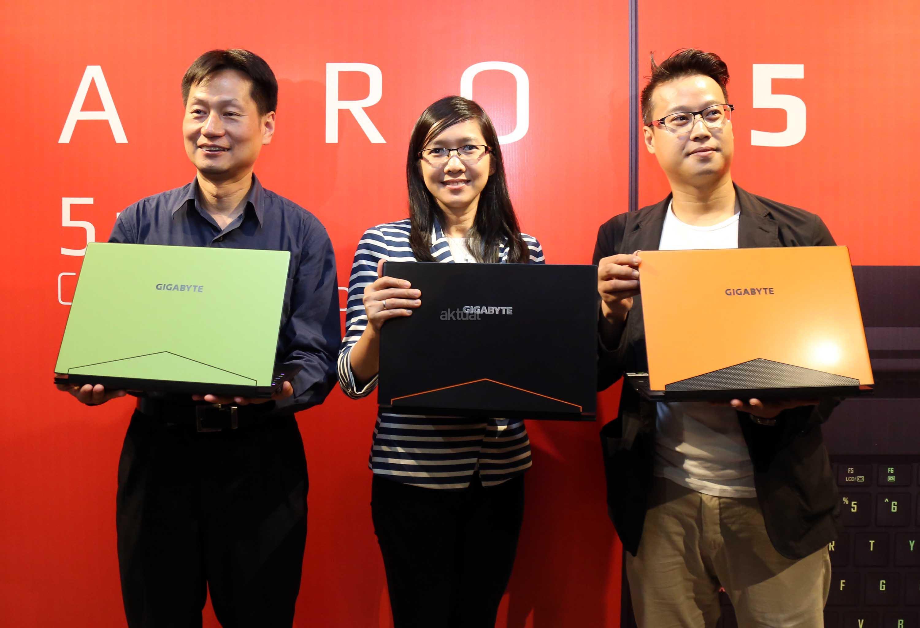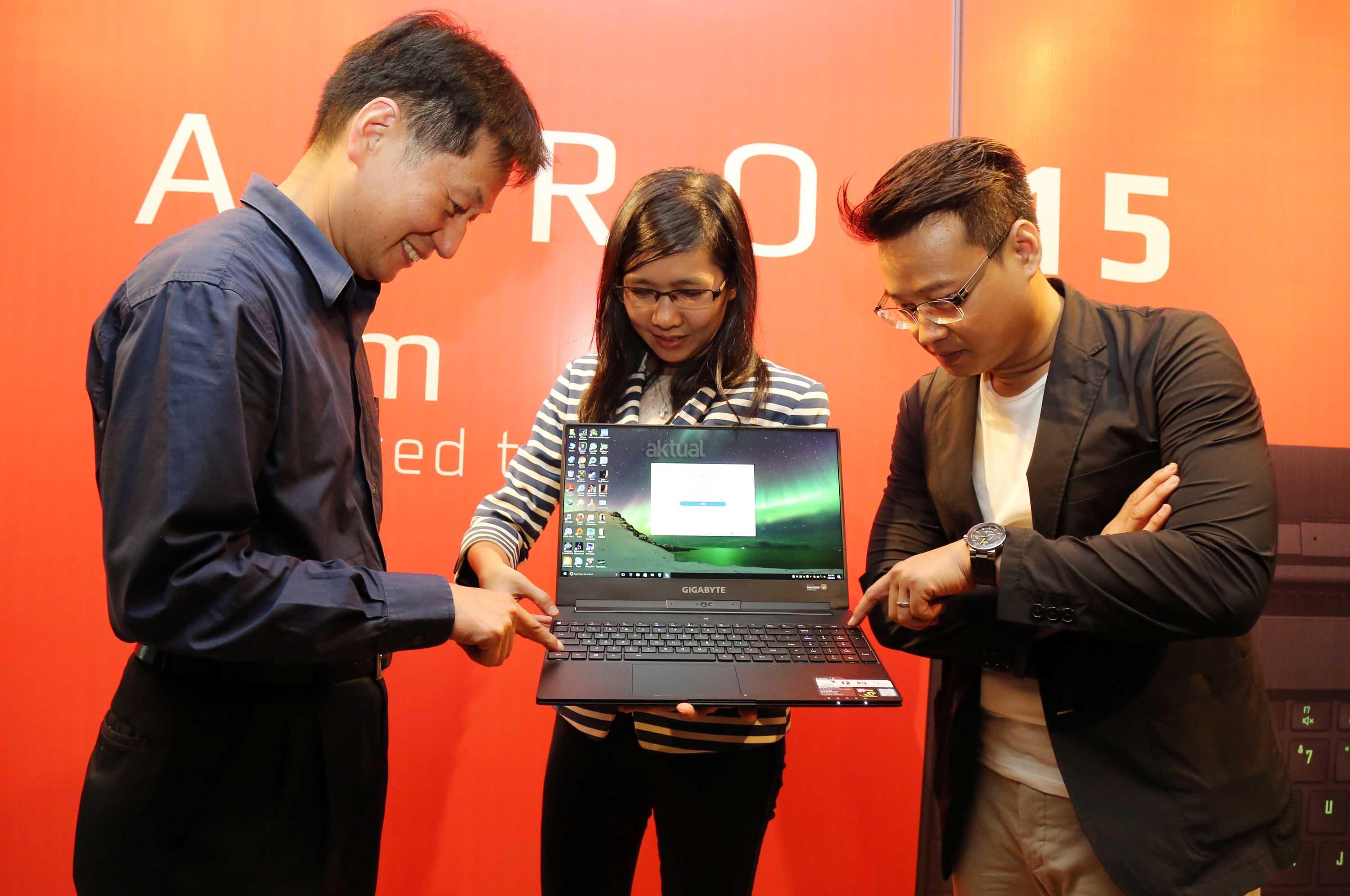 Director Gigabyte Lambert Tai (kiri), SMI Representative Gigabyte Yuyun Novita (tengah) dan Country Manager Gigabyte Indonesia Jason Wu (kanan) memperlihatkan laptop gaming terbaru Aero15 di Jakarta, Senin (22/5/2017). Gigabyte Technology asal Taiwan memperkenalkan laptop gaming terbaru, Aero15 bagi para profesional dan gamer di Indonesia. Perangkat baru ini dipersenjatai dengan sistem operasi Windows 10, prosesor teranyar Intel® Core i7 Generation ke-7 Kabylake, dan kartu grafis NVIDIA GeForce GTX 1060 GDDR5 6 GB. Aero 15 membidik segmen profesional, enthusiast dan gamer dengan bezel tertipis. AKTUAL/Tino Oktaviano