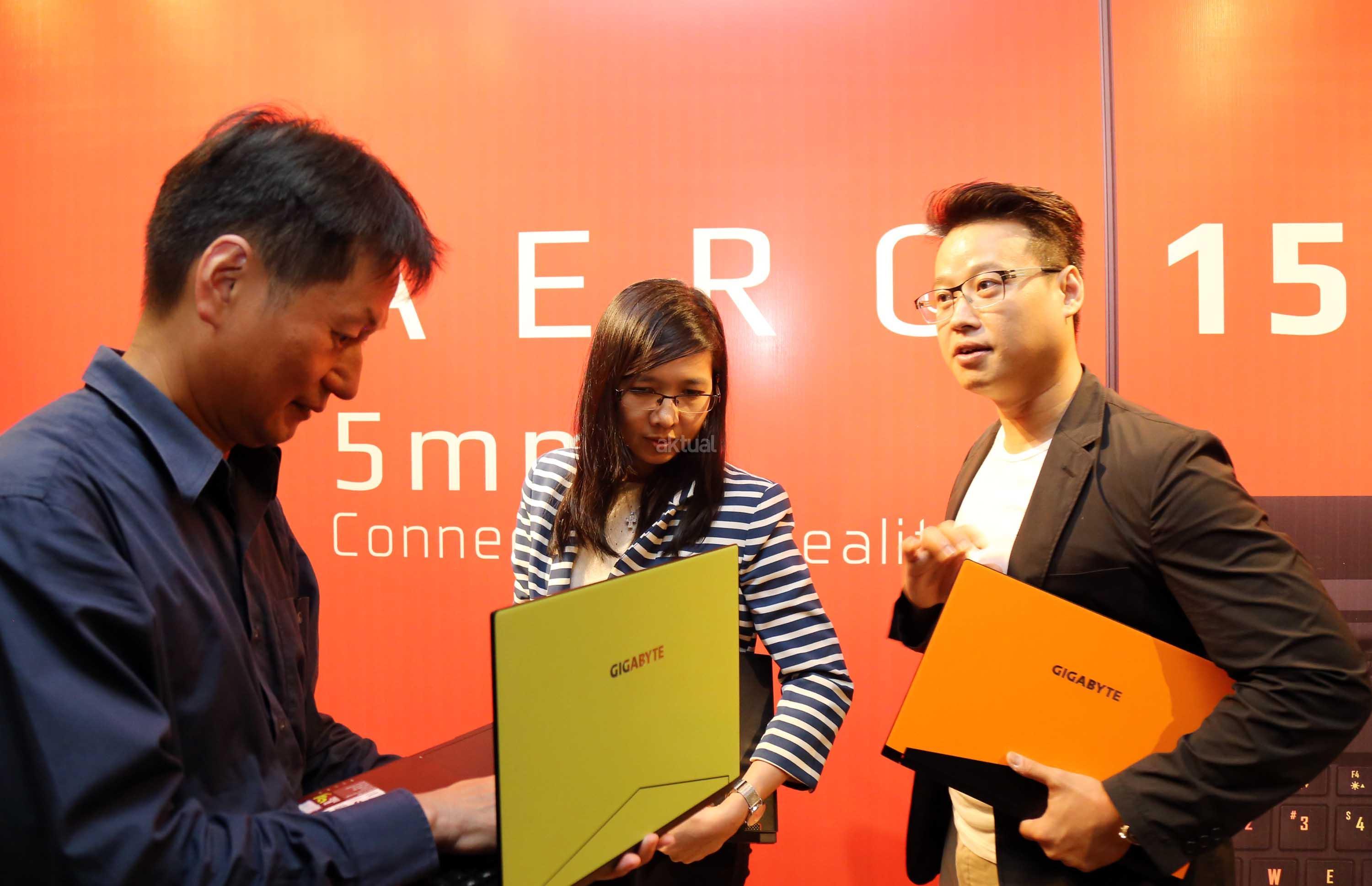 Director Gigabyte Lambert Tai (kiri), SMI Representative Gigabyte Yuyun Novita (tengah) dan Country Manager Gigabyte Indonesia Jason Wu (kanan) berbincang saat peluncuran laptop gaming terbaru Aero15 di Jakarta, Senin (22/5/2017). Gigabyte Technology asal Taiwan memperkenalkan laptop gaming terbaru, Aero15 bagi para profesional dan gamer di Indonesia. Perangkat baru ini dipersenjatai dengan sistem operasi Windows 10, prosesor teranyar Intel® Core i7 Generation ke-7 Kabylake, dan kartu grafis NVIDIA GeForce GTX 1060 GDDR5 6 GB. Aero 15 membidik segmen profesional, enthusiast dan gamer dengan bezel tertipis. AKTUAL/Tino Oktaviano