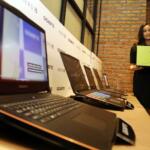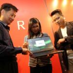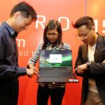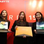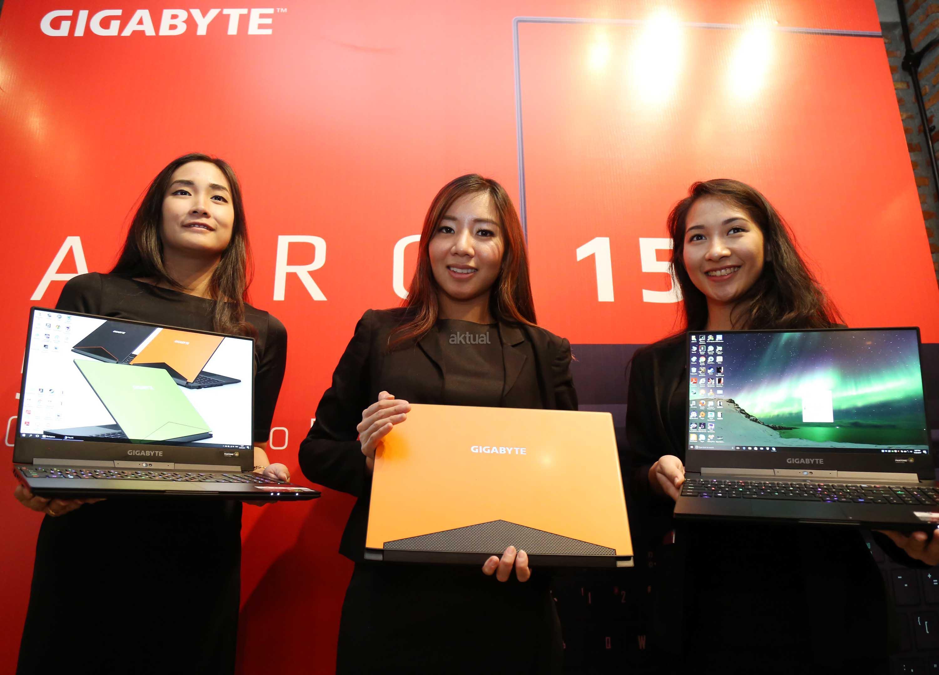 Tiga orang model memperlihatkan laptop gaming terbaru Aero15 di Jakarta, Senin (22/5/2017). Gigabyte Technology asal Taiwan memperkenalkan laptop gaming terbaru, Aero15 bagi para profesional dan gamer di Indonesia. Perangkat baru ini dipersenjatai dengan sistem operasi Windows 10, prosesor teranyar Intel® Core i7 Generation ke-7 Kabylake, dan kartu grafis NVIDIA GeForce GTX 1060 GDDR5 6 GB. Aero 15 membidik segmen profesional, enthusiast dan gamer dengan bezel tertipis. AKTUAL/Tino Oktaviano