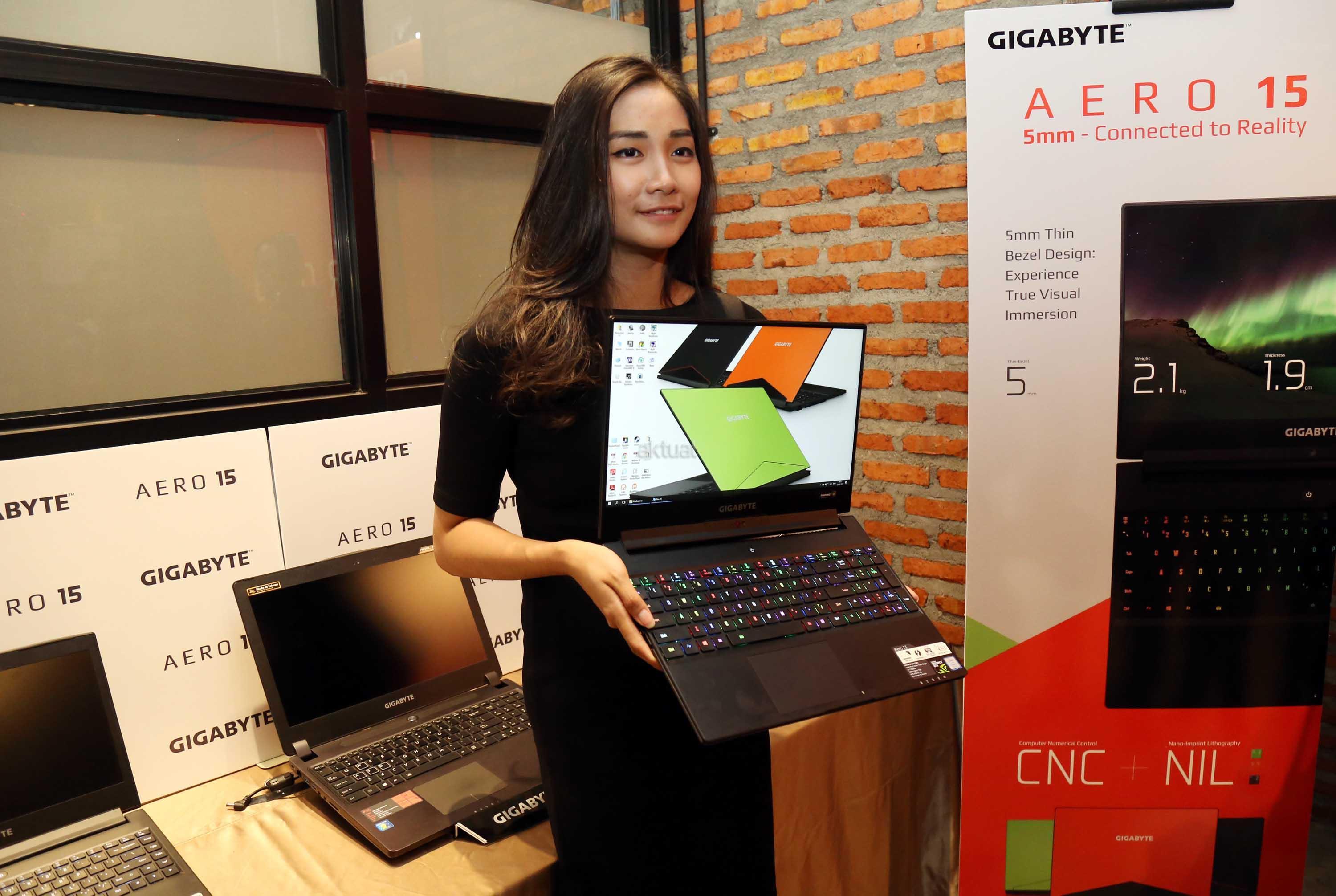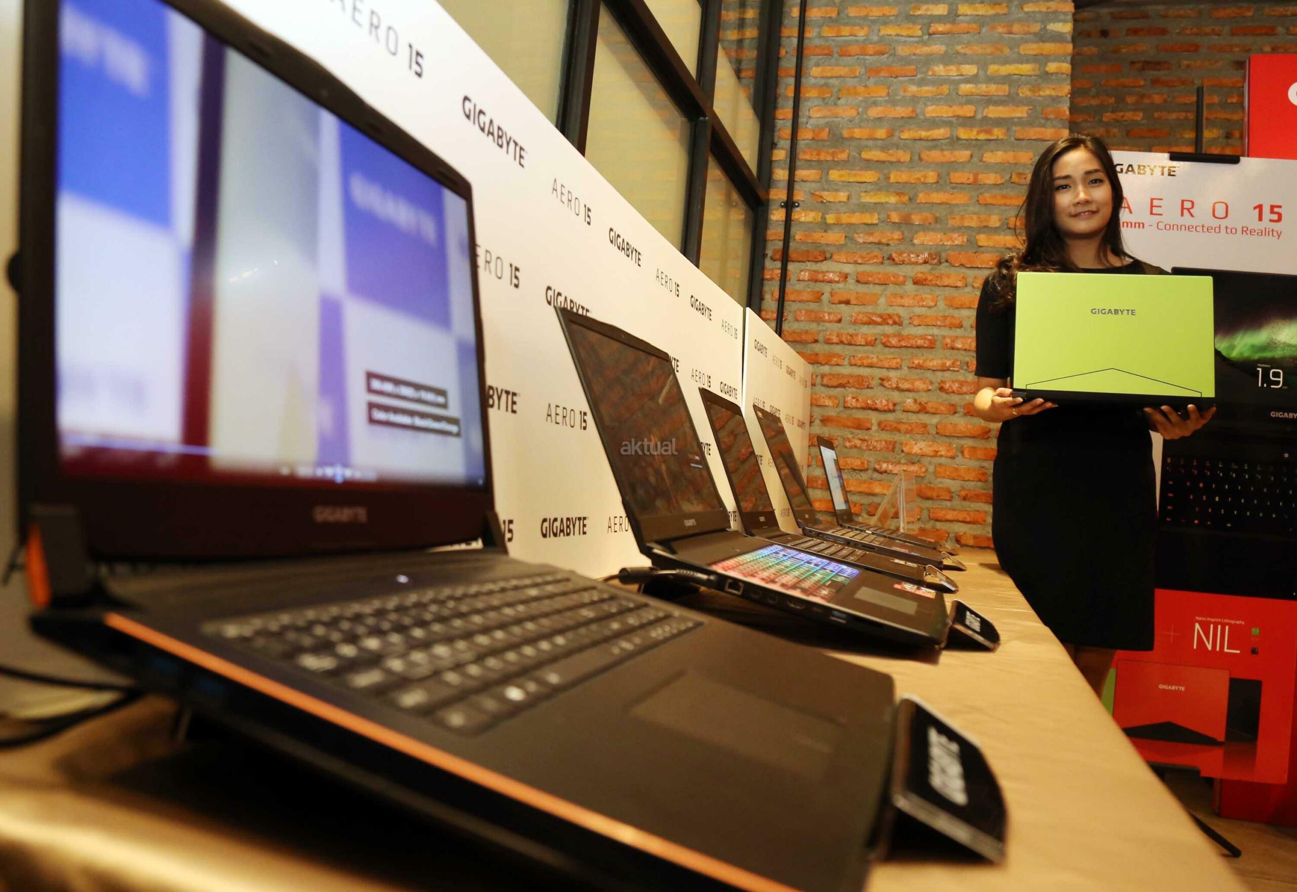 Seorang model memperlihatkan laptop gaming terbaru Aero15 di Jakarta, Senin (22/5/2017). Gigabyte Technology asal Taiwan memperkenalkan laptop gaming terbaru, Aero15 bagi para profesional dan gamer di Indonesia. Perangkat baru ini dipersenjatai dengan sistem operasi Windows 10, prosesor teranyar Intel® Core i7 Generation ke-7 Kabylake, dan kartu grafis NVIDIA GeForce GTX 1060 GDDR5 6 GB. Aero 15 membidik segmen profesional, enthusiast dan gamer dengan bezel tertipis. AKTUAL/Tino Oktaviano