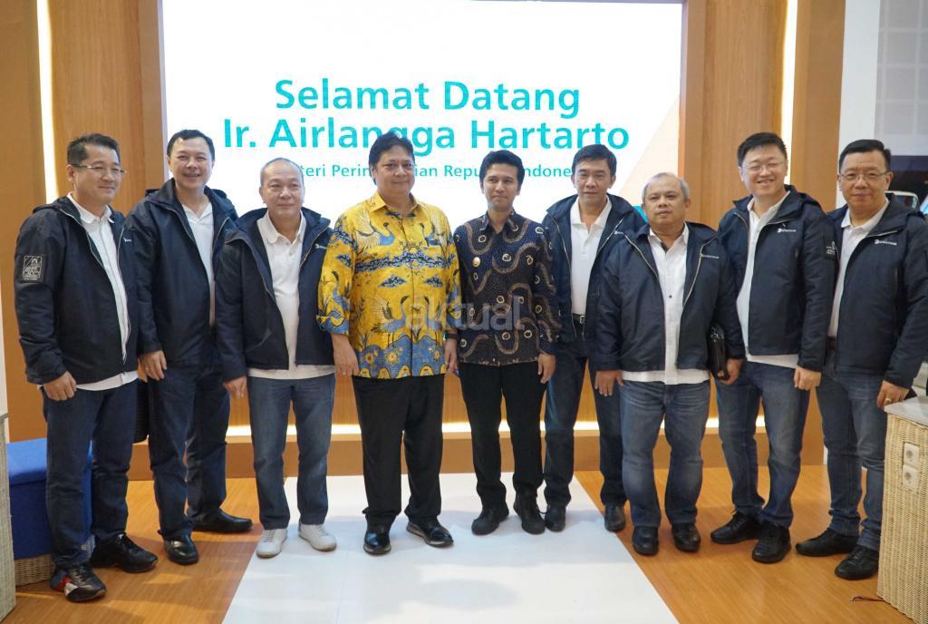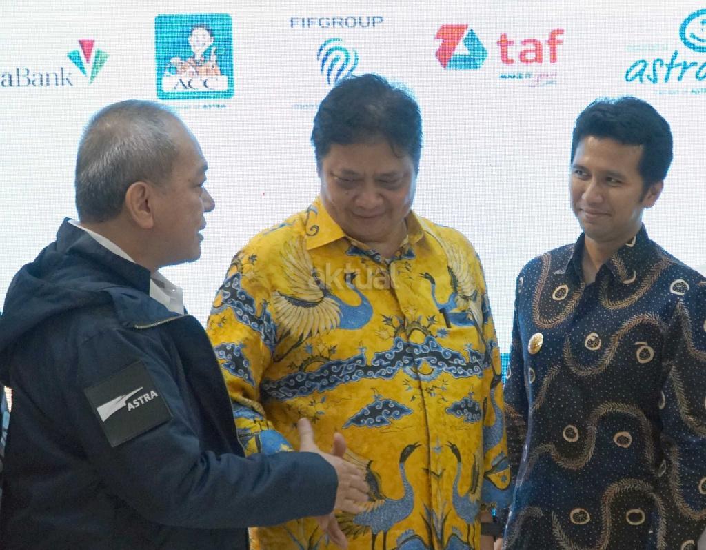Dari kiri ke kanan, Director In Charge Astra Financial Suparno Djasmin, Menteri Perindustruan Republik Indonesia Airlangga Hartarto dan Wakil Gubernur Jawa Timur Emil Dardak, berbincang di Booth Astra Financial di Gaikindo Indonesia International Auto Show (GIIAS) 2019, Surabaya, Jawa Timur, Jumat (29/3). AKTUAL/STR-Eko S Hilman
