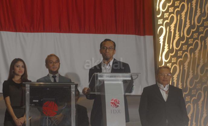 Vokalis Grup Band Nidji, Giring Ganesha (kedua dari kiri) bersama istrinya Cynthia Riza (kiri) dan Direktur Pengawasan Transaksi dan Kepatuhan Anggota Bursa Efek Indonesia (BEI) Hamdi Hassyabaini serta Direktur BEI, Chaerudin Berlian (kanan) memantau pergerakan IHSG saat membuka perdagangan saham di BEI, Jakarta, Selasa (23/2). Giring yang telah menjadi investor pasar modal sejak 2008 tersebut mengajak masyarakat untuk menjadi investor sebagai jaminan jangka panjang yang menguntungkan di masa depan. Aktual.com/Eko S Hilman
