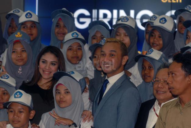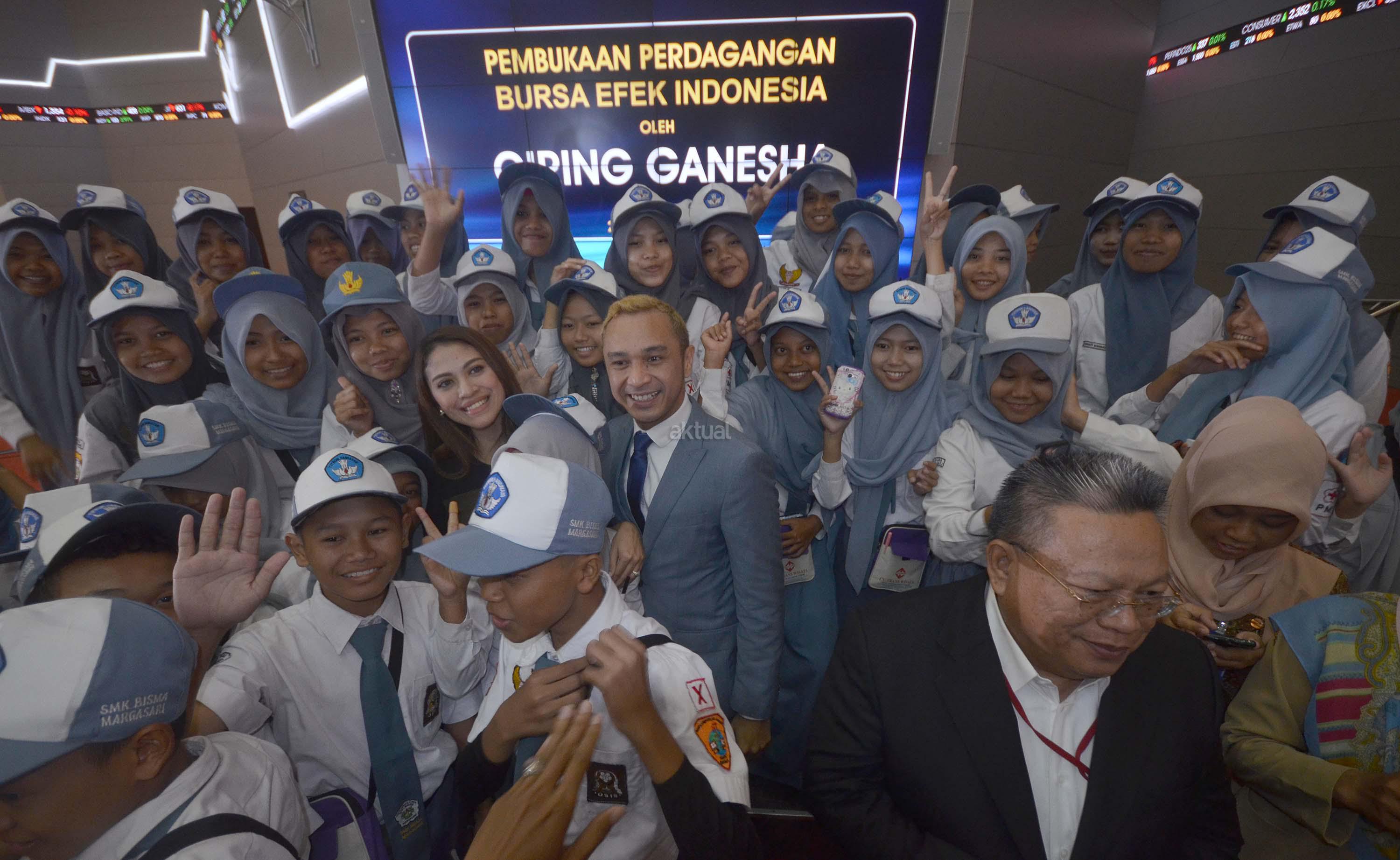 Vokalis Grup Band Nidji, Giring Ganesha (tengah) bersama istrinya Cynthia Riza (kiri) serta Direktur BEI, Chaerudin Berlian (kanan) dikerumuni para pelajar yang melakukan tour dan kunjungan pengenalan pasar modal usai membuka perdagangan saham di BEI, Jakarta, Selasa (23/2). Giring yang telah menjadi investor pasar modal sejak 2008 tersebut mengajak masyarakat untuk menjadi investor sebagai jaminan jangka panjang yang menguntungkan di masa depan. Aktual.com/Eko S Hilman
