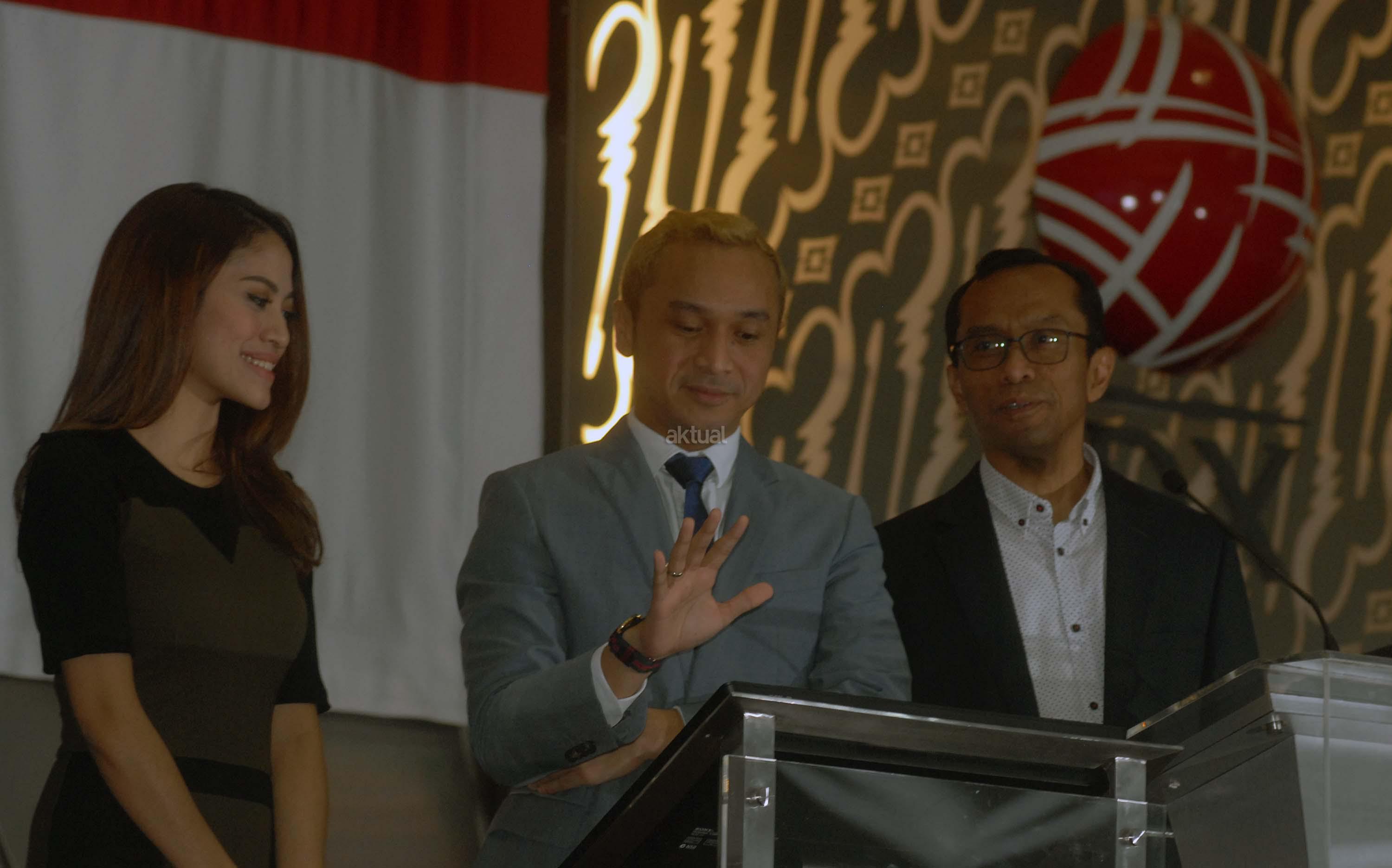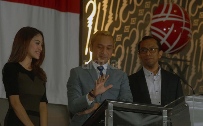 Vokalis Grup Band Nidji, Giring Ganesha (tengah) bersama istrinya Cynthia Riza (kiri) dan Direktur Pengawasan Transaksi dan Kepatuhan Anggota Bursa Efek Indonesia (BEI) Hamdi Hassyabaini membuka perdagangan saham di BEI, Jakarta, Selasa (23/2). Giring yang telah menjadi investor pasar modal sejak 2008 tersebut mengajak masyarakat untuk menjadi investor sebagai jaminan jangka panjang yang menguntungkan di masa depan. Aktual.com/Eko S Hilman