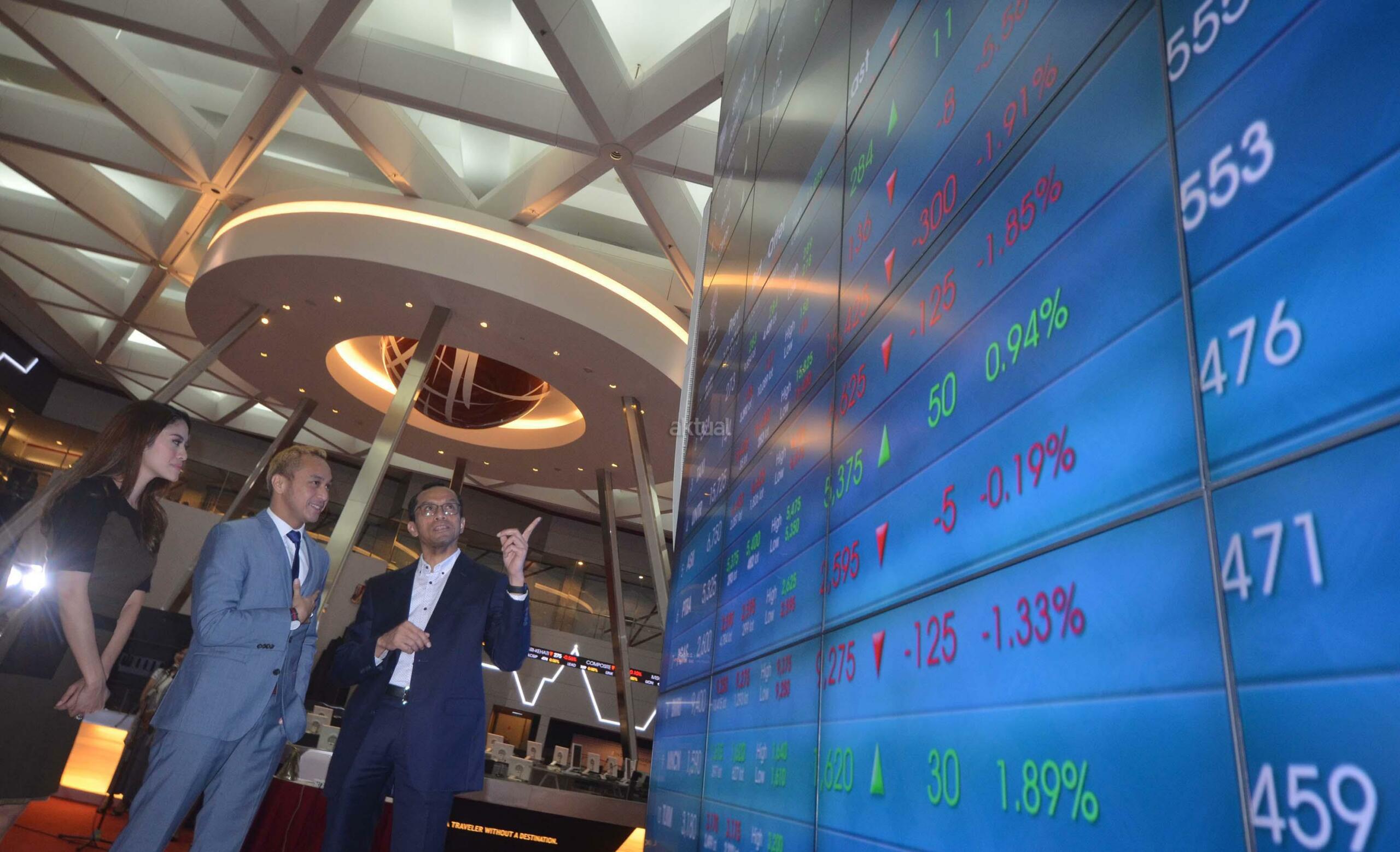 Vokalis Grup Band Nidji, Giring Ganesha (tengah) bersama istrinya Cynthia Riza (kiri) dan Direktur Pengawasan Transaksi dan Kepatuhan Anggota Bursa Efek Indonesia (BEI) Hamdi Hassyabaini memantau pergerakan IHSG saat membuka perdagangan saham di BEI, Jakarta, Selasa (23/2). Giring yang telah menjadi investor pasar modal sejak 2008 tersebut mengajak masyarakat untuk menjadi investor sebagai jaminan jangka panjang yang menguntungkan di masa depan. Aktual.com/Eko S Hilman