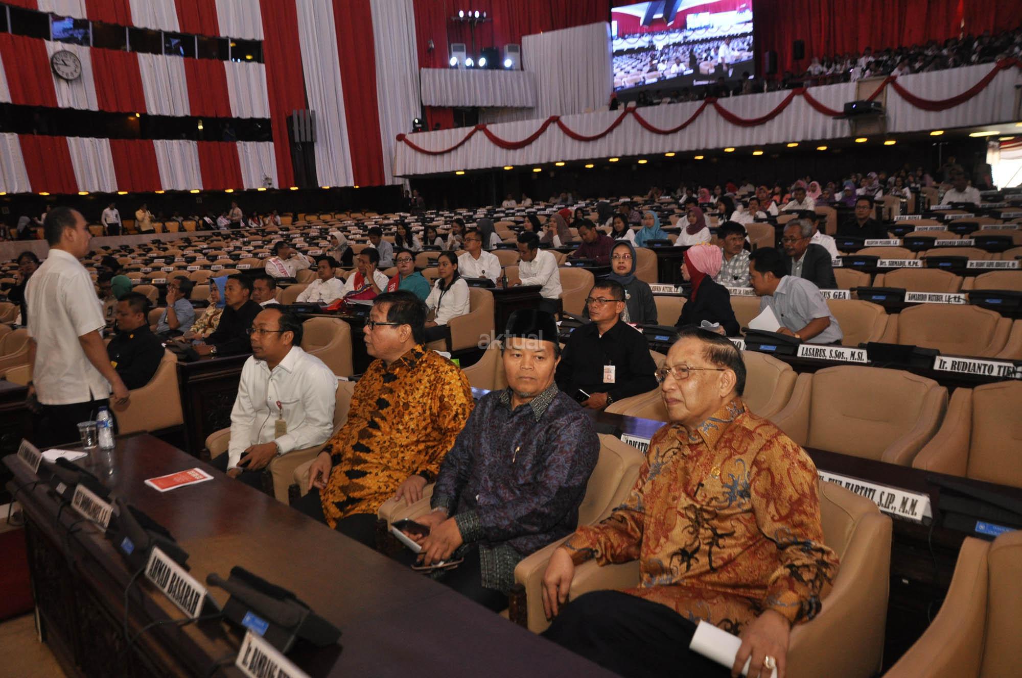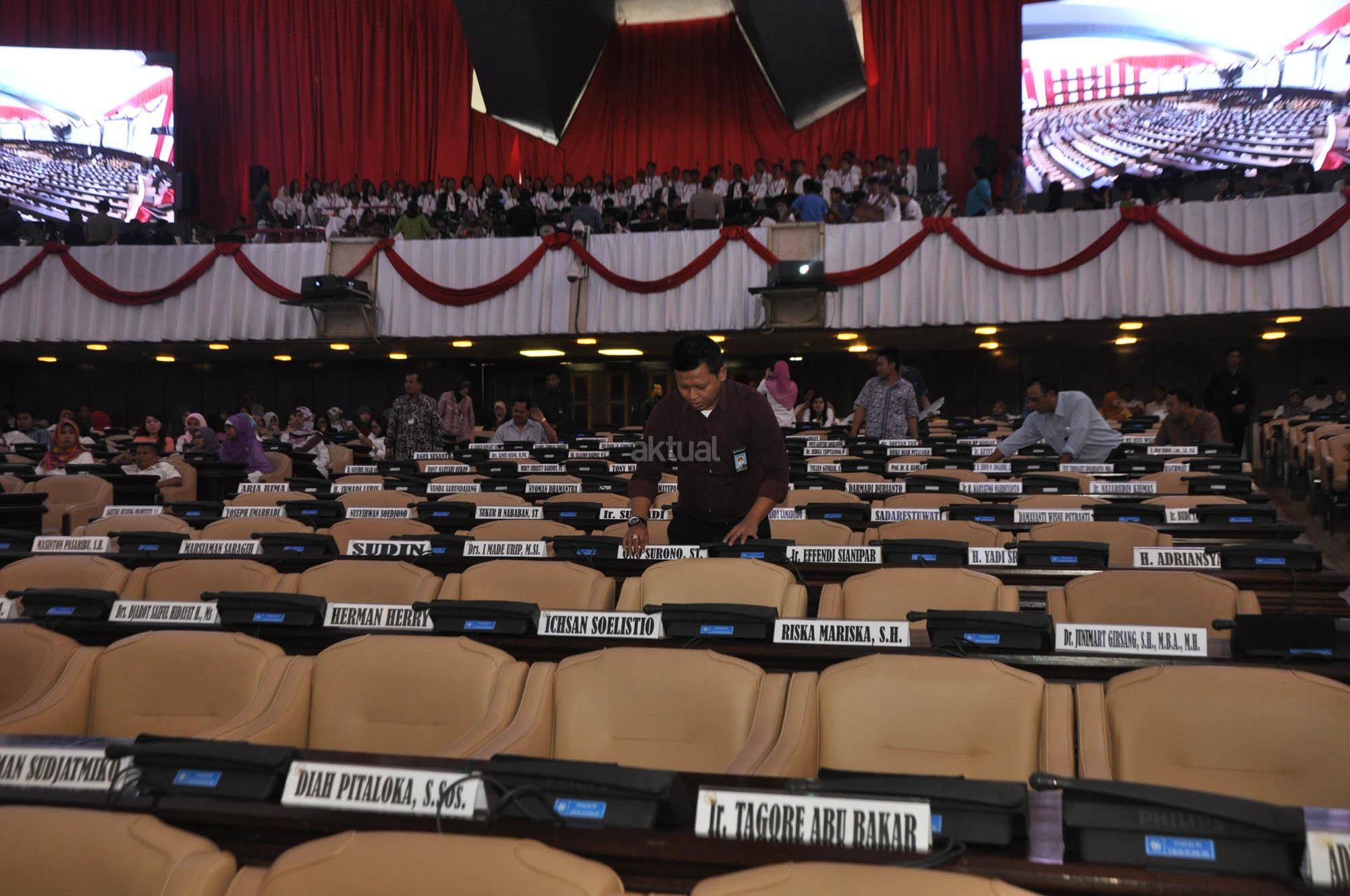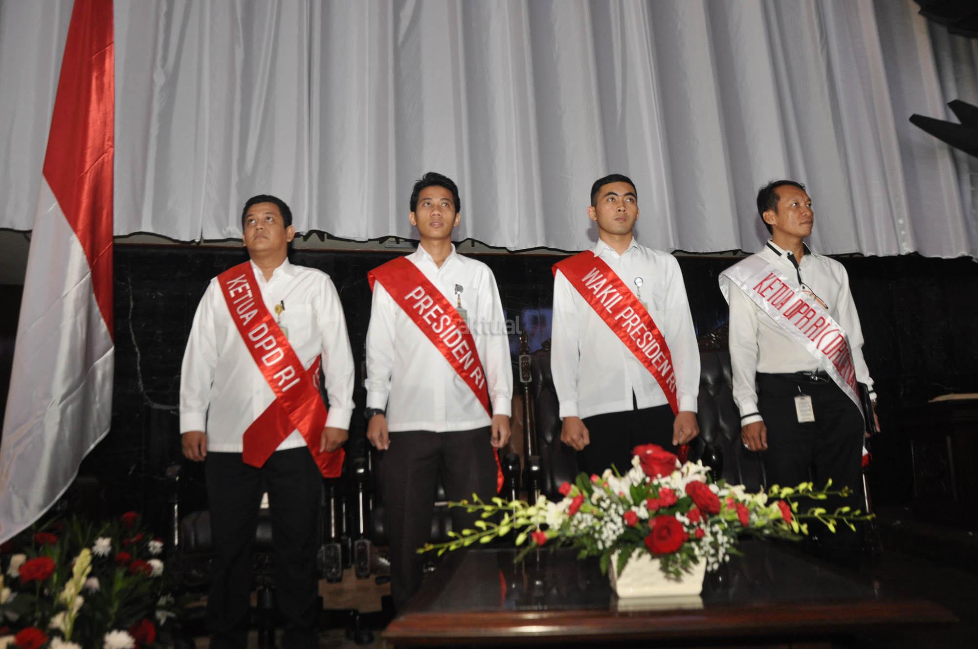 Sejumlah peraga memperagakan Presiden dan Wakil Presiden, Ketua MPR, DPR dan MPR dalam gladi bersih sidang tahunan MPR RI di Gedung Kura-kura, Komplek Parlemen, Senayan, Jakarta, Kamis (13/8/2015). DPR RI bersama DPD RI menggelar gladi bersih Kamis 14 Agustus 2014 sebelum pelaksanaan Pidato Kenegaraan Presiden RI dalam rangka Penyampaian RUU APBN Tahun Anggaran 2015 disertai Nota Keuangan yang akan berlangsung di ruang rapat Paripurna, Gedung DPR RI.