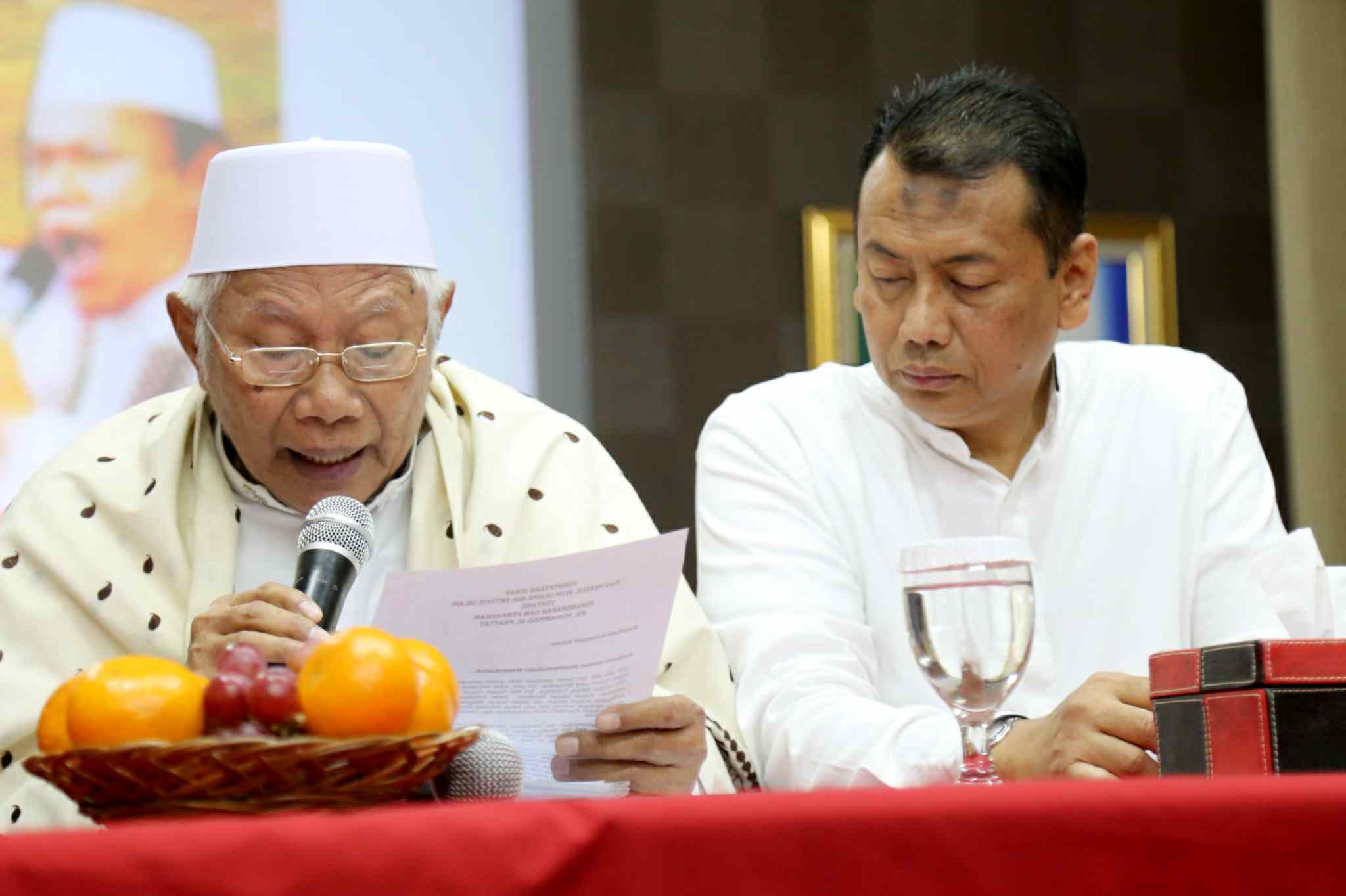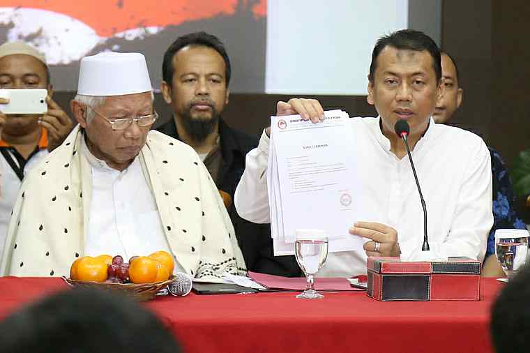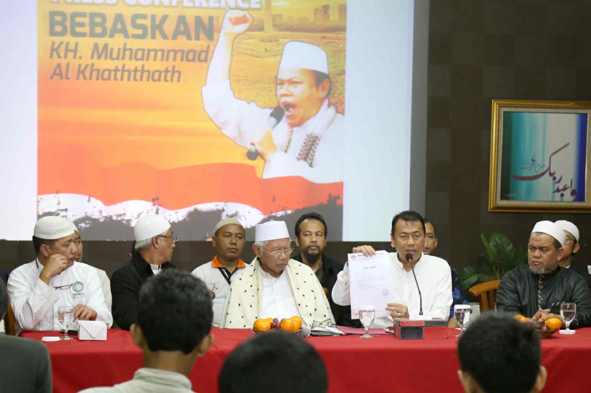 Kuasa Hukum KH Muhammad Al Khaththath, Kapitra didampingi Pembina GNPF MUI Jakarta, KH Abdul Rasyid menunjukan surat kesepakatan bersama saat konferensi pers “Bebaskan KH Muhammad Al Khaththath” di AQL Islamic Center Jalan Tebet Utara, Jakarta Selatan, Senin (3/4). Pimpinan GNPF MUI, Pimpinan Ormas dan Tokoh Masyarakat menyerukan aparat kepolisian agar membebaskan KH Muhammad Al Khaththath dari tahanan dan tuduhan makar. Karena selaku pimpinan aksi 313 sekaligus Sekjen FUI dengan tuduhan makar merupakan bentuk penggunaan hukum instrumen of power, yang sama sekali tidak berkeadilan. AKTUAL/Tino Oktaviano