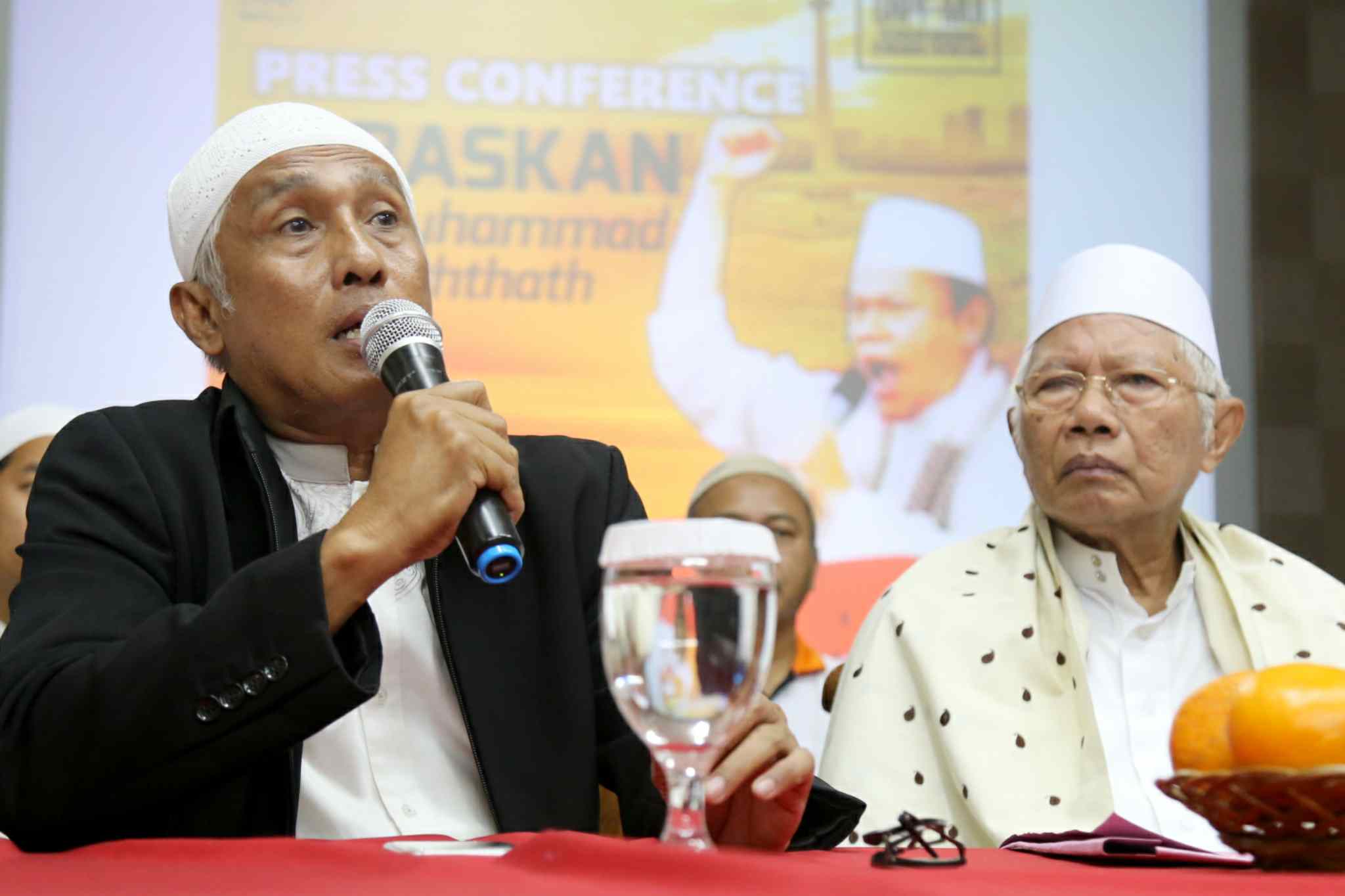 Kuasa Hukum KH Muhammad Al Khaththath, Kapitra didampingi Pembina GNPF MUI Jakarta, KH Abdul Rasyid dan Anggota Tim Pengacara Muslim (TPM), Achmad Michdan saat konferensi pers "Bebaskan KH Muhammad Al Khaththath" di AQL Islamic Center Jalan Tebet Utara, Jakarta Selatan, Senin (3/4). Pimpinan GNPF MUI, Pimpinan Ormas dan Tokoh Masyarakat menyerukan aparat kepolisian agar membebaskan KH Muhammad Al Khaththath dari tahanan dan tuduhan makar. Karena selaku pimpinan aksi 313 sekaligus Sekjen FUI dengan tuduhan makar merupakan bentuk penggunaan hukum instrumen of power, yang sama sekali tidak berkeadilan. AKTUAL/Tino Oktaviano