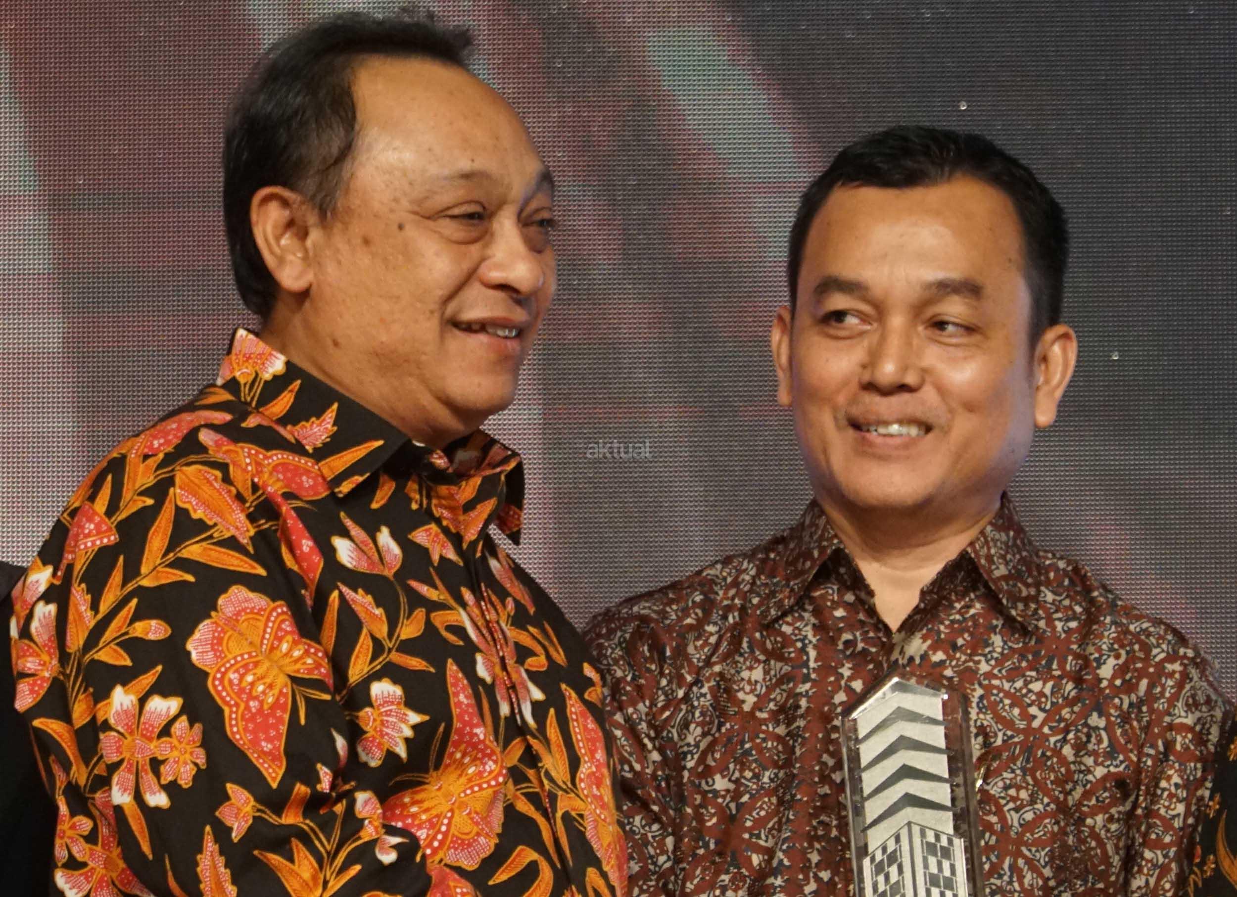 Direktur Utama PT Bank Tabungan Negara Tbk. Maryono (kiri) menyerahkan penghargaan kepada Direktur PT PP Properti Tbk (PPRO),Taufik Hidayat di acara BTN Golden Property Award 2017. PT PP Properti Tbk (PPRO) pengembang properti terkemuka untuk kelas menengah di Tanah Air, mendapatkan penghargaan Golden Property Awards 2017 dari Bank BTN dalam kategori proyek, untuk Grand Kamala Lagoon (GKL) di Jakarta dan Grand Sungkono Lagoon (GSL) di Surabaya. AKTUAL/Eko S Hilman