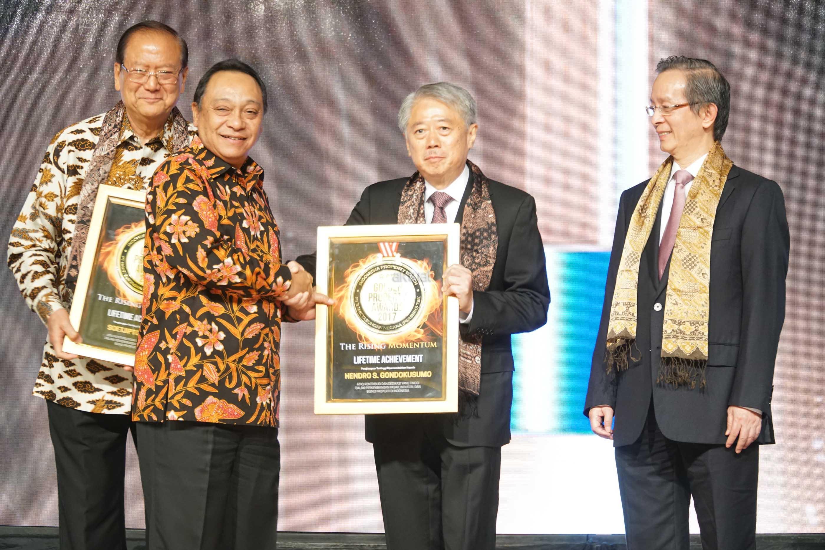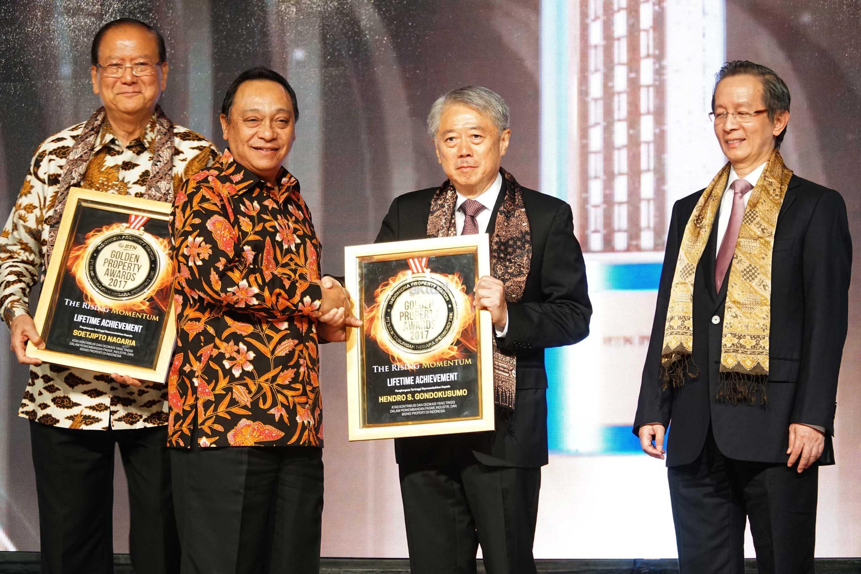 Direktur Utama PT Bank Tabungan Negara (Persero) Tbk. Maryono (kedua kiri} menyerahkan penghargaan Lifetime Achievement kepada Founder Intiland Development Hendro Gondokusumo, Founder Summarecon Agung, Soetjipto Nagaria dan Founder Pakuwon Group Alexander Tedja dalam ajang BTN Golden Property Award (GPA) 2017 di Jakarta, Senin (11/9). Penghargaan tertinggi ini merupakan bentuk pengakuan terhadap peran para founder dalam memajukan bisnis properti Tanah Air dengan beragam inovasi dan terobosan. AKTUAL/Eko S Hilman