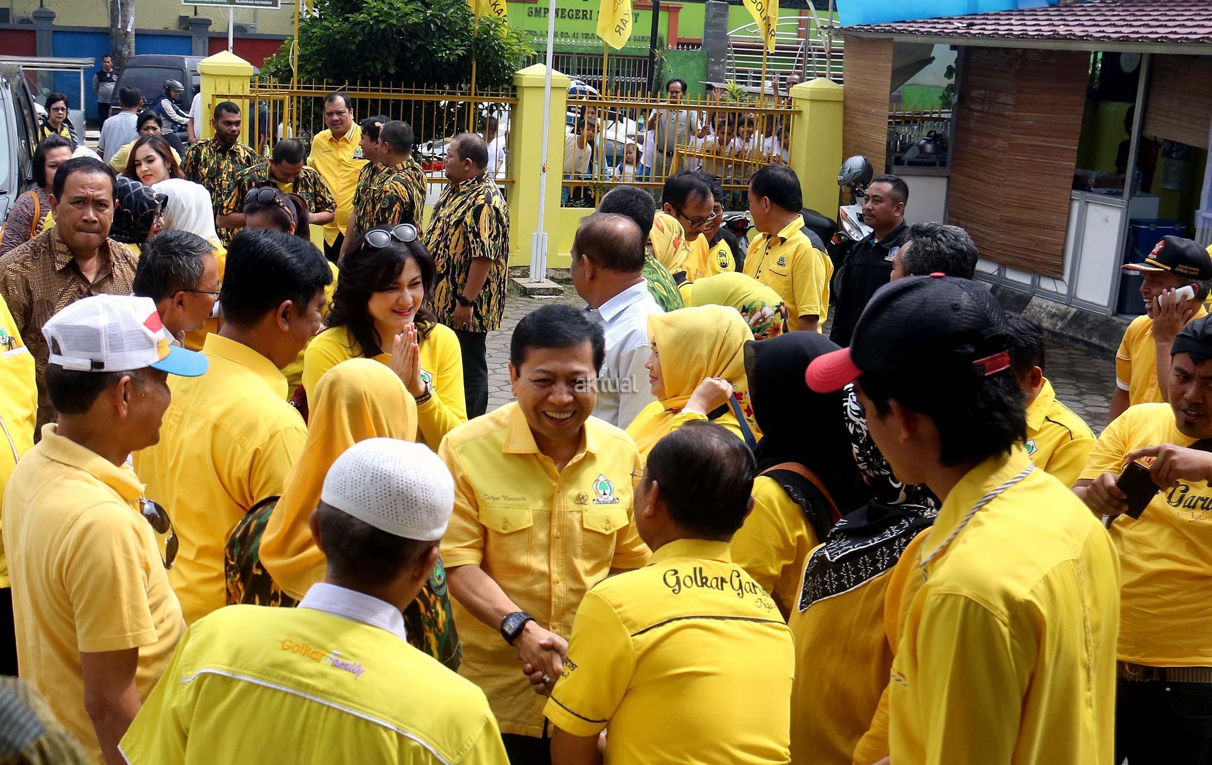 Ketua Umum Partai Golkar Setya Novanto bersama isteri Deisti Novanto dan pengurus DPP Partai Golkar tiba di kantor DPD Partai Golkar Kabupaten Garut dan disambut Ketua DPD Partai Golkar Ade Ginanjar , Jawa Barat, Jumat (23/9/2016). Kedatangan Ketua Umum Partai Golkar beserta rombongan untuk memberikan bantuan dari Ikatan Istri Partai Golkar, berupa pompa untuk menyedot air kotor, selimut, susu bayi, pakaian perempuan dan anak-anak. AKTUAL/MUNZIR