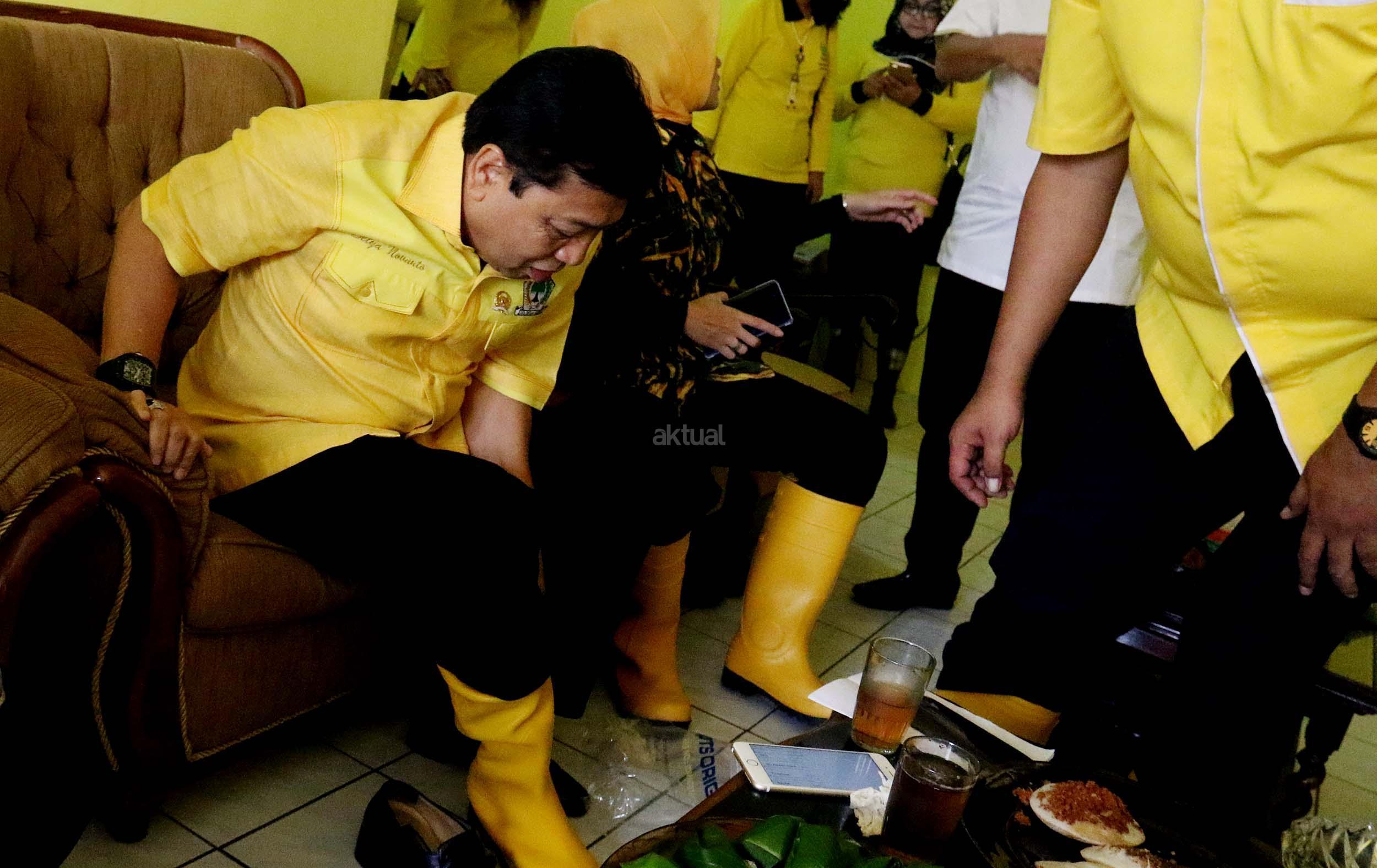 Ketua Umum Partai Golkar Setya Novanto mengenakan sepatu boot, akan meninjau lokasi korban banjir di Kabupaten Garut, Jawa Barat, Jumat (23/9/2016). Kedatangan Ketua Umum Partai Golkar beserta rombongan pengurus DPP Partai Golkar, Ikatan Istri Partai Golkar dan AMPG untuk memberikan bantuan dari Ikatan Istri Partai Golkar, berupa pompa untuk menyedot air kotor, selimut, susu bayi, pakaian perempuan dan anak-anak. AKTUAL/MUNZIR