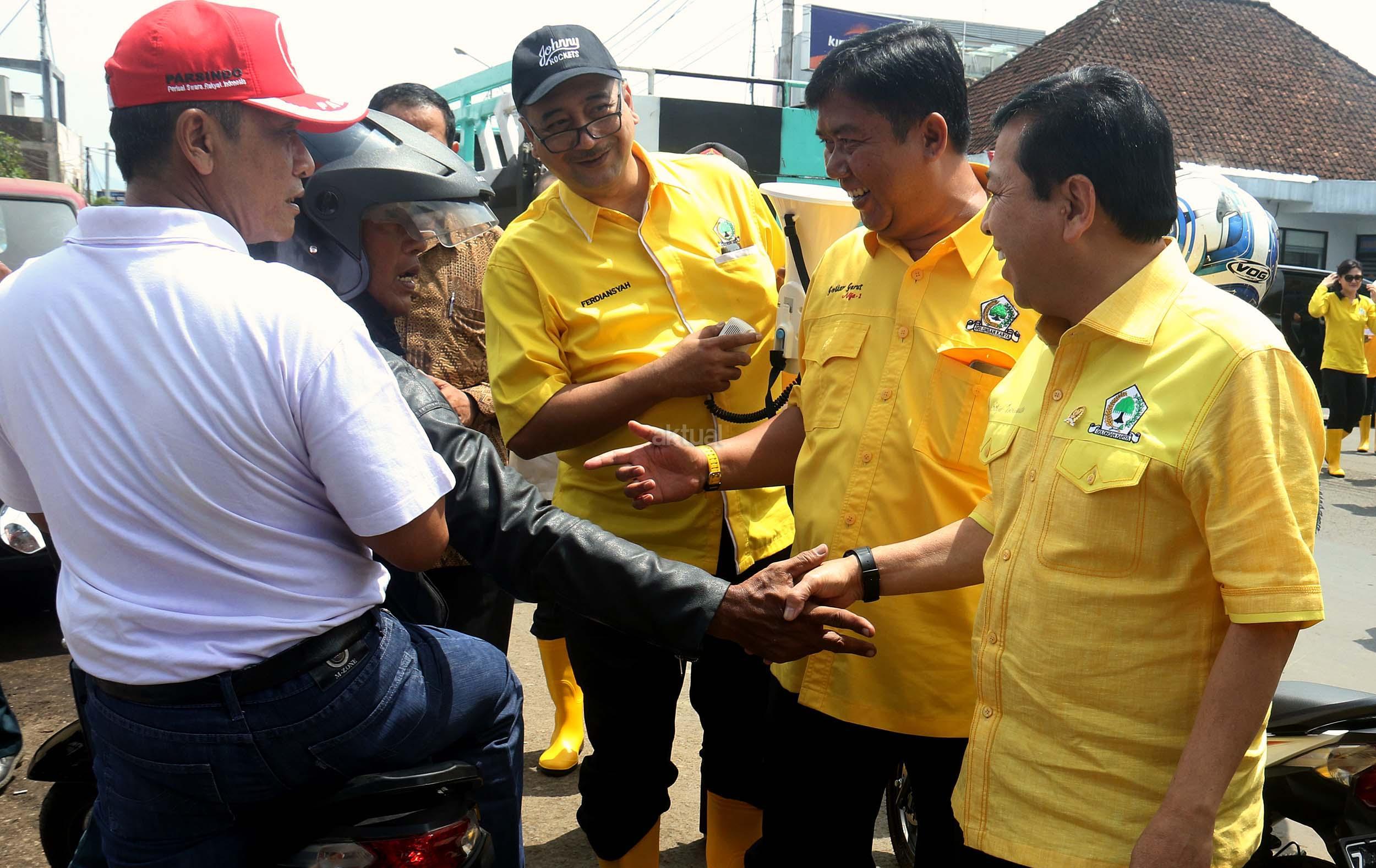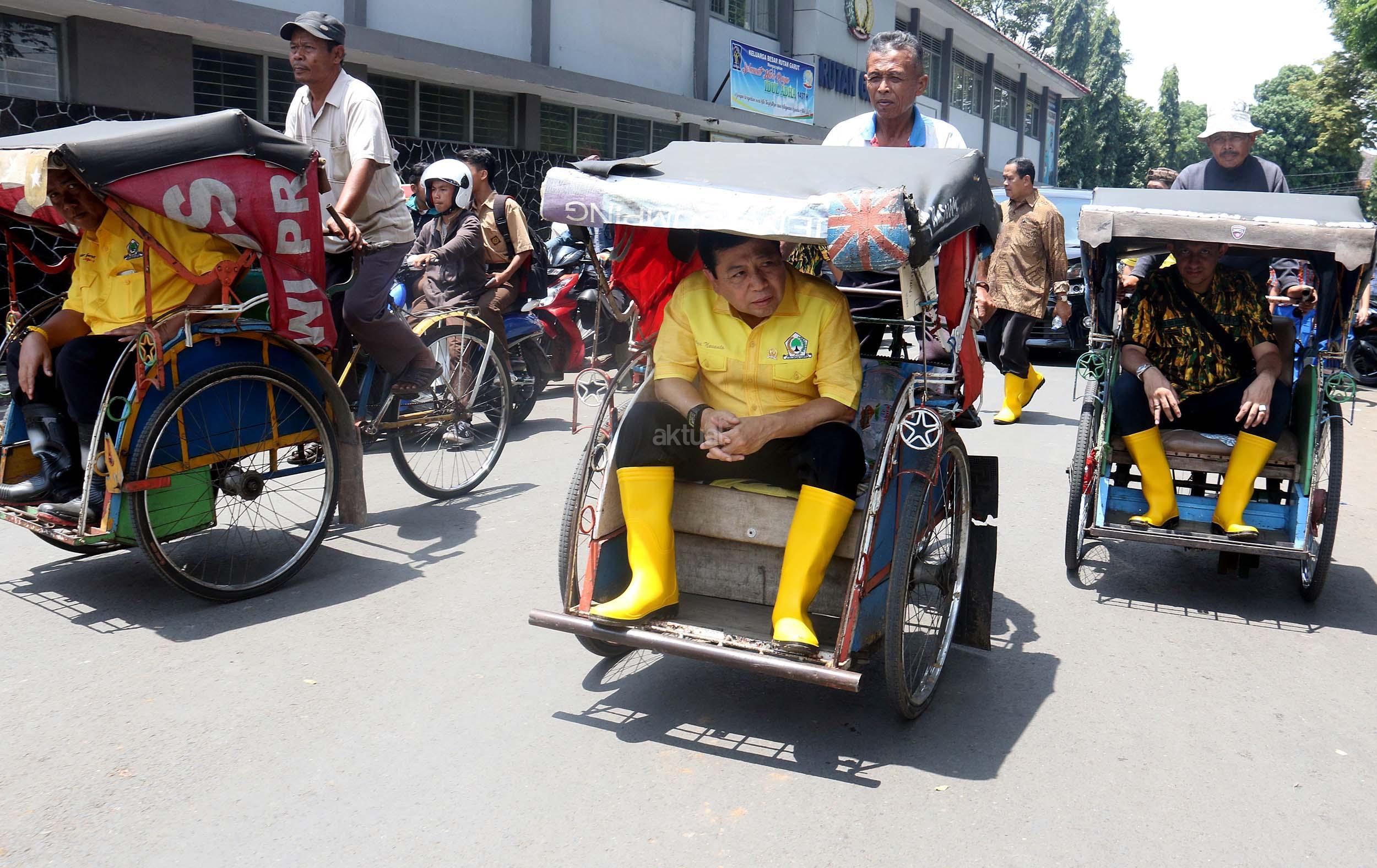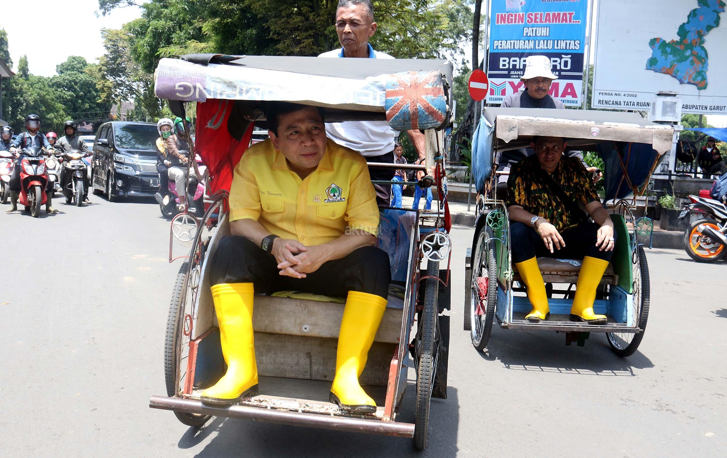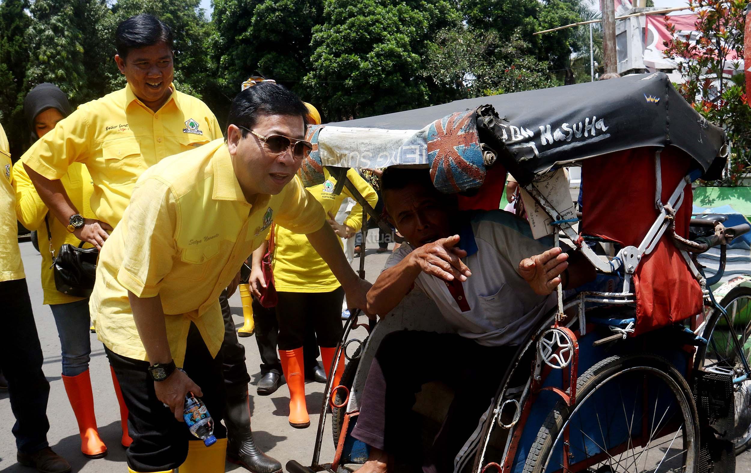 Ketua Umum Partai Golkar Setya Novanto berbincang dengan tukang becak saat akan ke kantor DPD Partai Golkar Kabupaten Garut, Jumat (23/9/2016). Kedatangan Ketua Umum Partai Golkar beserta rombongan pengurus DPP Partai Golkar, Ikatan Istri Partai Golkar dan AMPG untuk memberikan bantuan dari Ikatan Istri Partai Golkar,berupa pompa untuk menyedot air kotor, selimut, susu bayi, pakaian perempuan dan anak-anak. AKTUAL/MUNZIR
