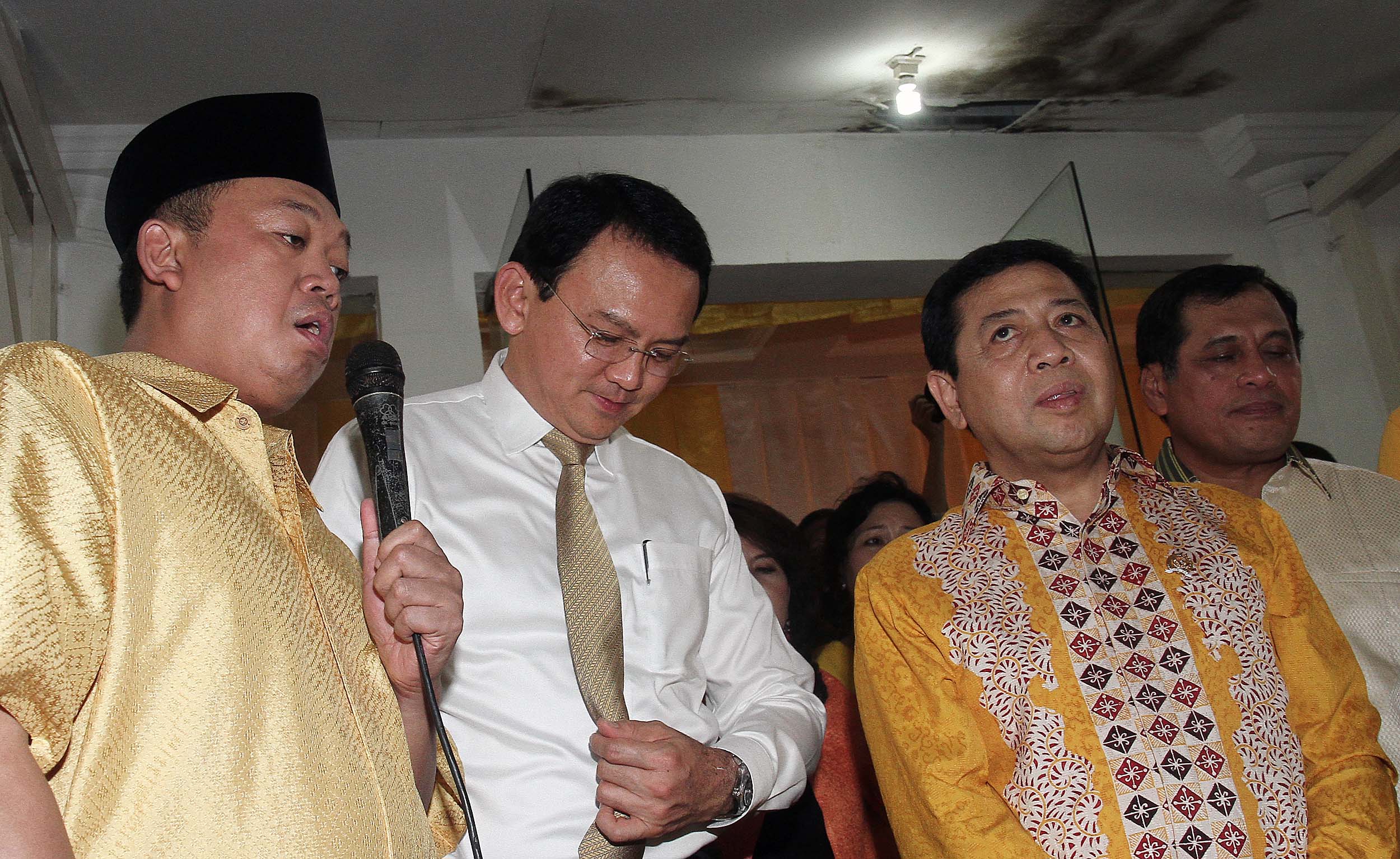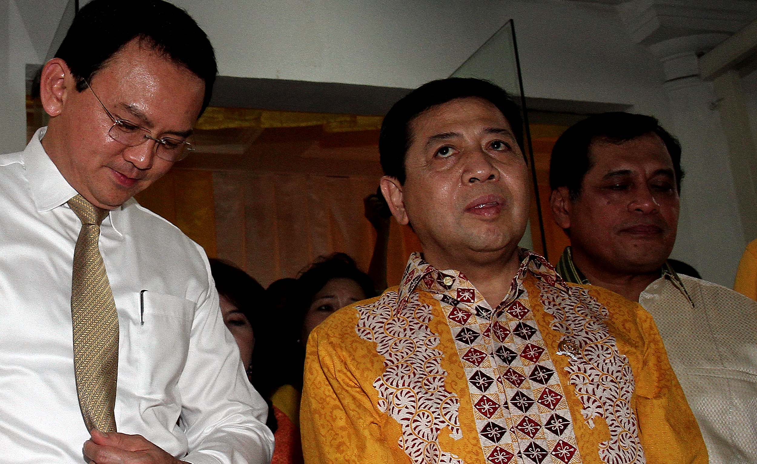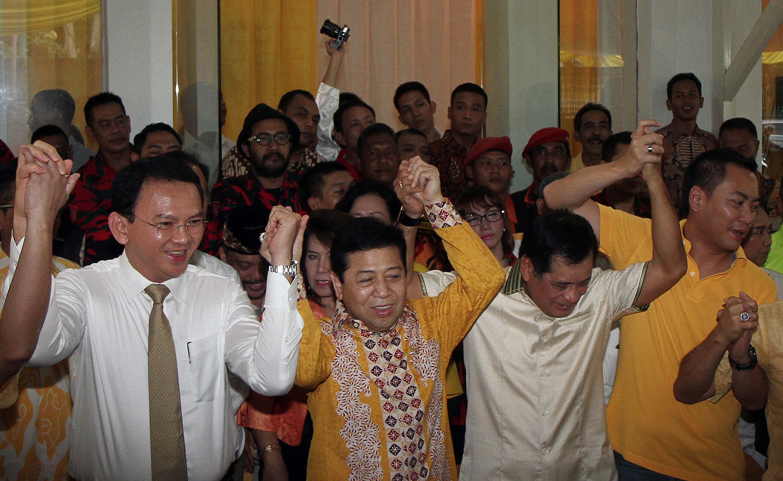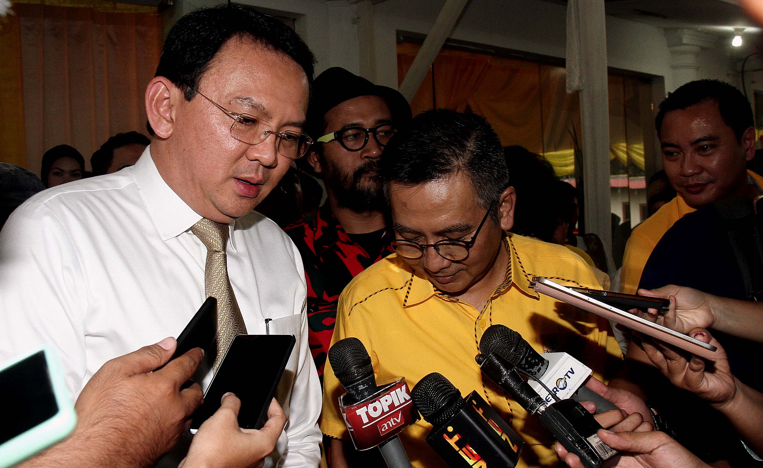 Kiri-kanan ;Ketua Koordinator Bidang Kajian Strategis dan Pengembangan Sumber Daya Manusia Partai golkar Nusron Wahid ,Gubenur DKI Jakarta Basuki Tjahja Purnama (Ahok), Ketua Umum Partai Golkar Setya Novanto, Ketua Harian Partai Golkar Nurdin Halid mendeklarasikan dukungan kepada Ahok menjadi Gubenur DKI Jakarta di DPD Partai Golkar DKI Jakarta, Kamis (24/6/2016). Dewan Pimpinan Daerah Partai Golkar Provinsi DKI Jakarta menyerahkan dukungan resmi dari Dewan Pimpinan Pusat Partai Golkar kepada bakal calon petahana Basuki Tjahaja Purnama atau Ahok untuk maju dalam Pemilihan Kepala Daerah (Pilkada) DKI Jakarta 2017.