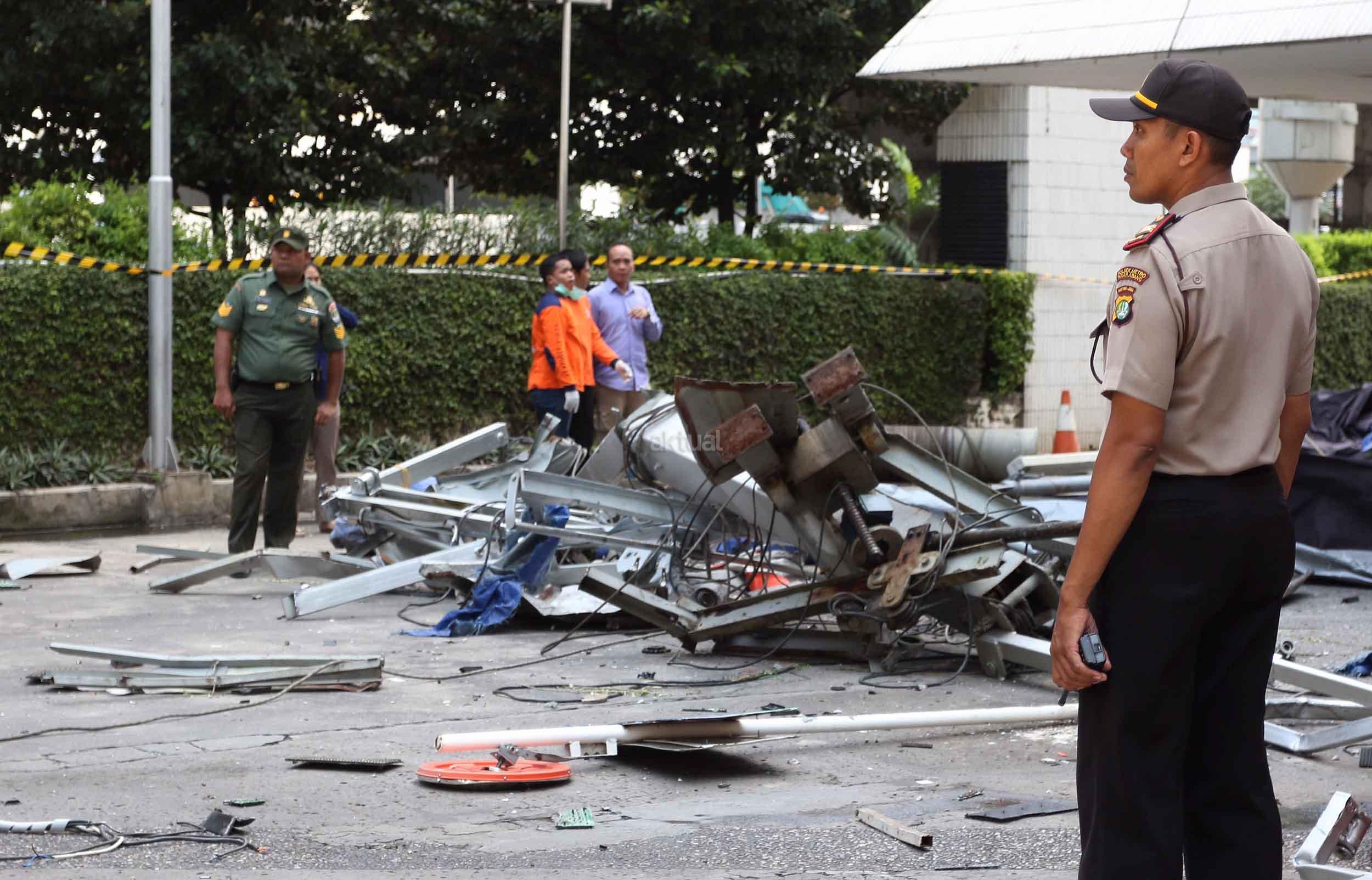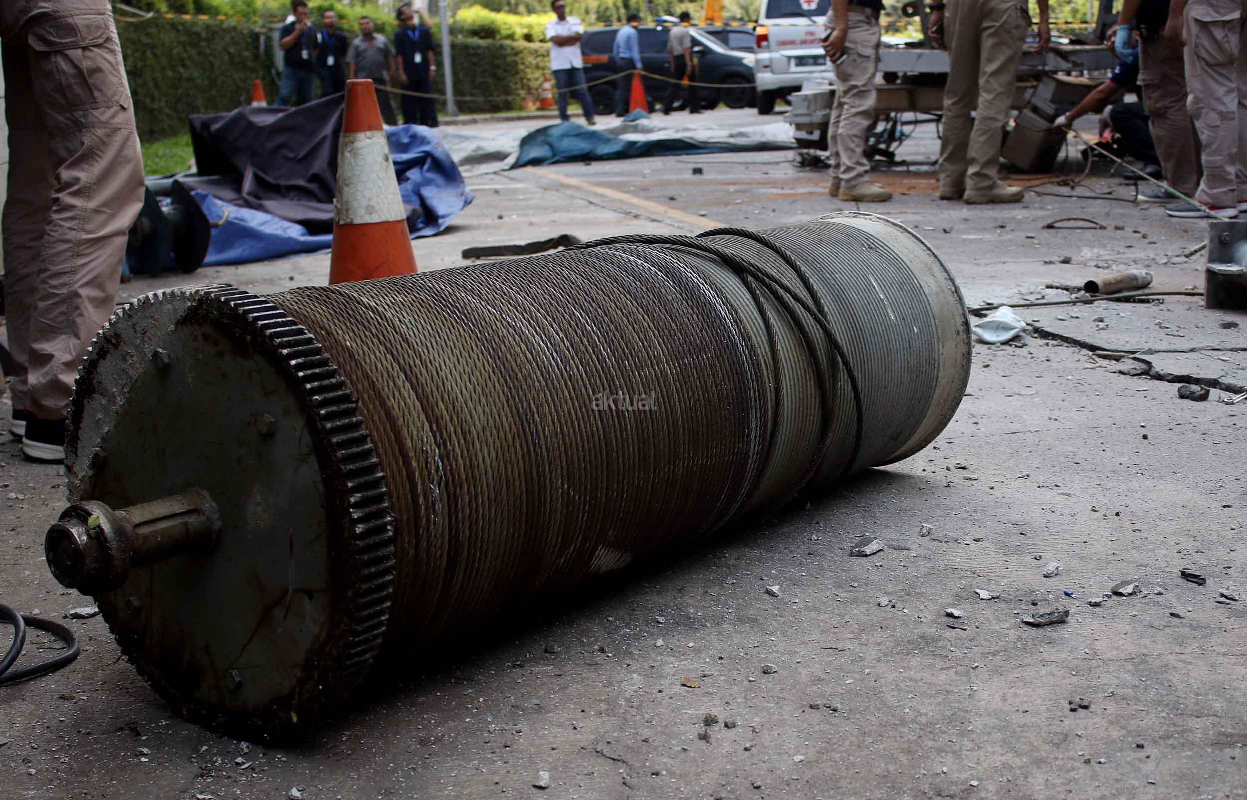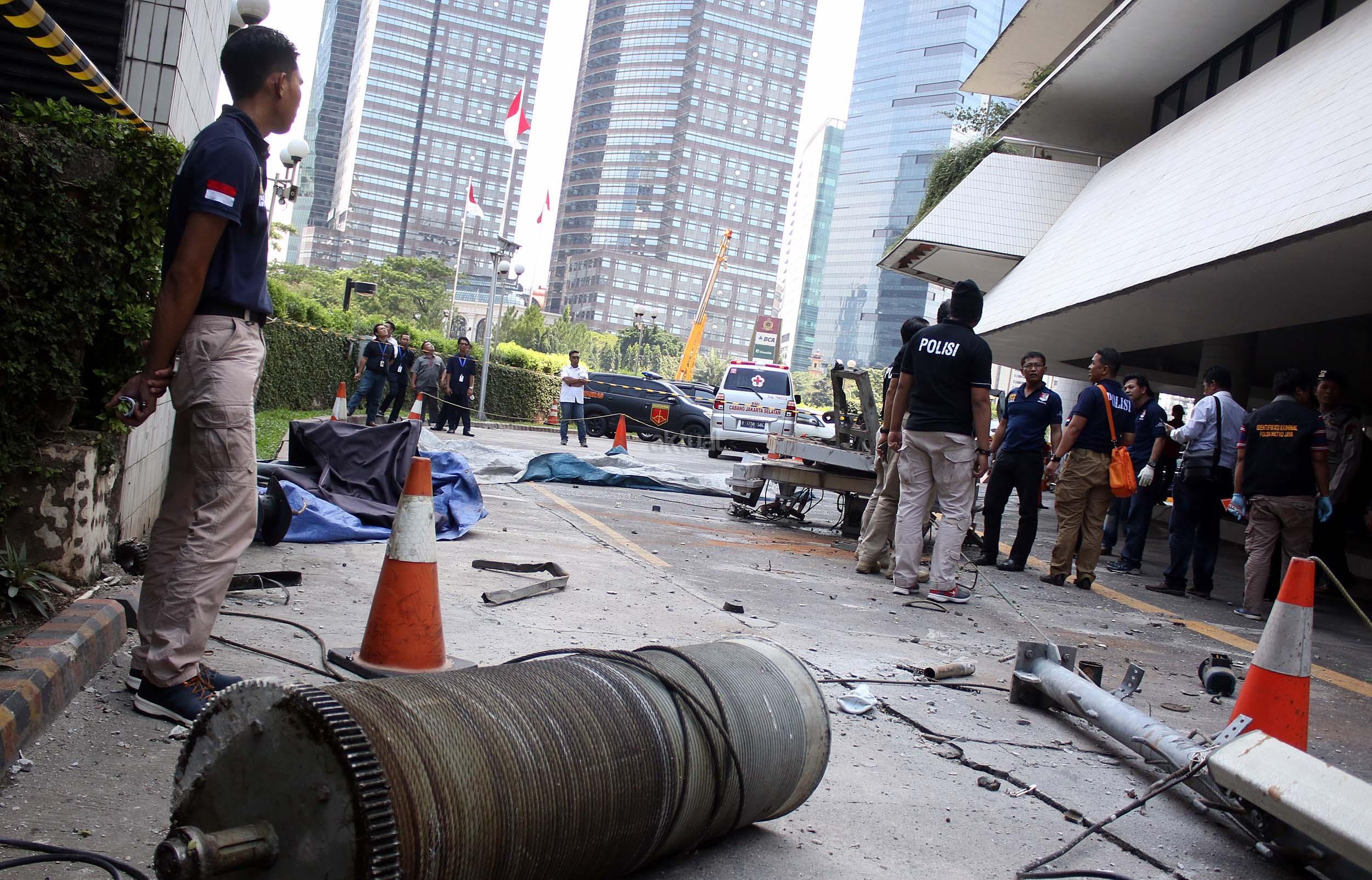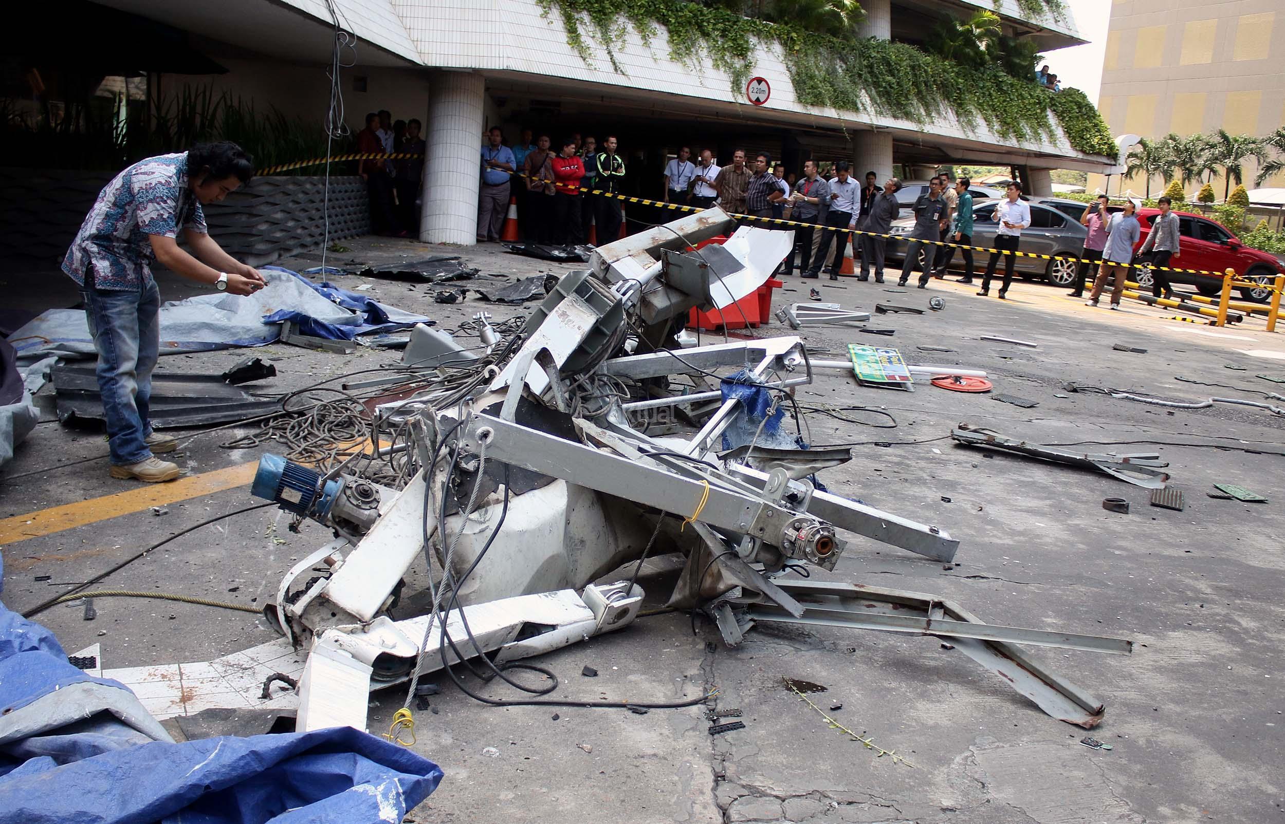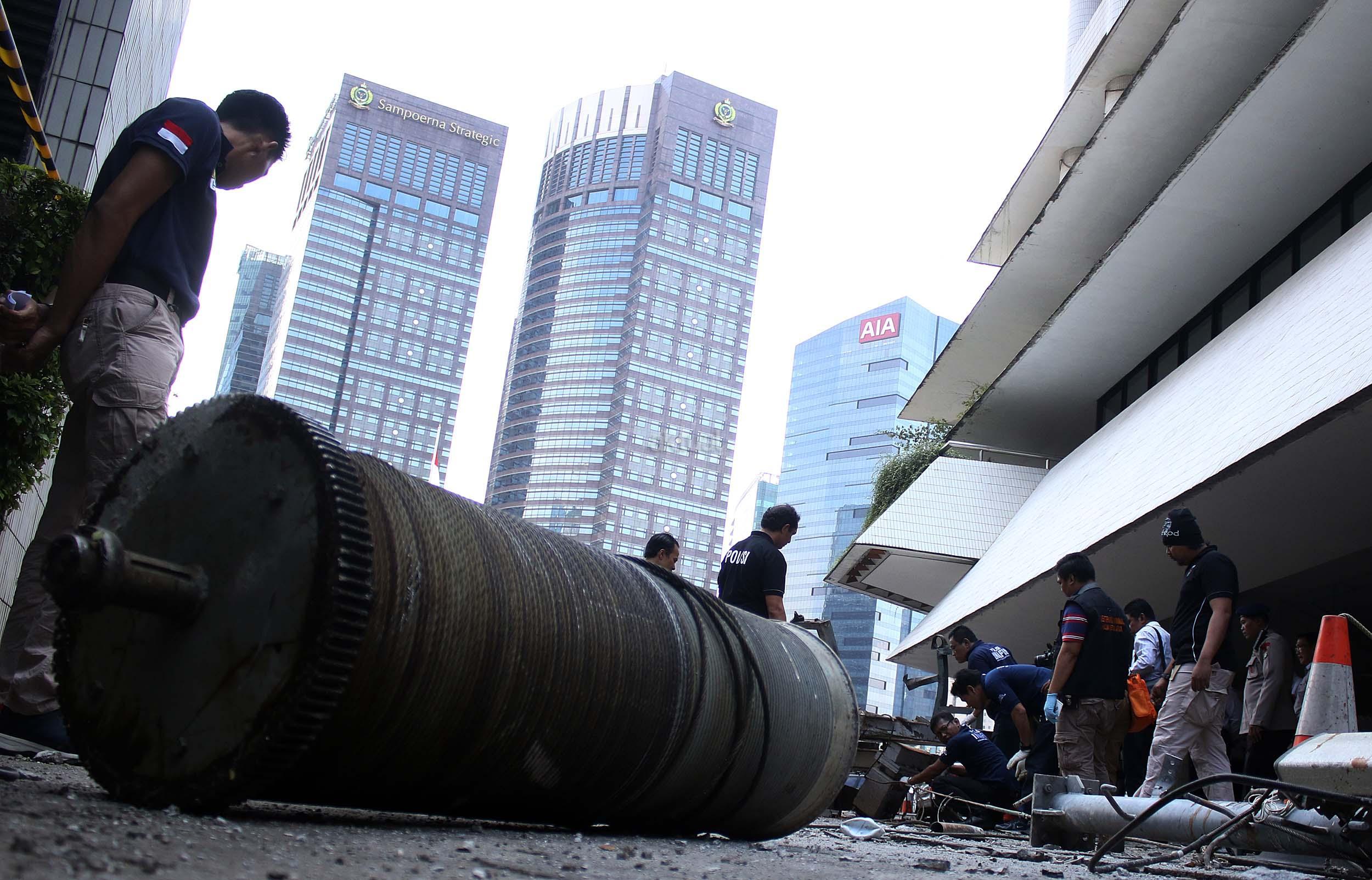 Sejumlah anggota Kepolisian dari Polres Jakarta Pusat memeriksa gondola yang jatuh dari lantai 23 Gedung Intiland Tower Sudirman, Jakarta, Rabu (26/10/2016). Kereta gantung (gondola) jatuh dari lantai 23 Gedung Intiland Tower Sudirman dan seorang operator meninggal dunia yang diduga gondola jatuh karena tali terputus.