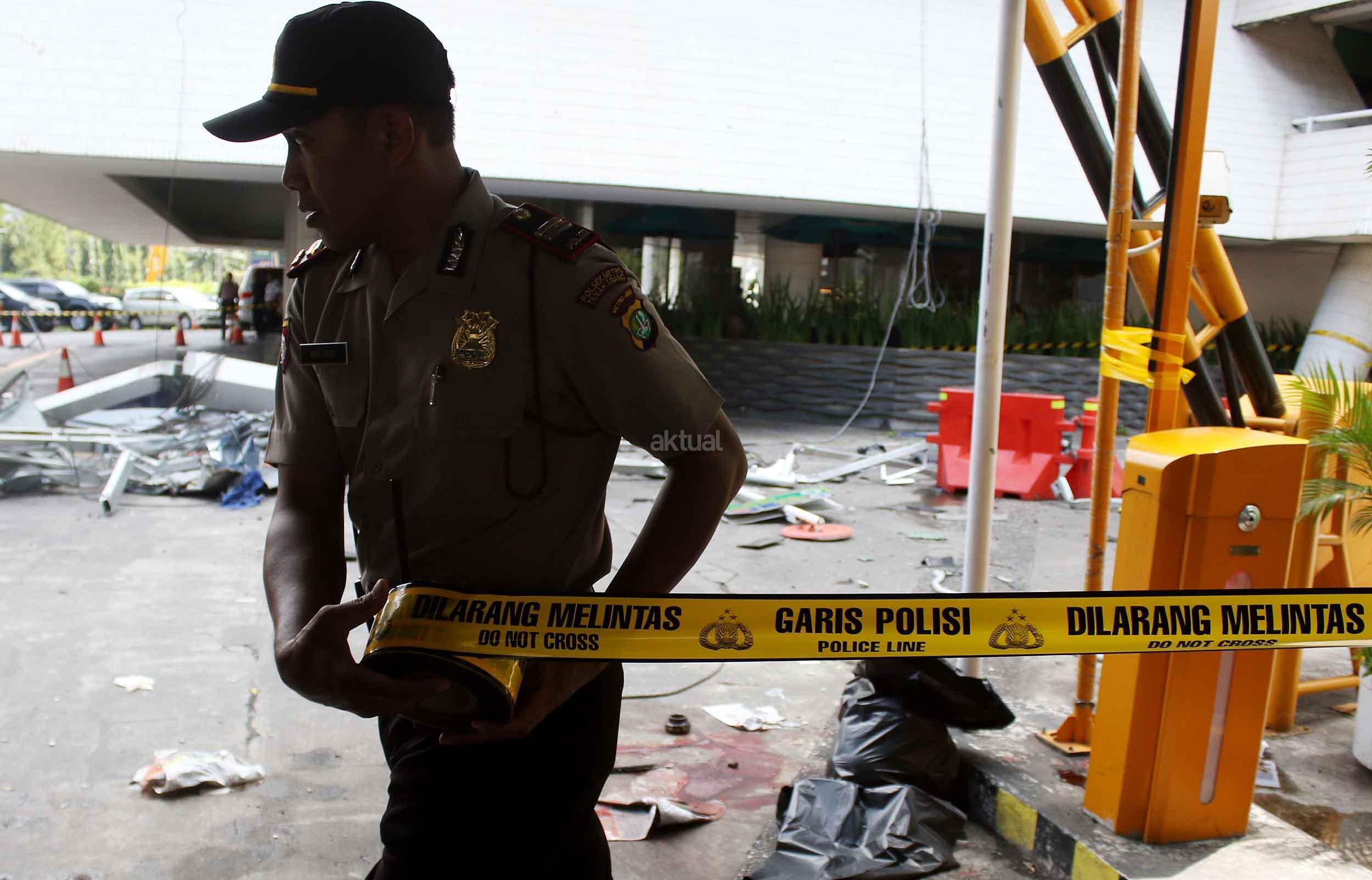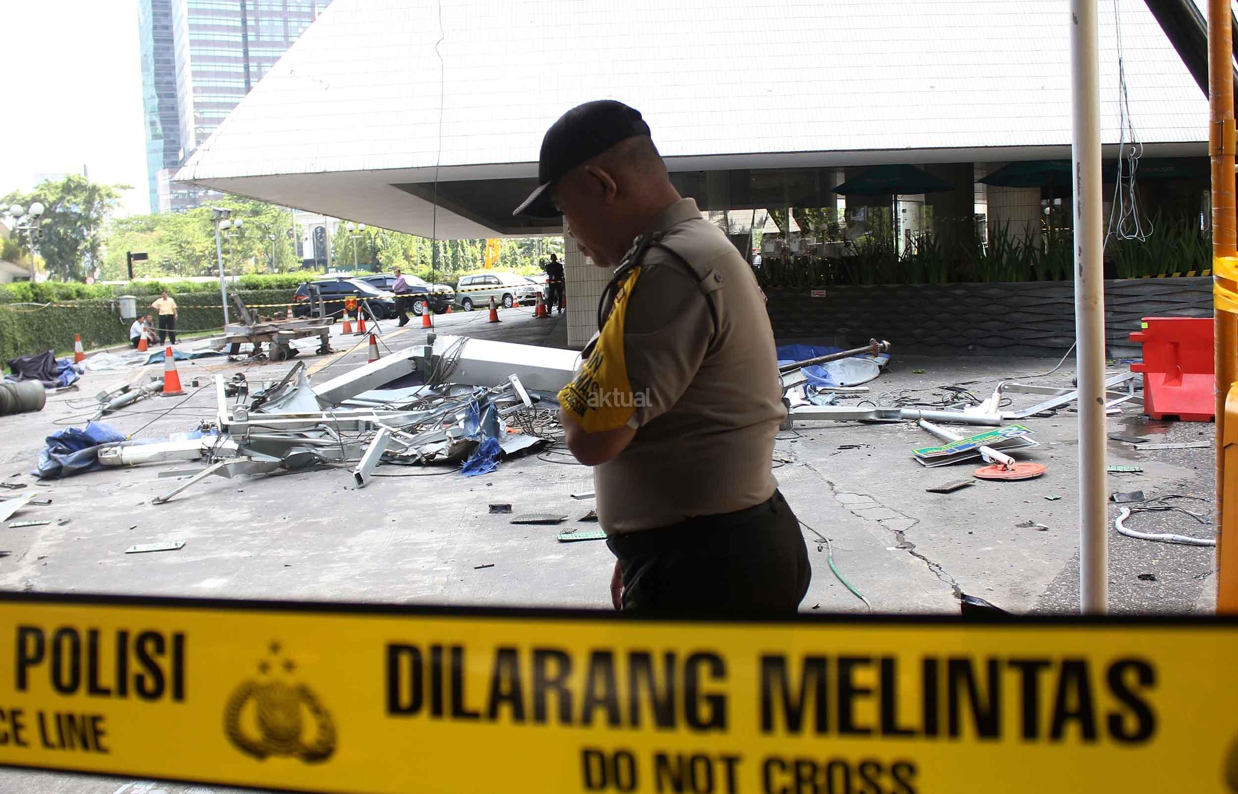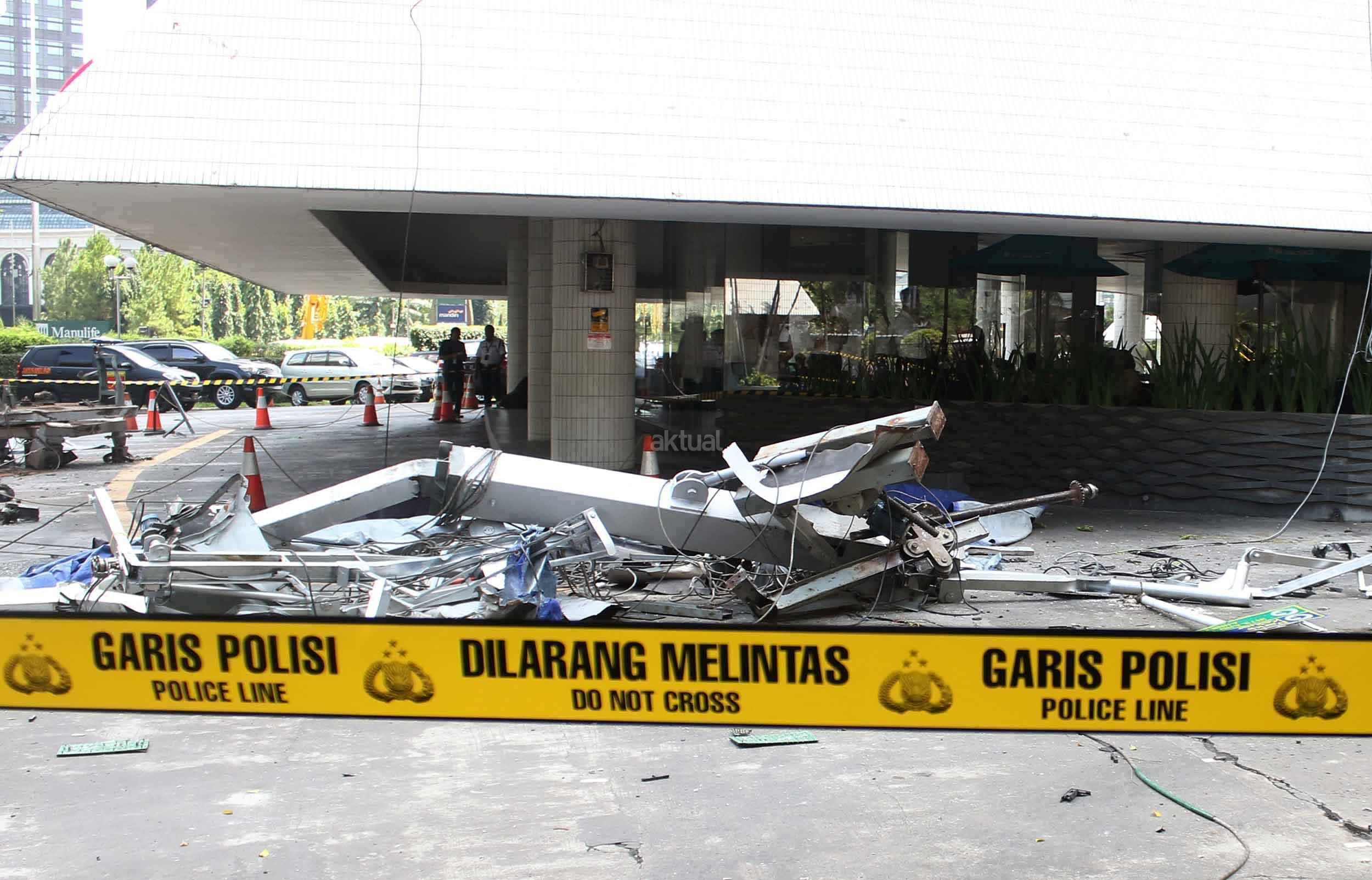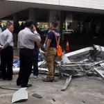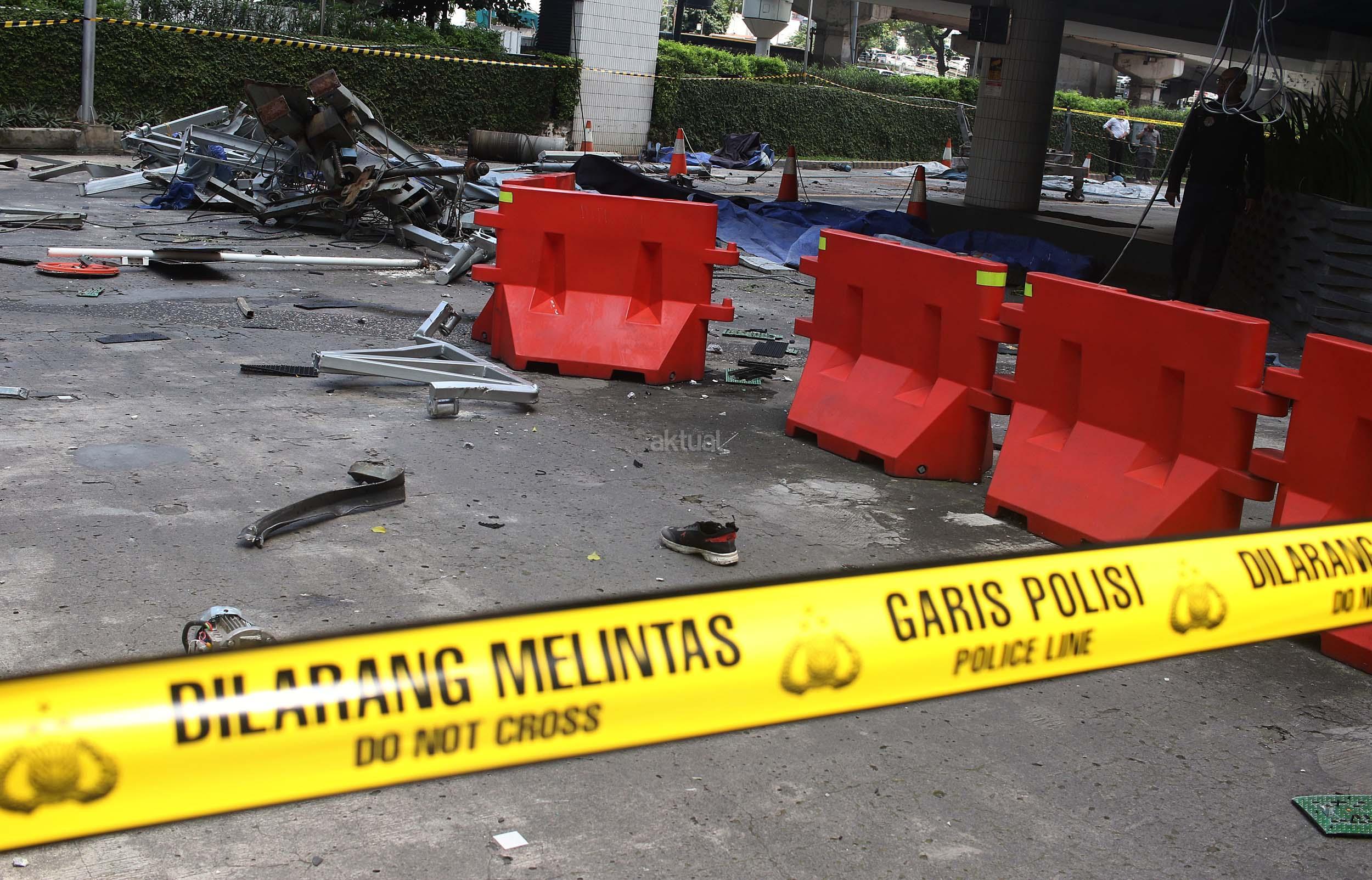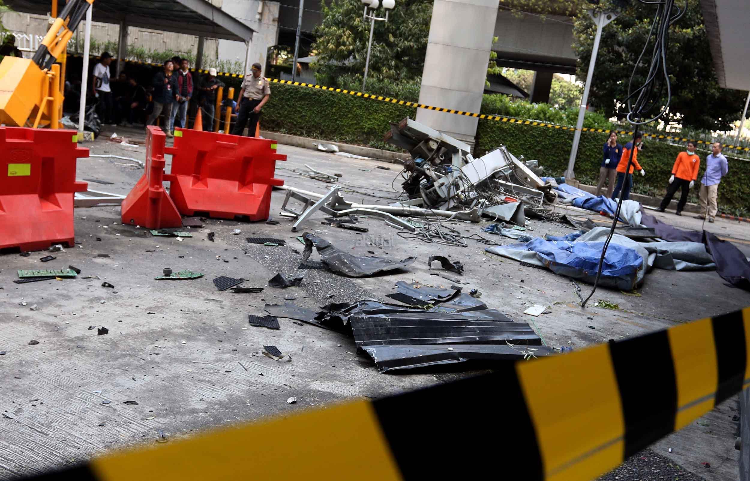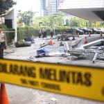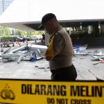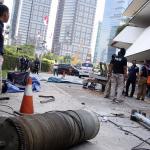 Sejumlah anggota Kepolisian dari Polres Jakarta Pusat memeriksa gondola yang jatuh dari lantai 23 Gedung Intiland Tower Sudirman, Jakarta, Rabu (26/10/2016). Kereta gantung (gondola) jatuh dari lantai 23 Gedung Intiland Tower Sudirman dan seorang operator meninggal dunia yang diduga gondola jatuh karena tali terputus.