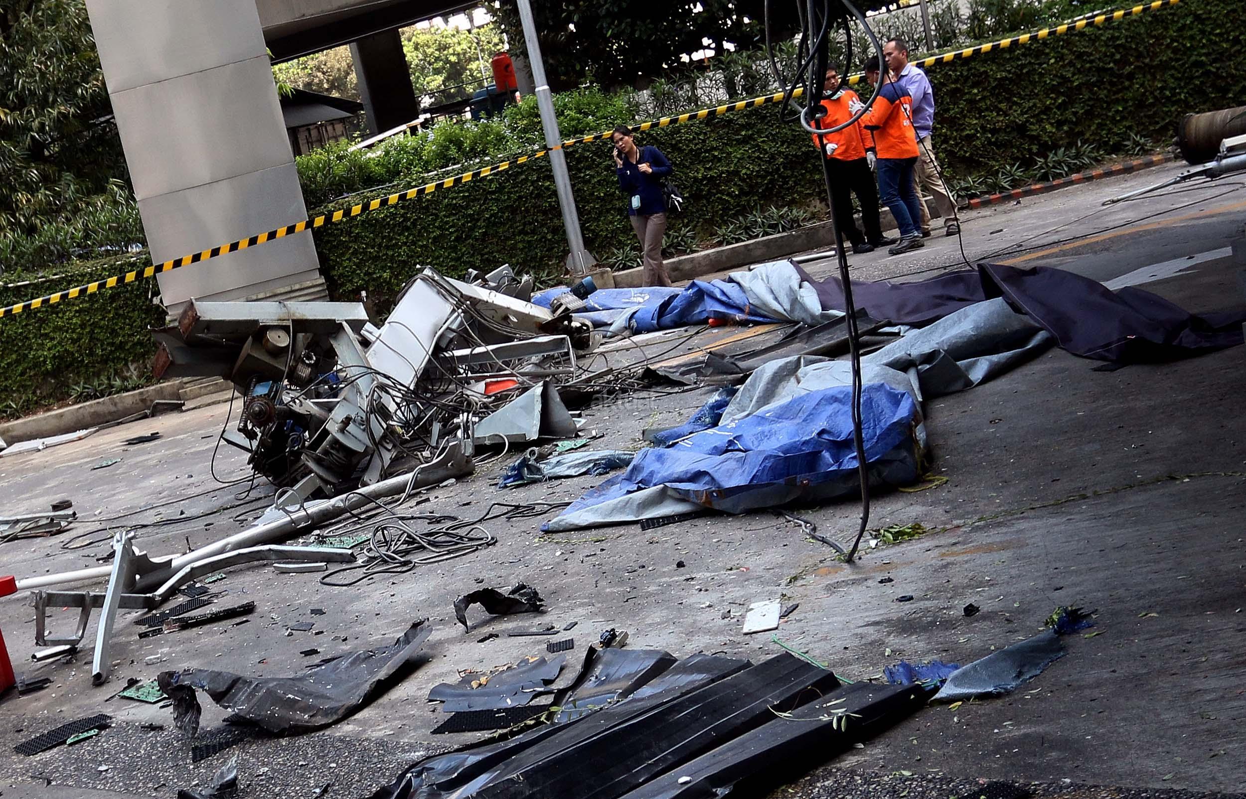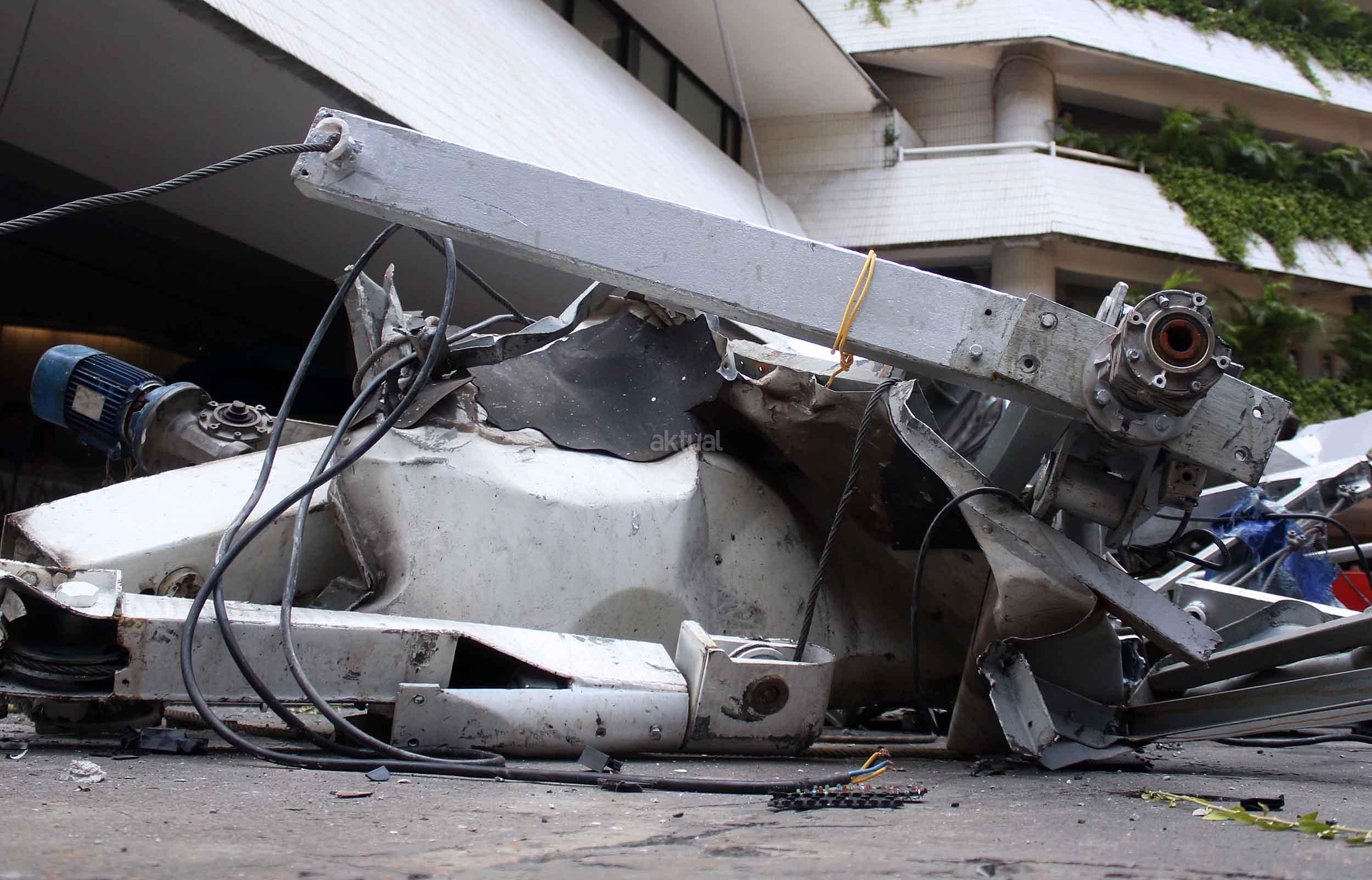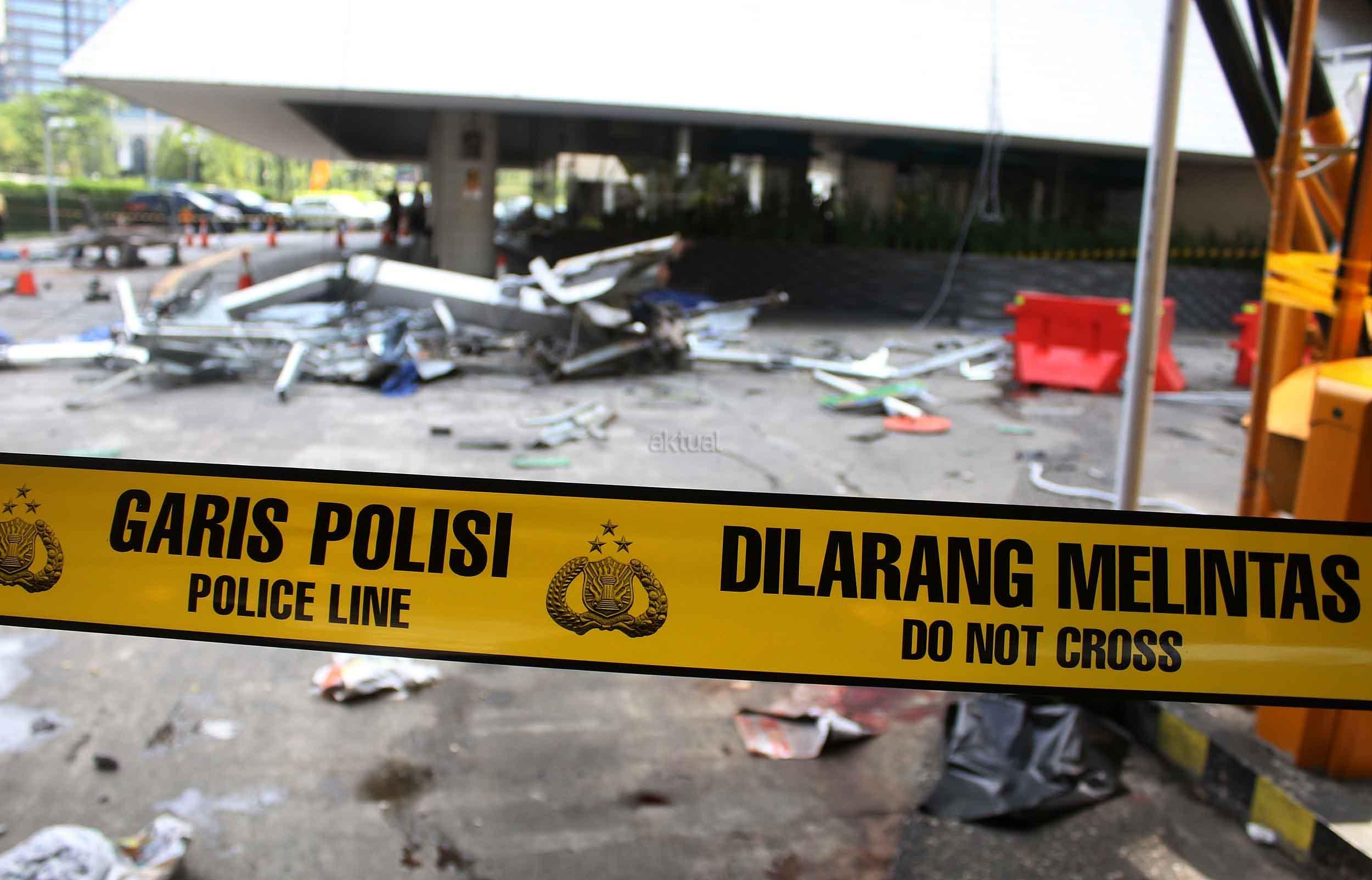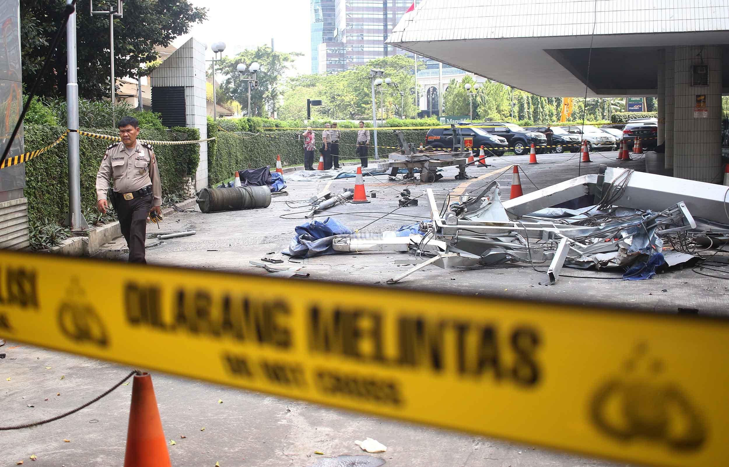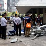 Sejumlah anggota Kepolisian dari Polres Jakarta Pusat memeriksa gondola yang jatuh dari lantai 23 Gedung Intiland Tower Sudirman, Jakarta, Rabu (26/10/2016). Kereta gantung (gondola) jatuh dari lantai 23 Gedung Intiland Tower Sudirman dan seorang operator meninggal dunia yang diduga gondola jatuh karena tali terputus.