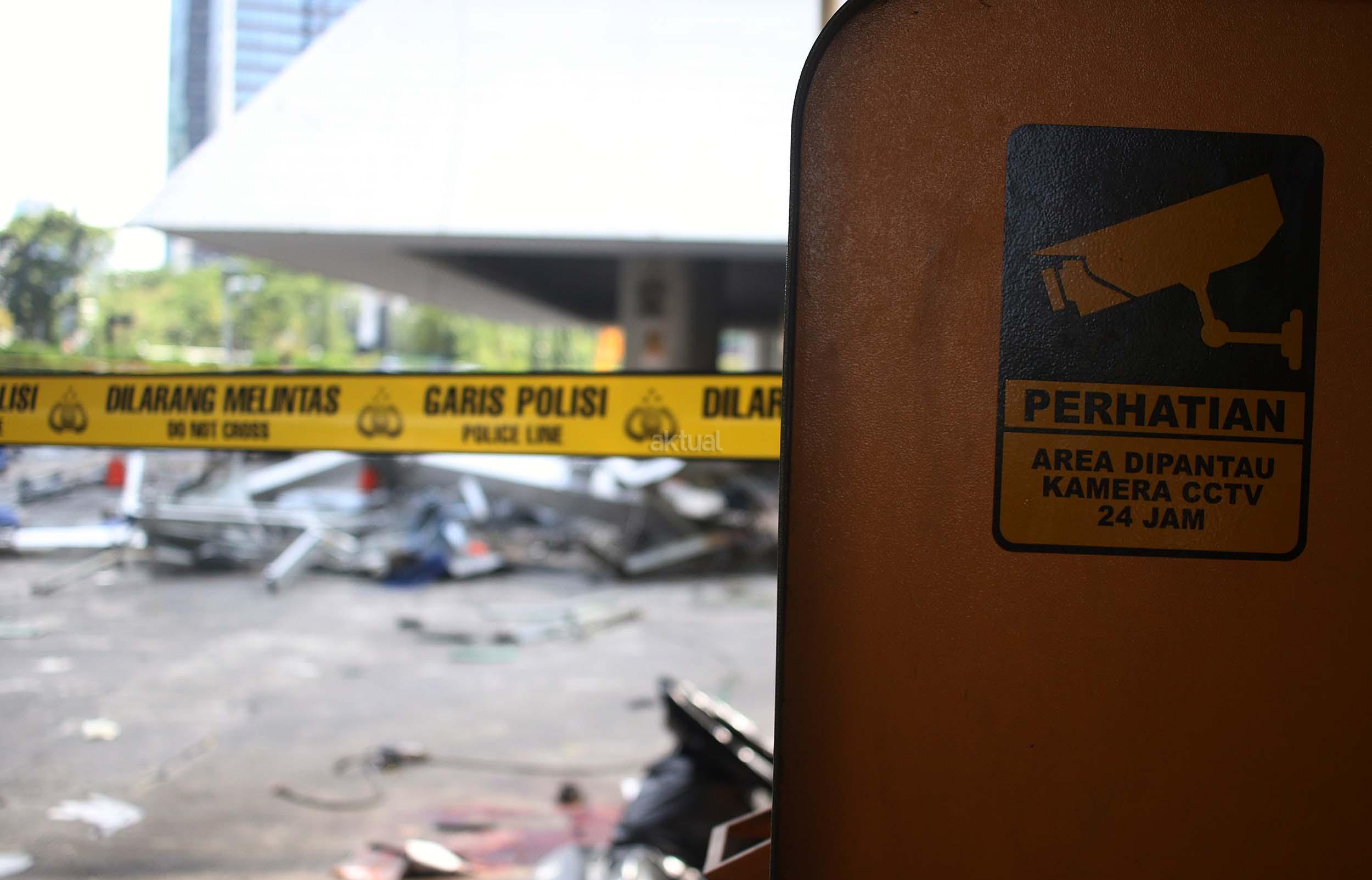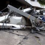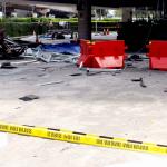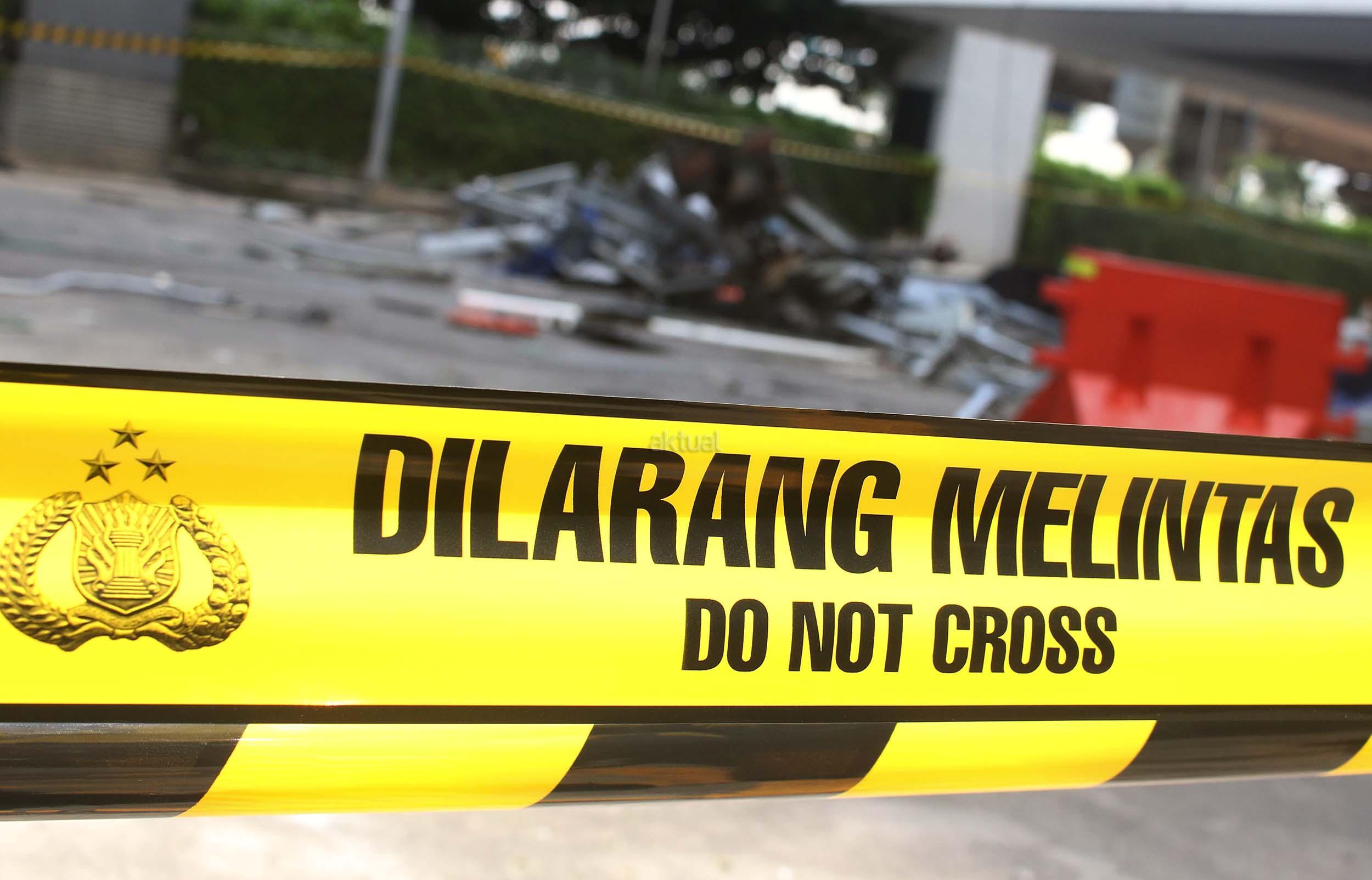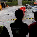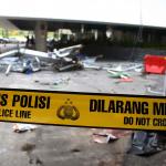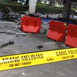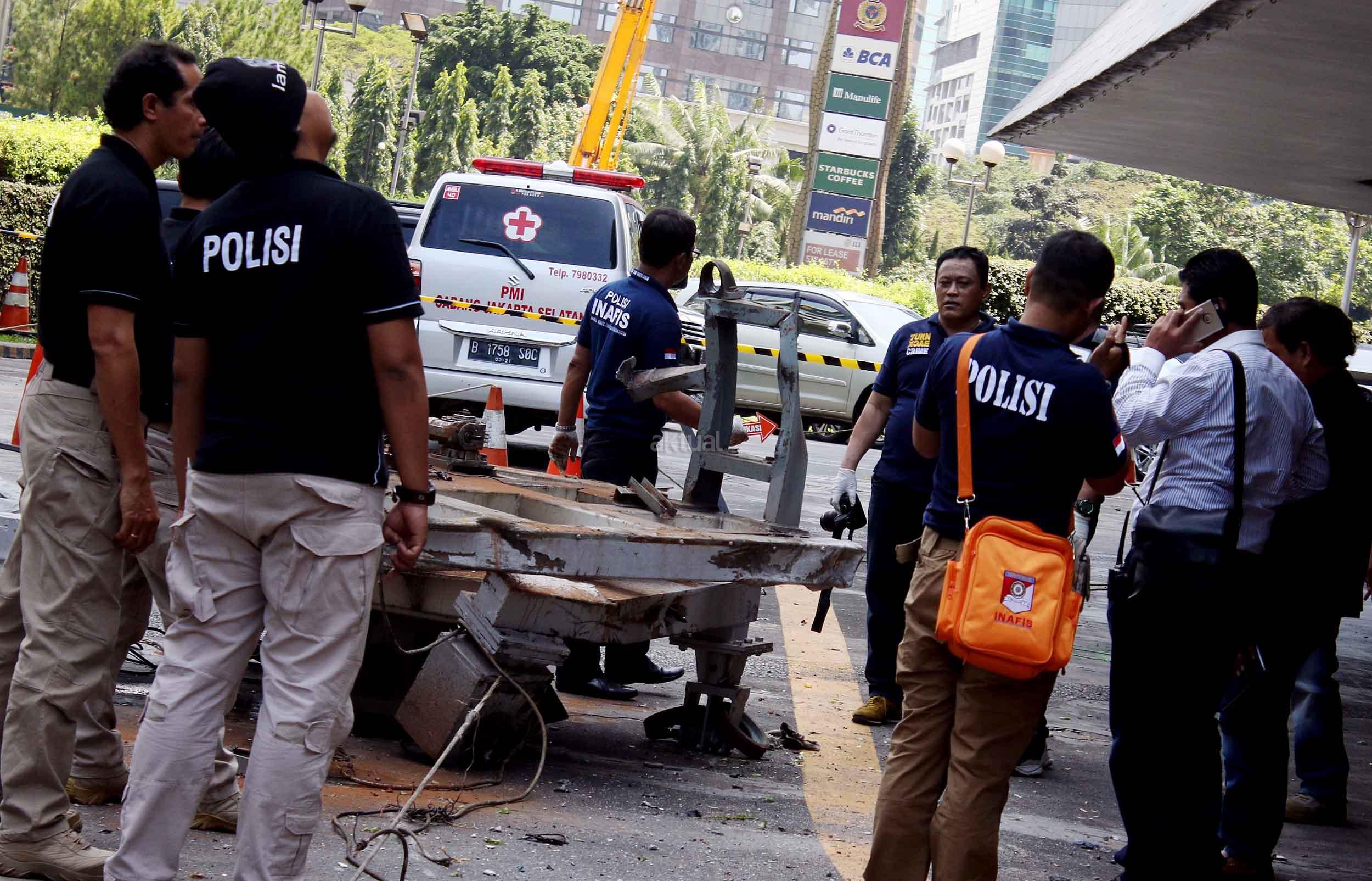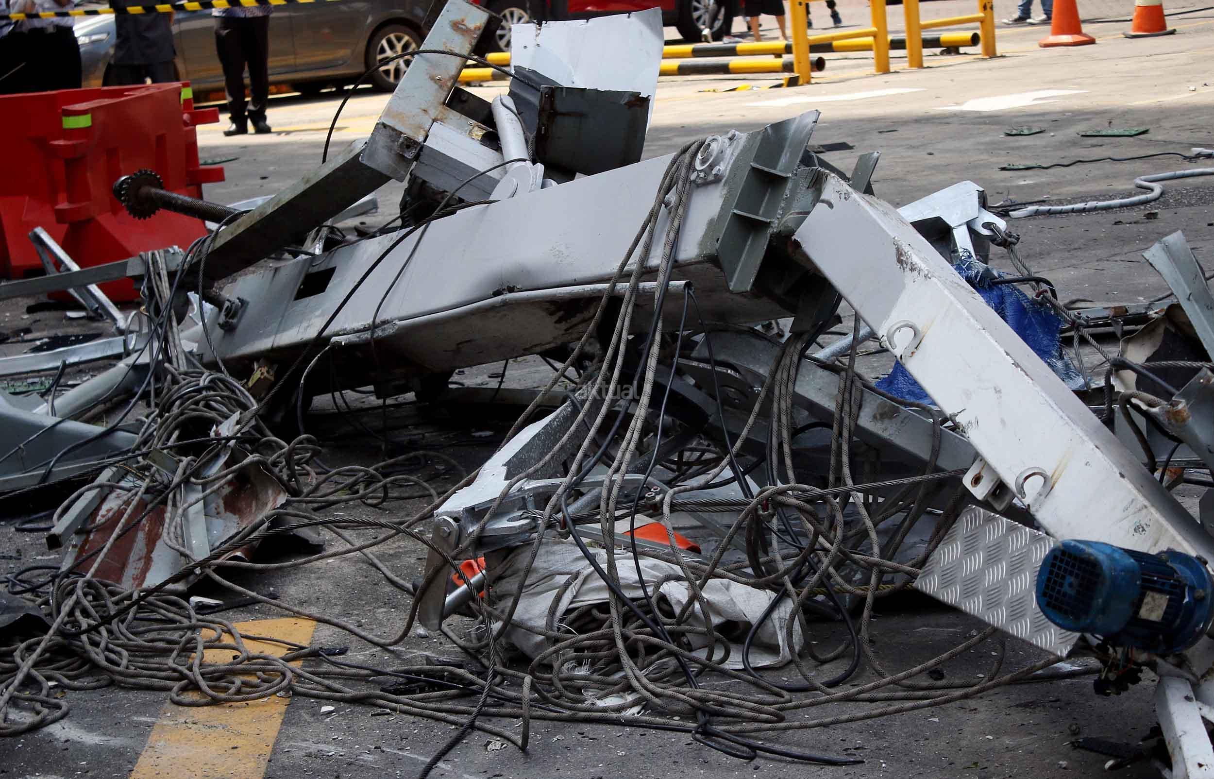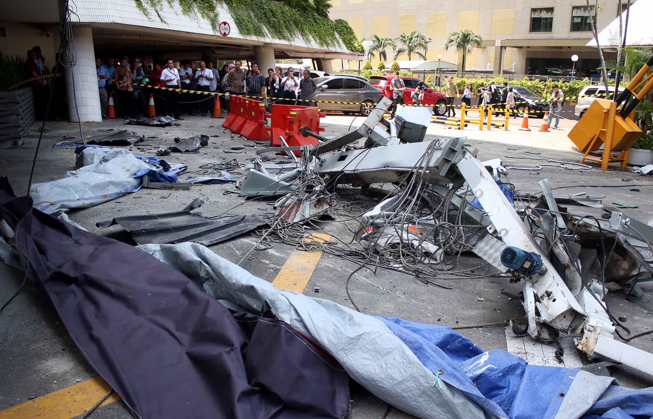 Sejumlah anggota Kepolisian dari Polres Jakarta Pusat memeriksa gondola yang jatuh dari lantai 23 Gedung Intiland Tower Sudirman, Jakarta, Rabu (26/10/2016). Kereta gantung (gondola) jatuh dari lantai 23 Gedung Intiland Tower Sudirman dan seorang operator meninggal dunia yang diduga gondola jatuh karena tali terputus.