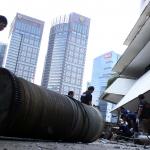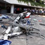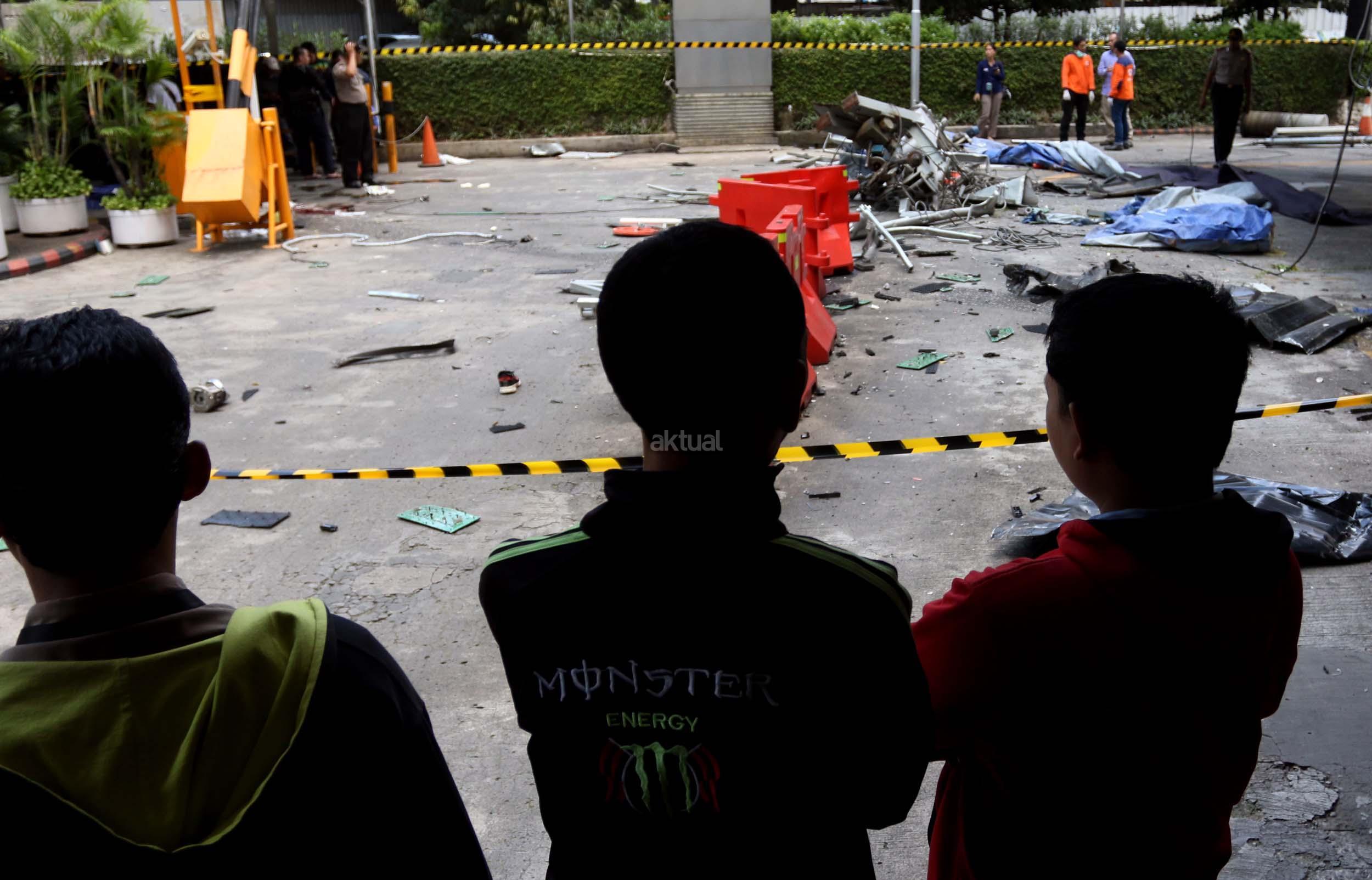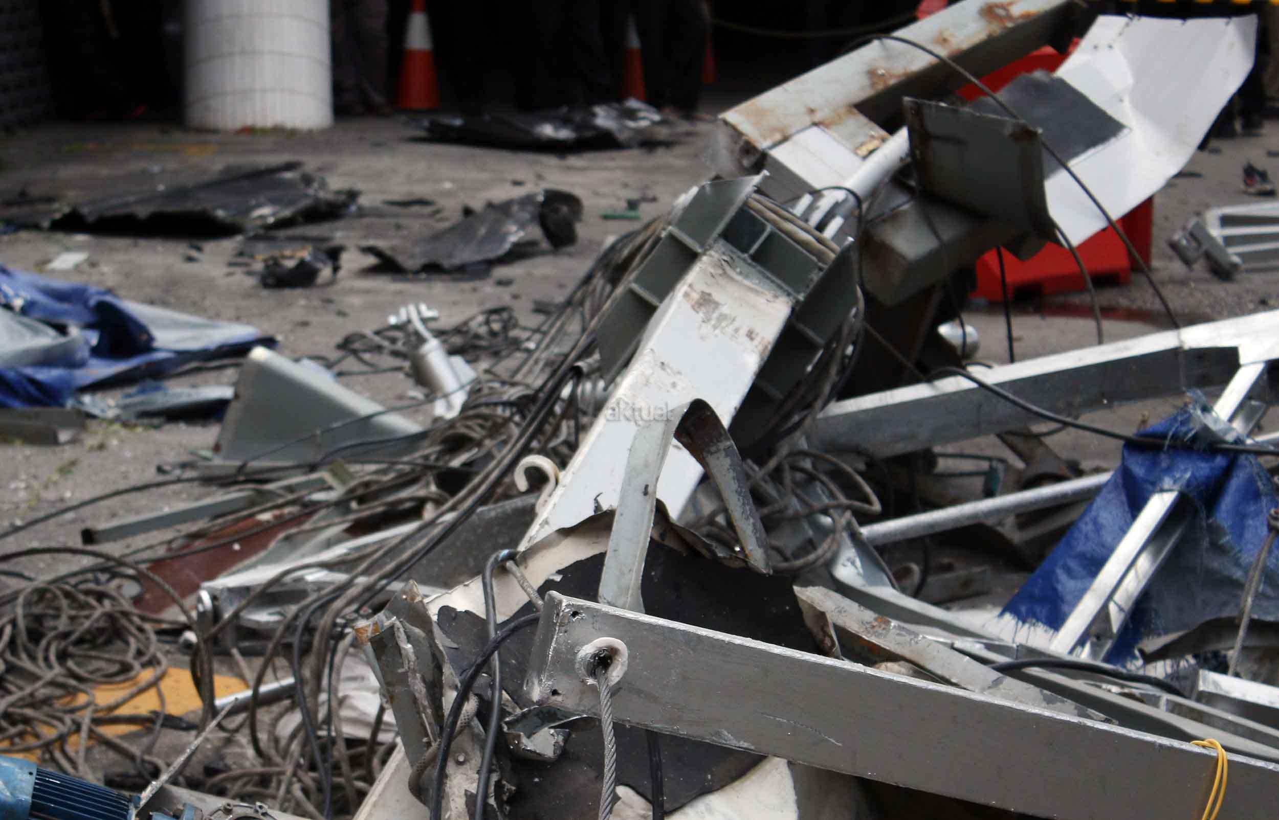 Sejumlah anggota Kepolisian dari Polres Jakarta Pusat memeriksa gondola yang jatuh dari lantai 23 Gedung Intiland Tower Sudirman, Jakarta, Rabu (26/10/2016). Kereta gantung (gondola) jatuh dari lantai 23 Gedung Intiland Tower Sudirman mengakibatkan seorang operator meninggal dunia. Diduga gondola jatuh karena tali terputus. AKTUAL/Munzir