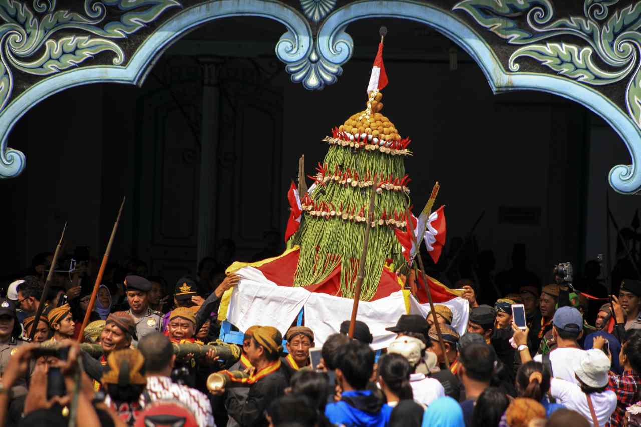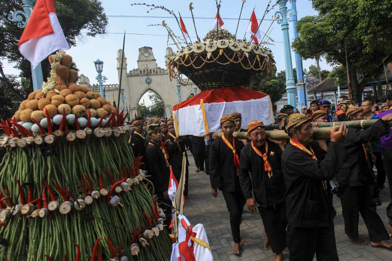 Abdi Dalem Keraton Surakarta Hadiningrat mengarak gunungan dari Keraton menuju Masjid Agung Surakarta untuk didoakan sebelum diperebutkan oleh warga dalam prosesi Grebeg Syawal Solo, Jawa Tengah, Jumat (8/7). Grebeg tersebut digelar sebagai wujud syukur karena telah selesai menjalankan puasa Ramadan sekaligus upaya berbagi pihak Keraton kepada warga. ANTARA FOTO/Maulana Surya/ama/16.