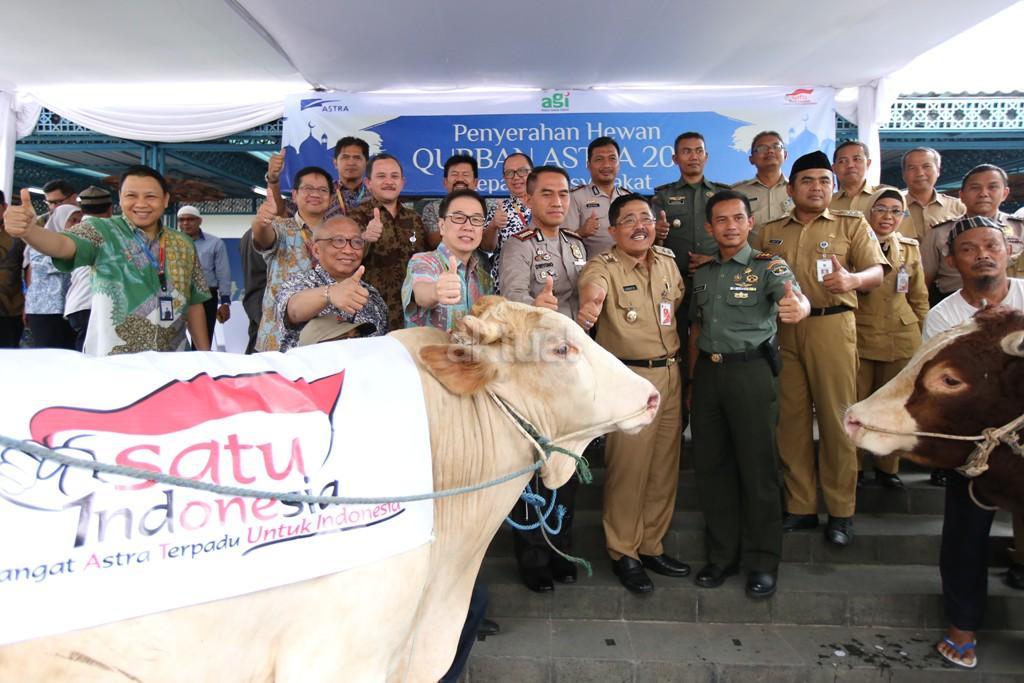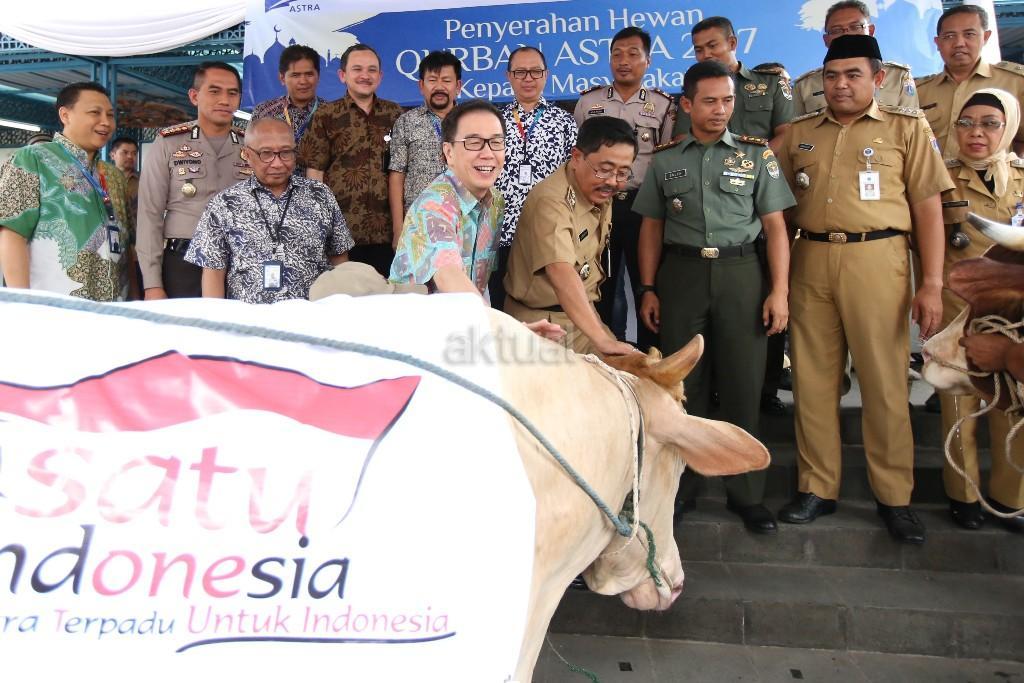 Wakil Walikota Jakarta Utara Junaedi (kelima kiri) menerima secara simbolis seekor sapi dari PT Astra International Tbk yang diserahkan oleh Presiden Direktur PT Astra International Tbk Prijono Sugiarto (keempat kiri) didampingi Chief of Corporate Communications, Social Responsibility & Security Astra International Pongki Pamungkas (ketiga kiri), Dandim 05/02 Jakarta Utara Letkol Kav. Soleh (ketiga kanan), Kepala Polres Jakarta Utara Kombes Pol Dwiyono (kedua kiri) dan Camat Tanjung Priok Syamsul Huda (kedua kiri) pada acara Penyerahan Hewan Kurban Astra 2017 Kepada Masyarakat di Masjid Astra, Jakarta, Selasa (29/8). Jumlah ini diharapkan masih dapat terus bertambah hingga Hari Raya Idul Adha 1438 H pada tanggal 1 September 2017. Saat ini total hewan kurban mencapai lebih dari Rp 8 miliar. AKTUAL/Humas Astra