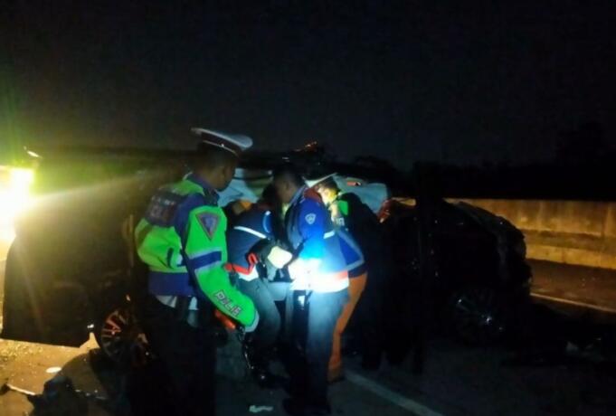 Mobil kemudian menabrak kendaraan truk golongan tiga yang berjalan lambat searah di depannya hingga melintang menutup lajur.