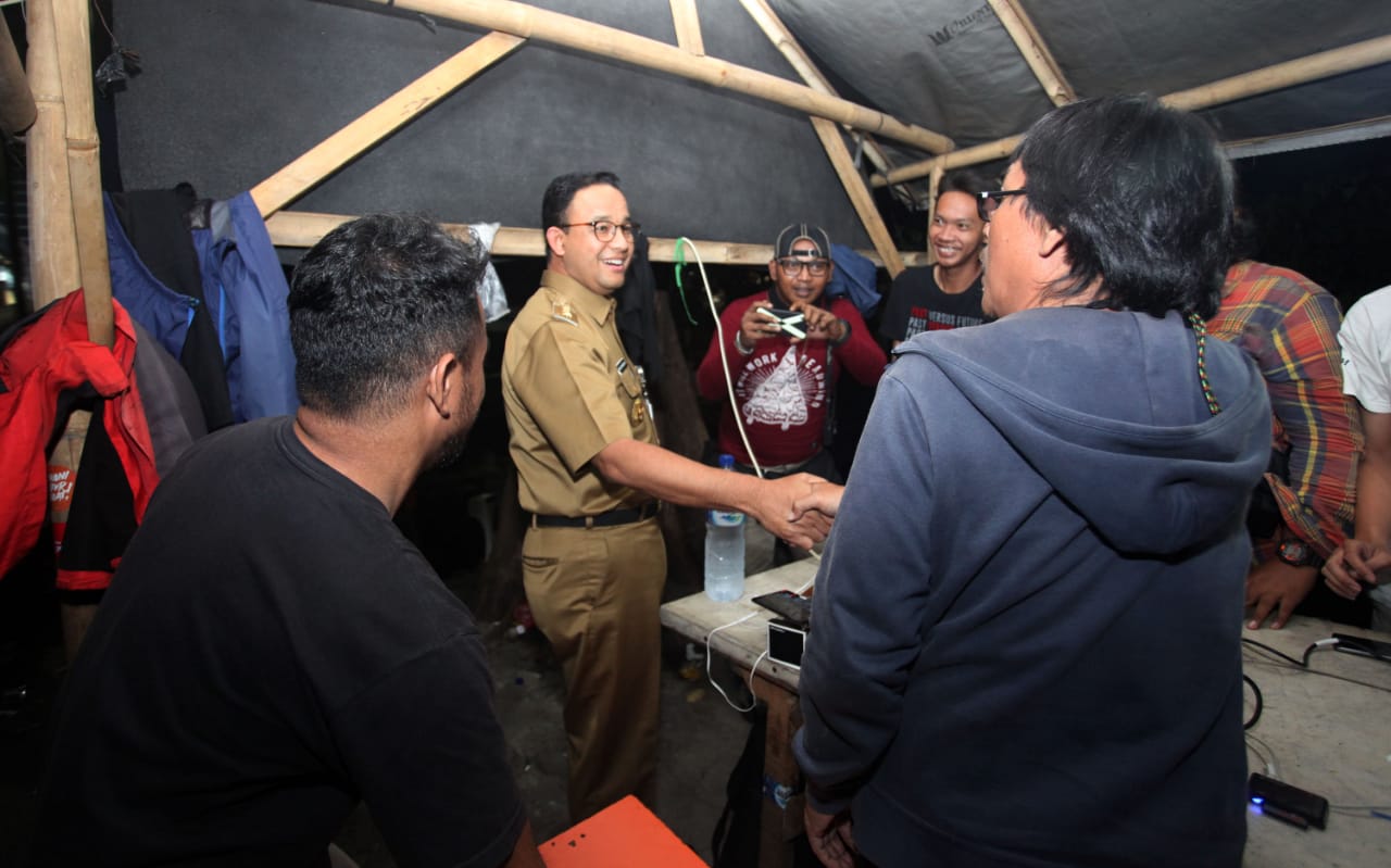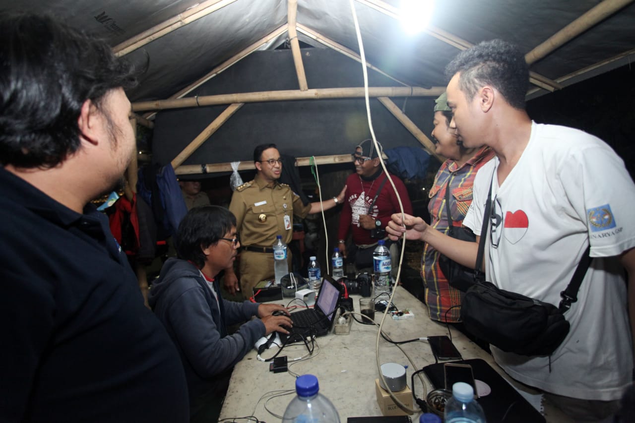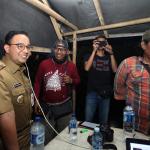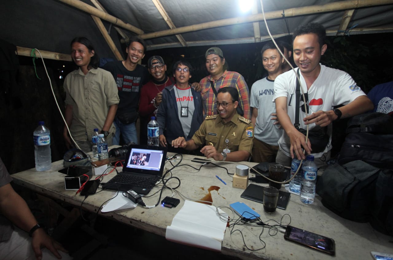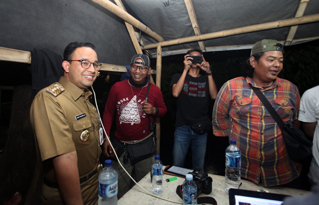 Gubernur DKI Jakarta Anies Baswedan berbincang dengan Pewarta Foto Indonesia Jakarta dari berbagai media nasional di Posko Pewarta Foto Bundaran Hotel Indonesia, Jakarta, Selasa (13/11/2018) malam. Kedatangan Gubernur DKI Jakarta Anies Baswedan untuk meninjau fasilitas masyarakat dikawasan Bundaran HI dan berbincang santai dengan para Pewarta foto. AKTUAL/Tino Oktaviano