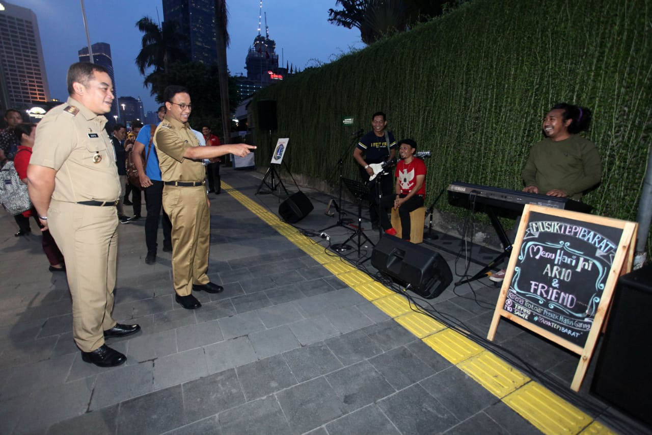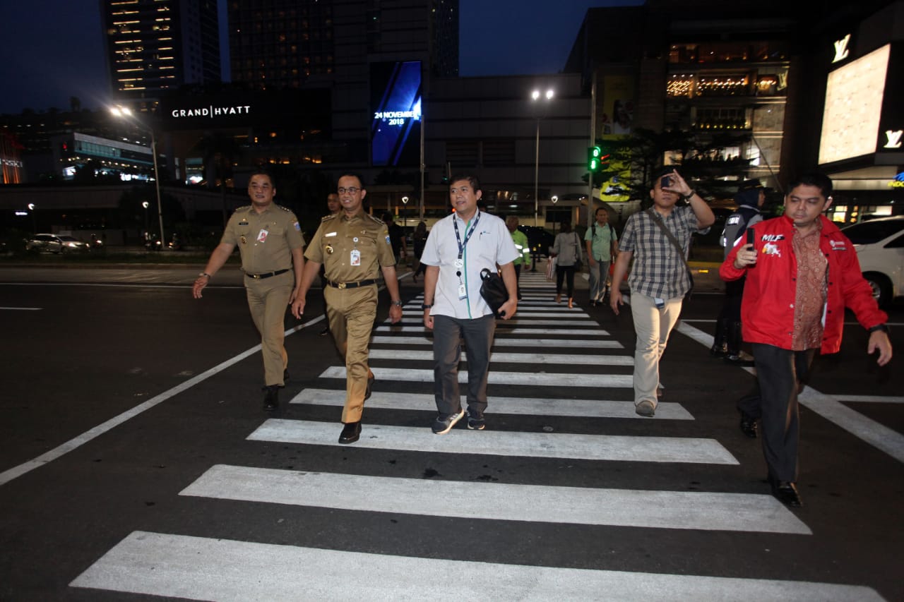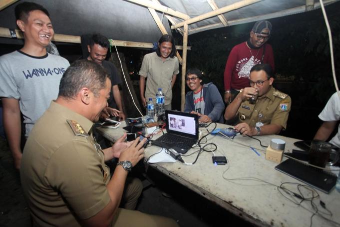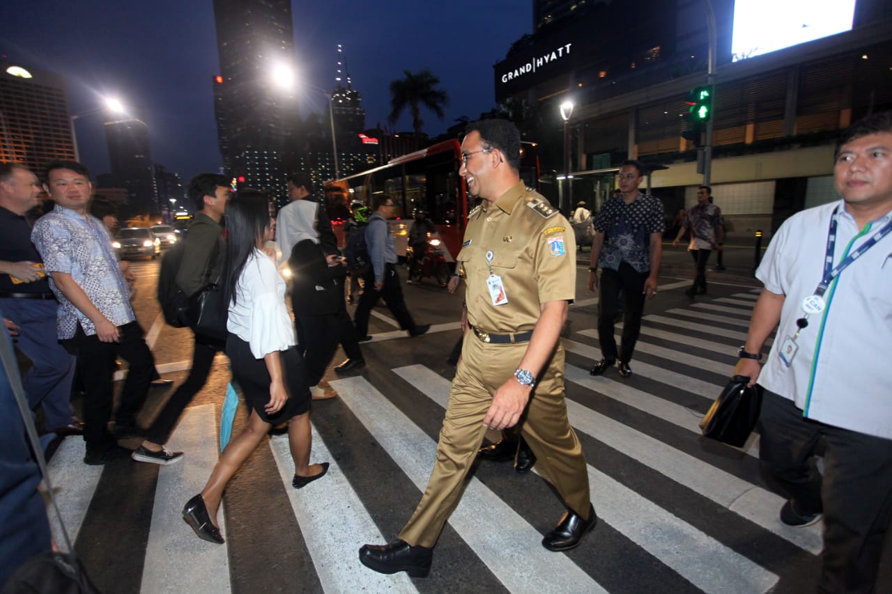 Gubernur DKI Jakarta Anies Baswedan berbincang dengan Pewarta Foto Indonesia Jakarta dari berbagai media nasional di Posko Pewarta Foto Bundaran Hotel Indonesia, Jakarta, Selasa (13/11/2018) malam. Kedatangan Gubernur DKI Jakarta Anies Baswedan untuk meninjau fasilitas masyarakat dikawasan Bundaran HI dan berbincang santai dengan para Pewarta foto. AKTUAL/Tino Oktaviano