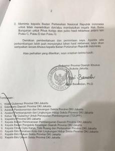 “Meminta kepada Badan Pertanahan Nasional Republik Indonesia untuk tidak menerbitkan dan/atau membatalkan segala Hak Guna Bangunan untuk Pihak Ketiga atas pulau hasil reklamasi antara lain adalah Pulau C, Pulau D dan Pulau G,” tambah Anies dalam surat tersebut.