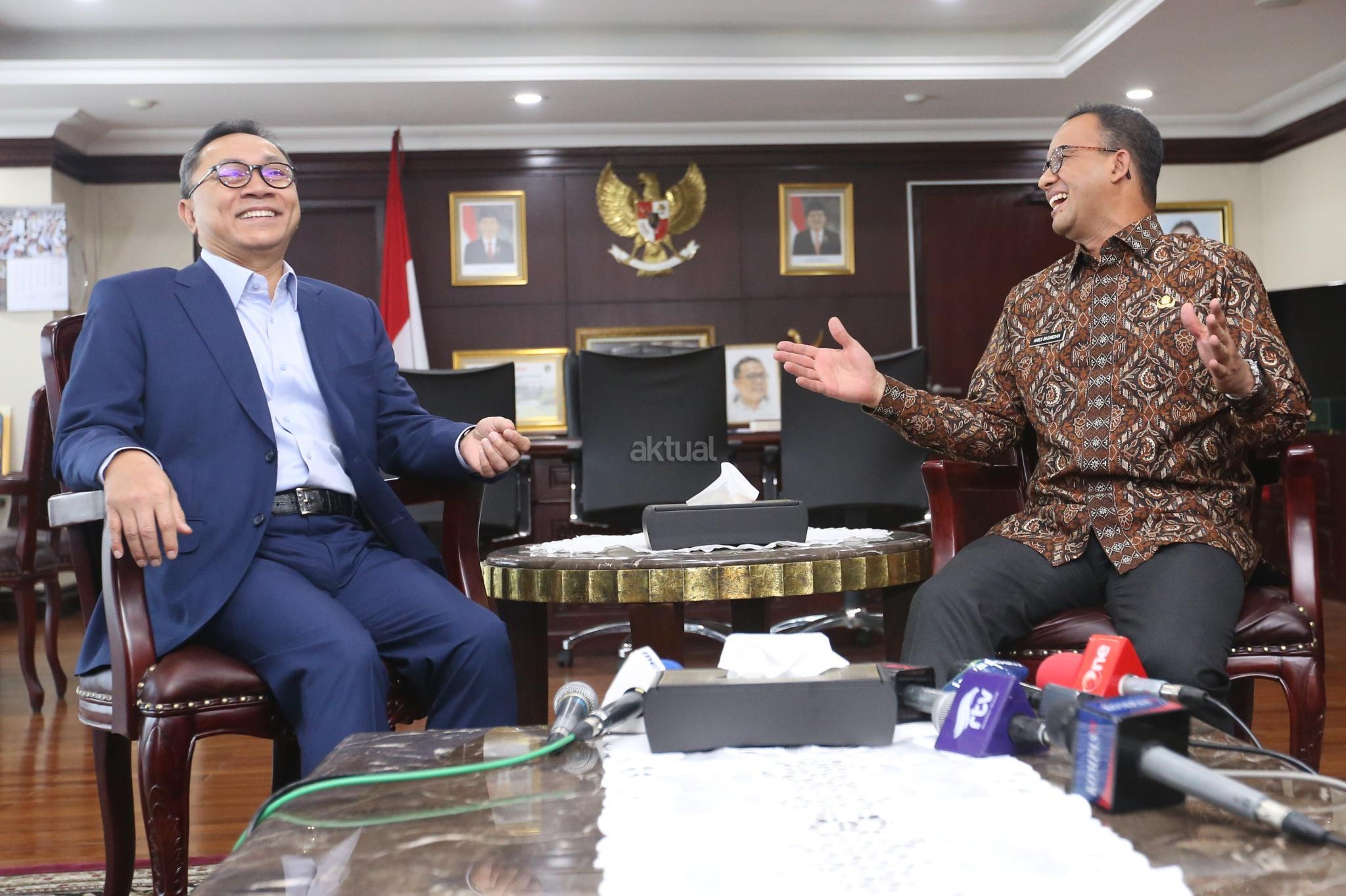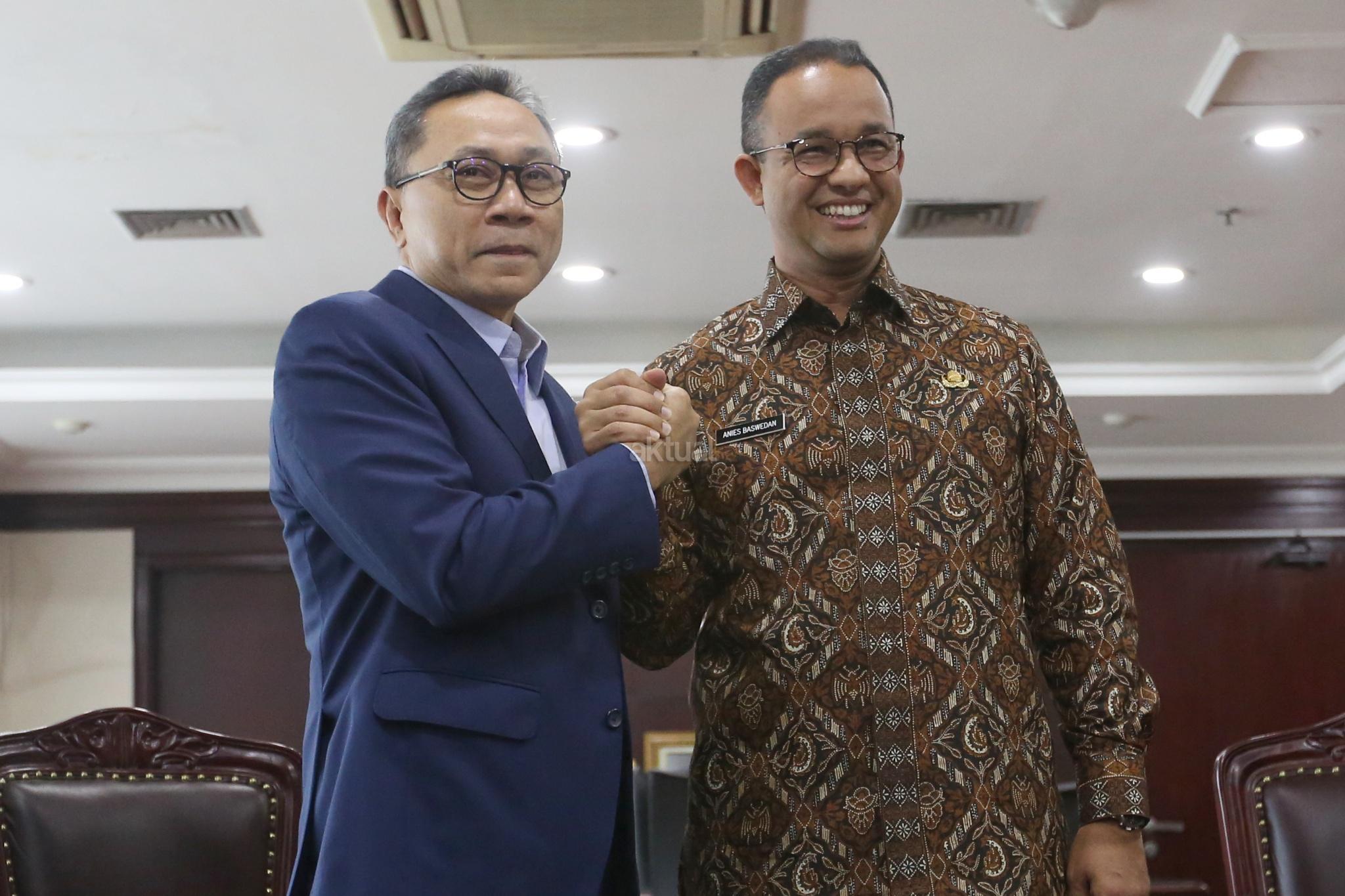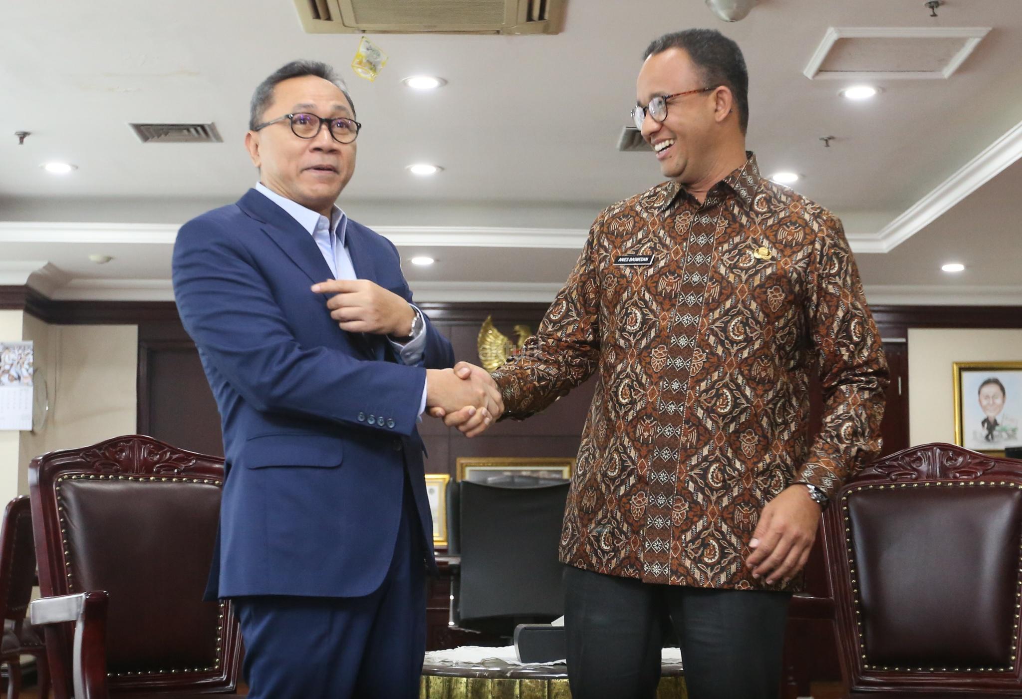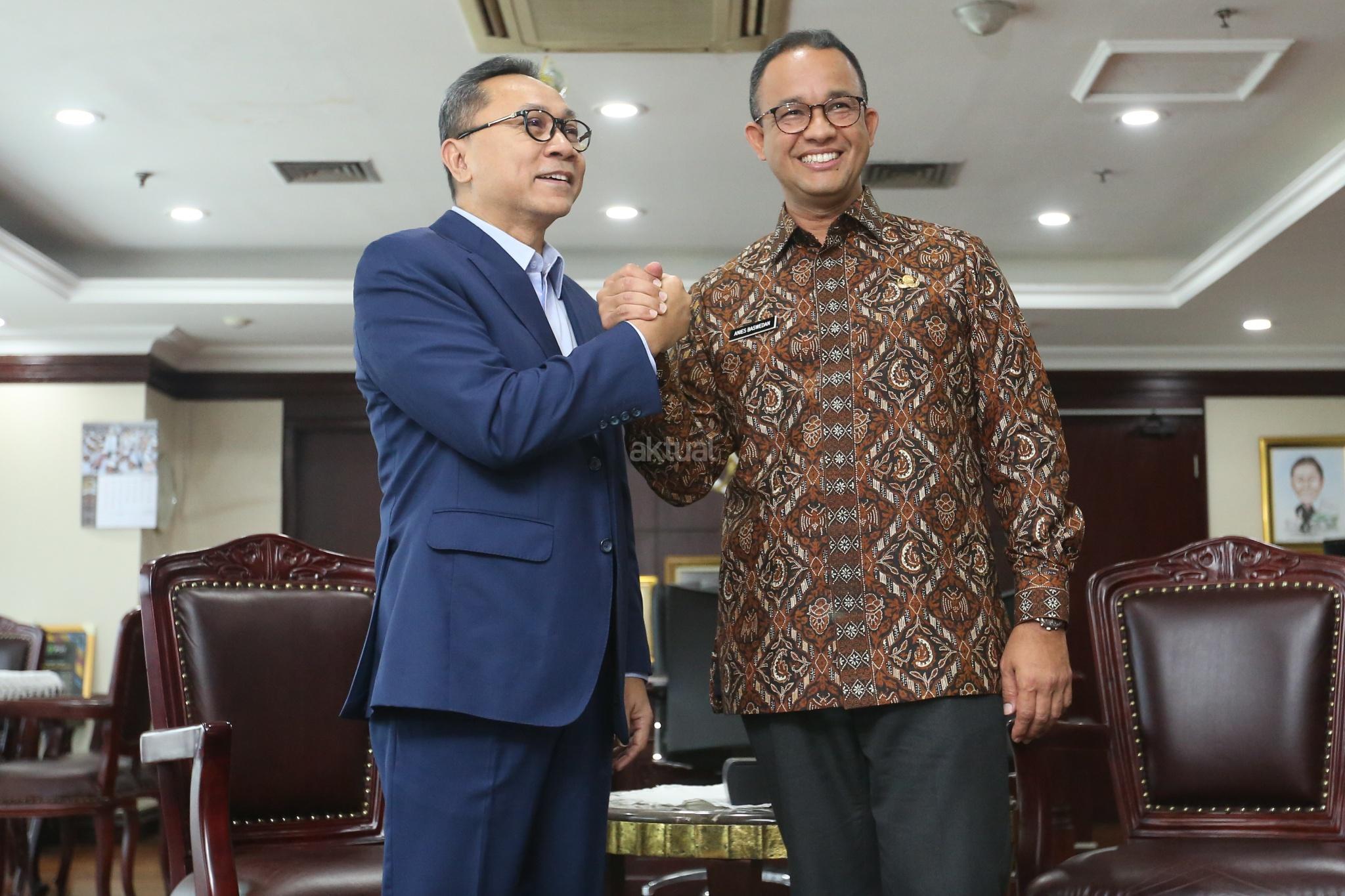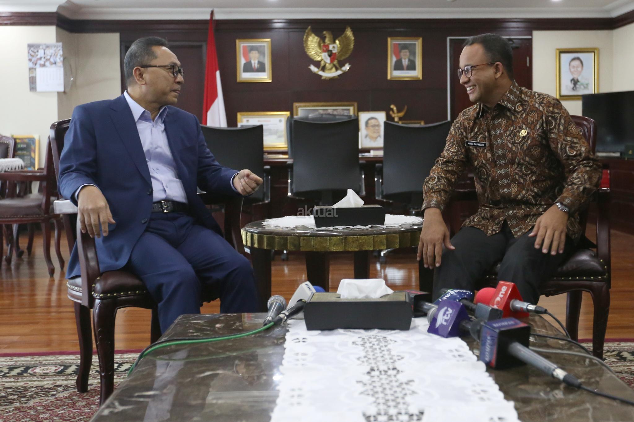 Ketua MPR Zulkifli Hasan (kiri) berbincang dengan Gubernur DKI Jakarta Anies Baswedan (kanan) saat melakukan pertemuan tertutup di Kompleks Parlemen, Senayan, Jakarta, Kamis (5/7). Pertemuan tersebut antara lain membahas penyegelan di kawasan reklamasi Teluk Jakarta dan silaturahmi politik menjelang Pilpres 2019. AKTUAL/Tino Oktaviano