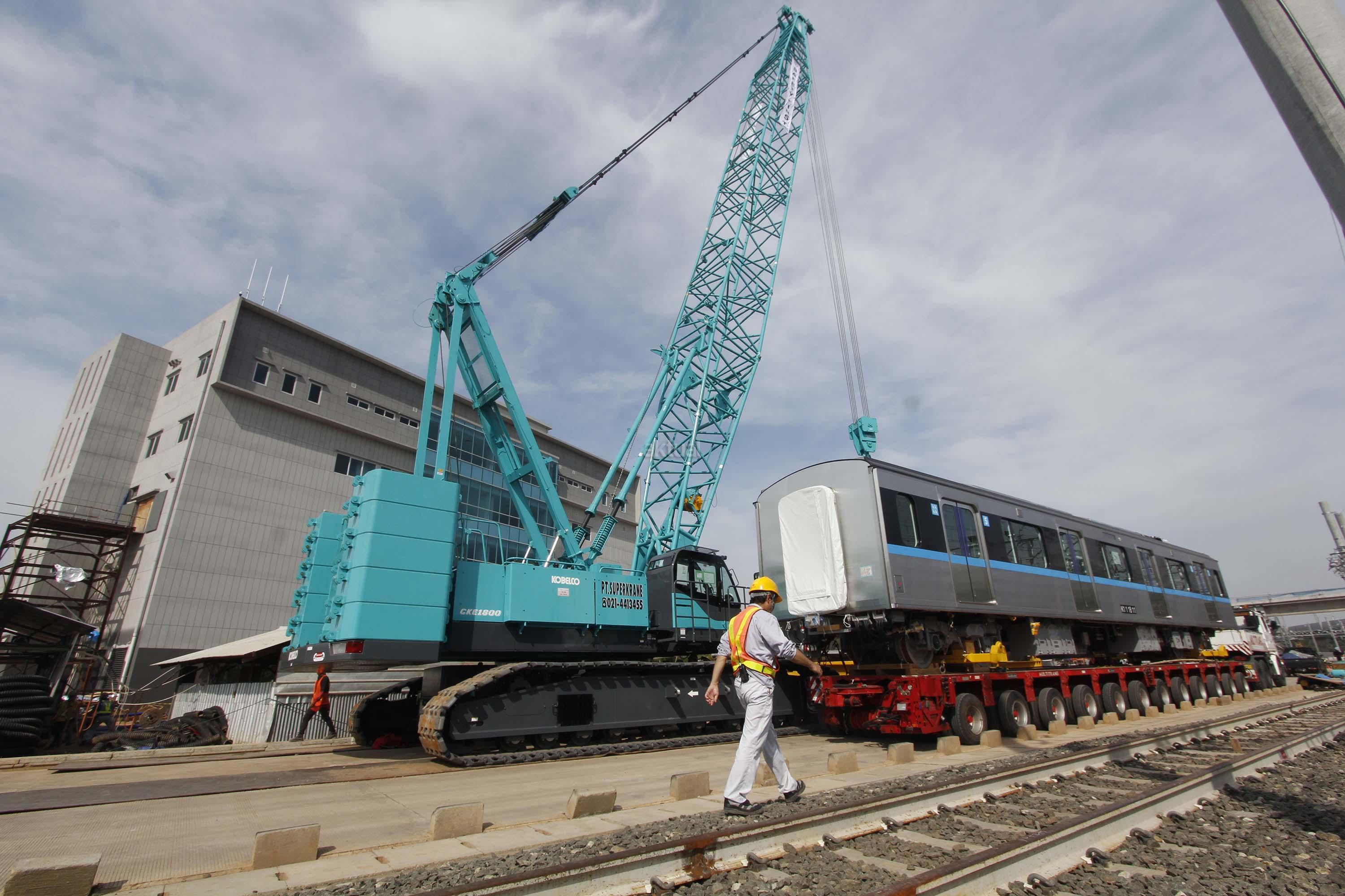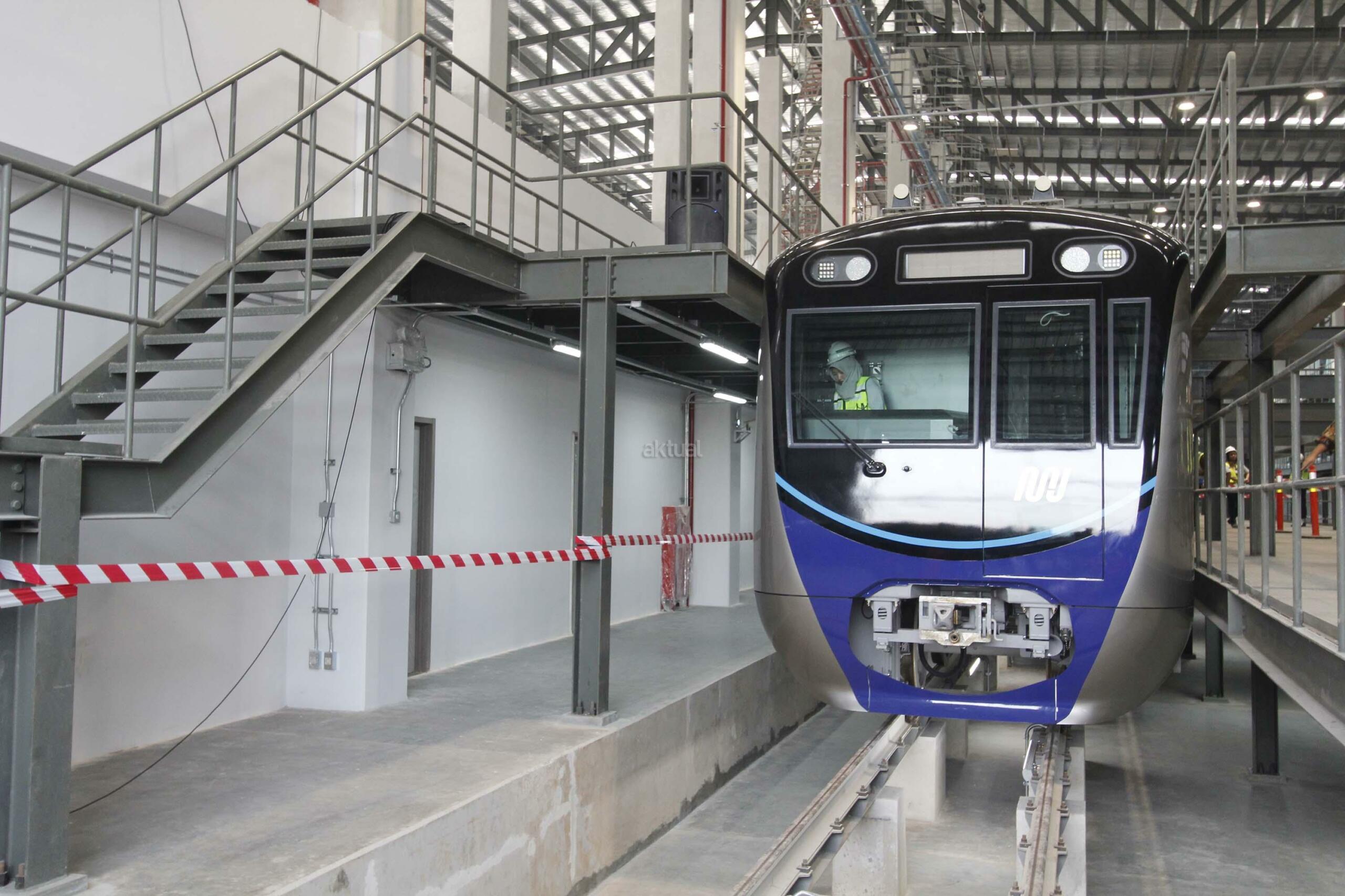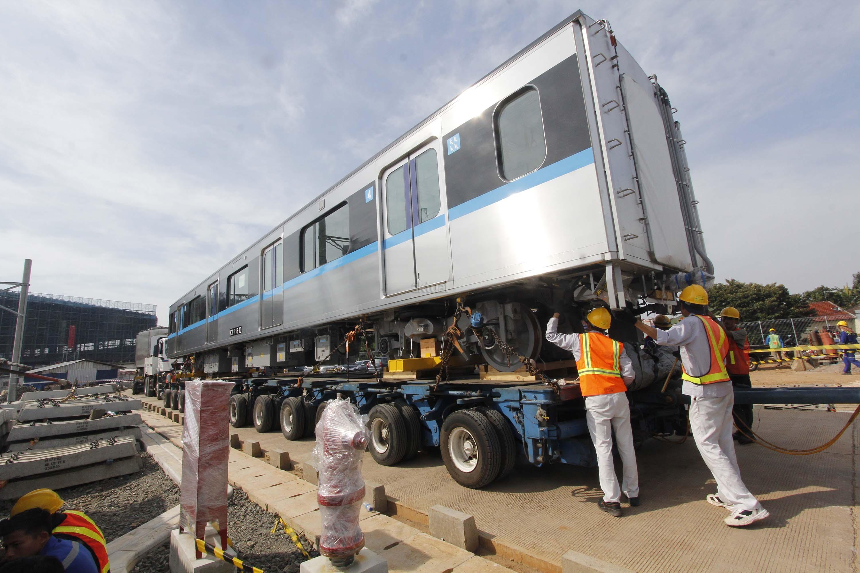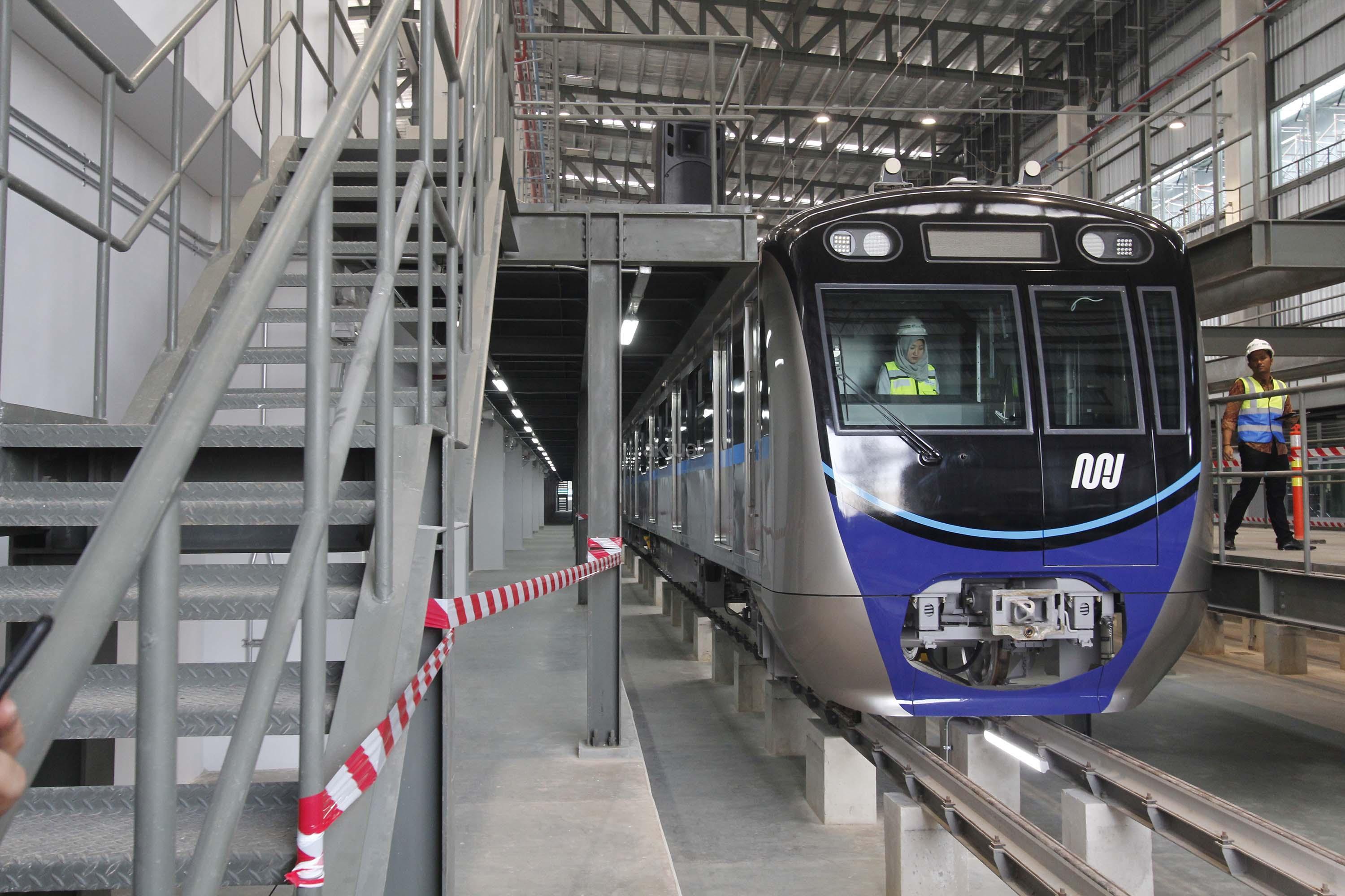 Perkerja melintas di dekat kepala kereta MRT di Depo MRT Lebak Bulus, Jakarta, Kamis (12/4). Dua set rangkaian kereta MRT telah berada di Depo Lebak Bulus dan akan dilakukan serangkaian tes serta persiapan sebelum diujicobakan pada Desember 2018. AKTUAL/Tino Oktaviano