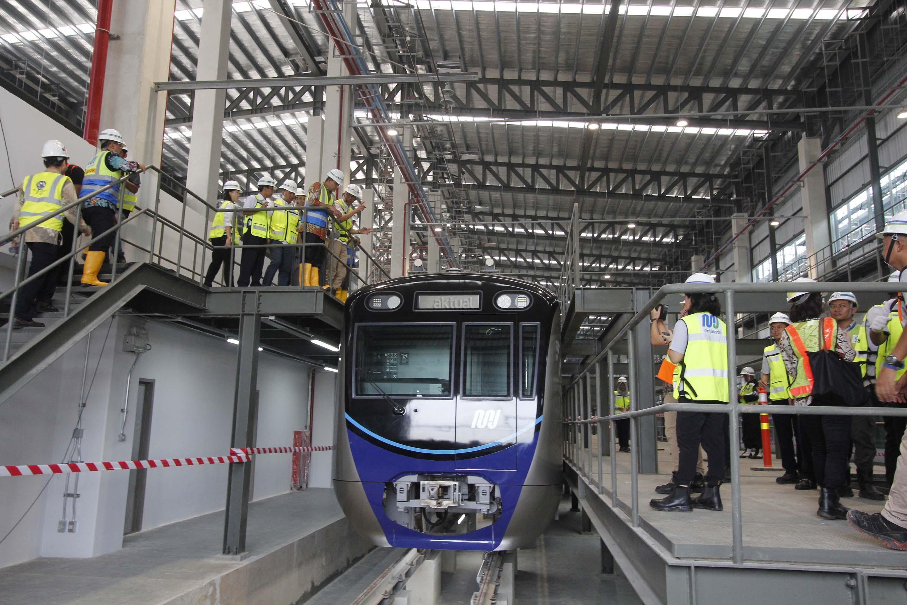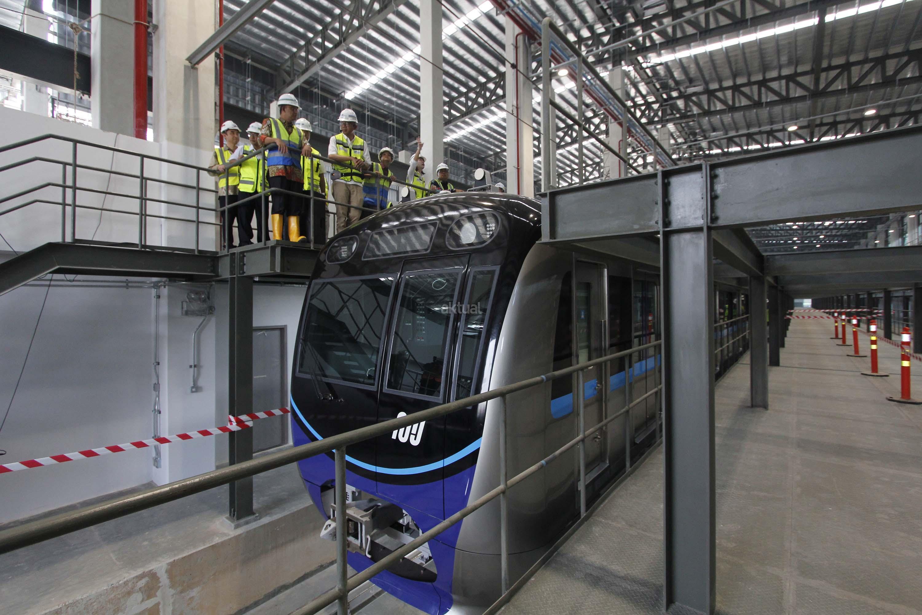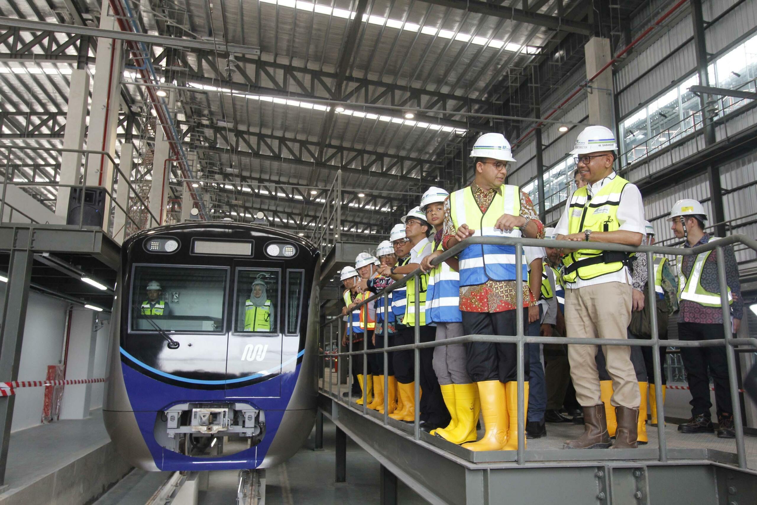 Gubernur DKI Jakarta Anies Baswedan (ketiga kanan) didampingi Direktur Utama PT MRT Jakarta William Sabandar (kedua kanan) melihat kepala kereta MRT di Depo MRT Lebak Bulus, Jakarta, Kamis (12/4). Dua set rangkaian kereta MRT telah berada di Depo Lebak Bulus dan akan dilakukan serangkaian tes serta persiapan sebelum diujicobakan pada Desember 2018. AKTUAL/Tino Oktaviano