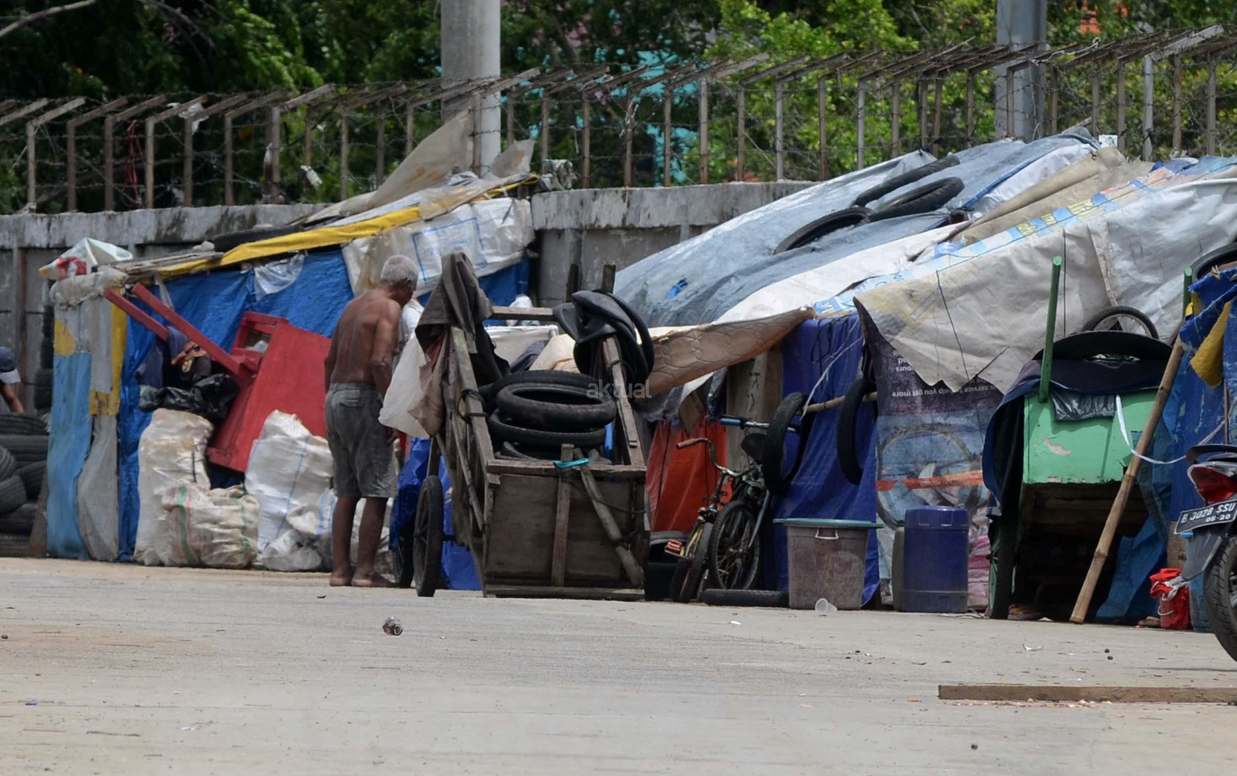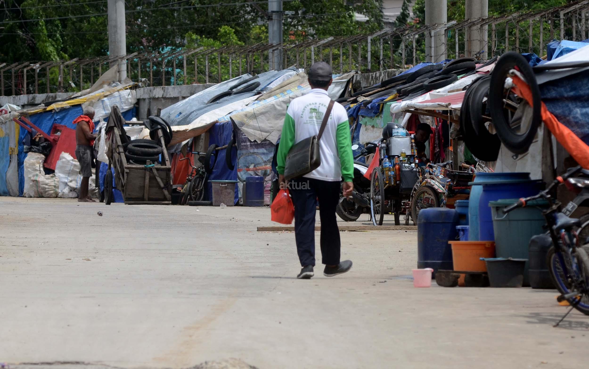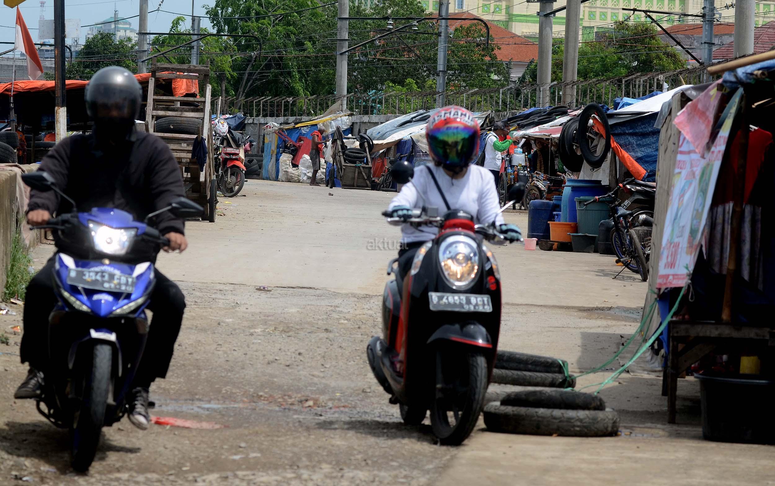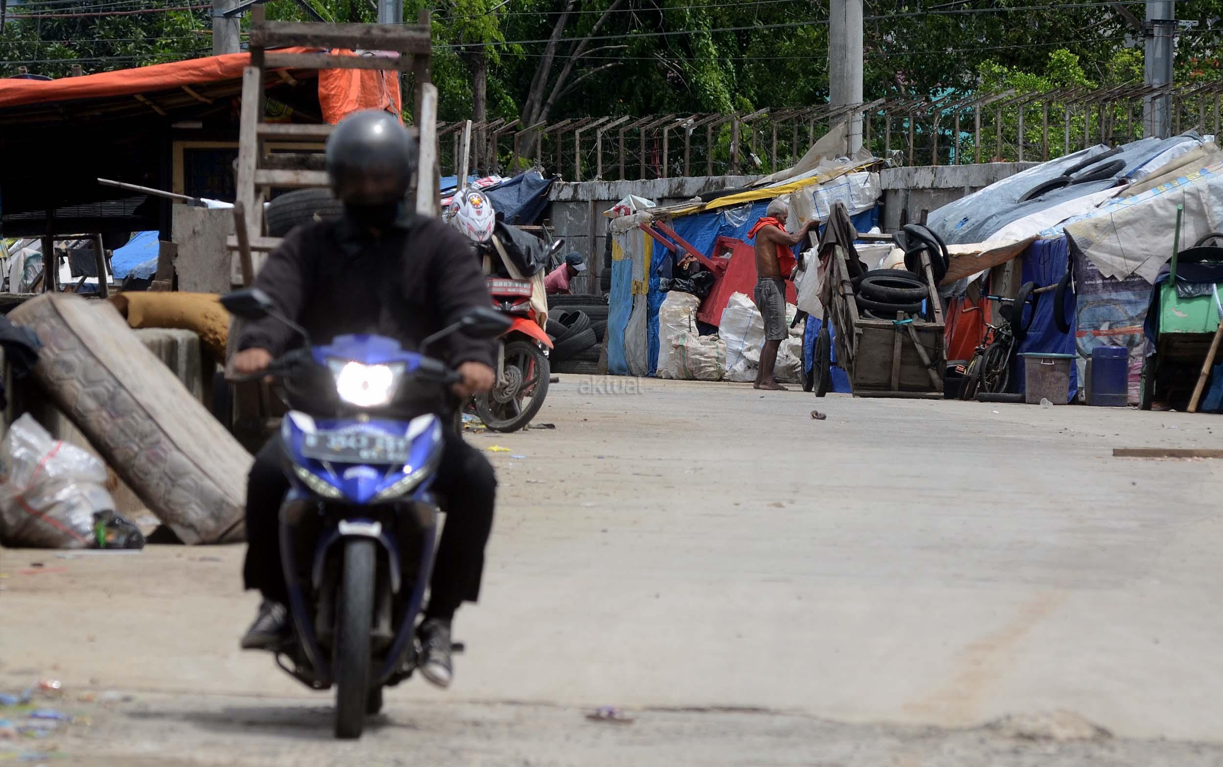 Pengendara Motor melintas didepan gubuk yang berada di jalur inspeksi kanal banjir barat (KBB) di kawasan Kebon Melati, Jakarta, Jumat (9/12/2016). Kurangnya pengawasan membuat gubuk liar kembali berdiri di kawasan tersebut, meski telah berulang kali ditertibkan. AKTUAL/Munzir