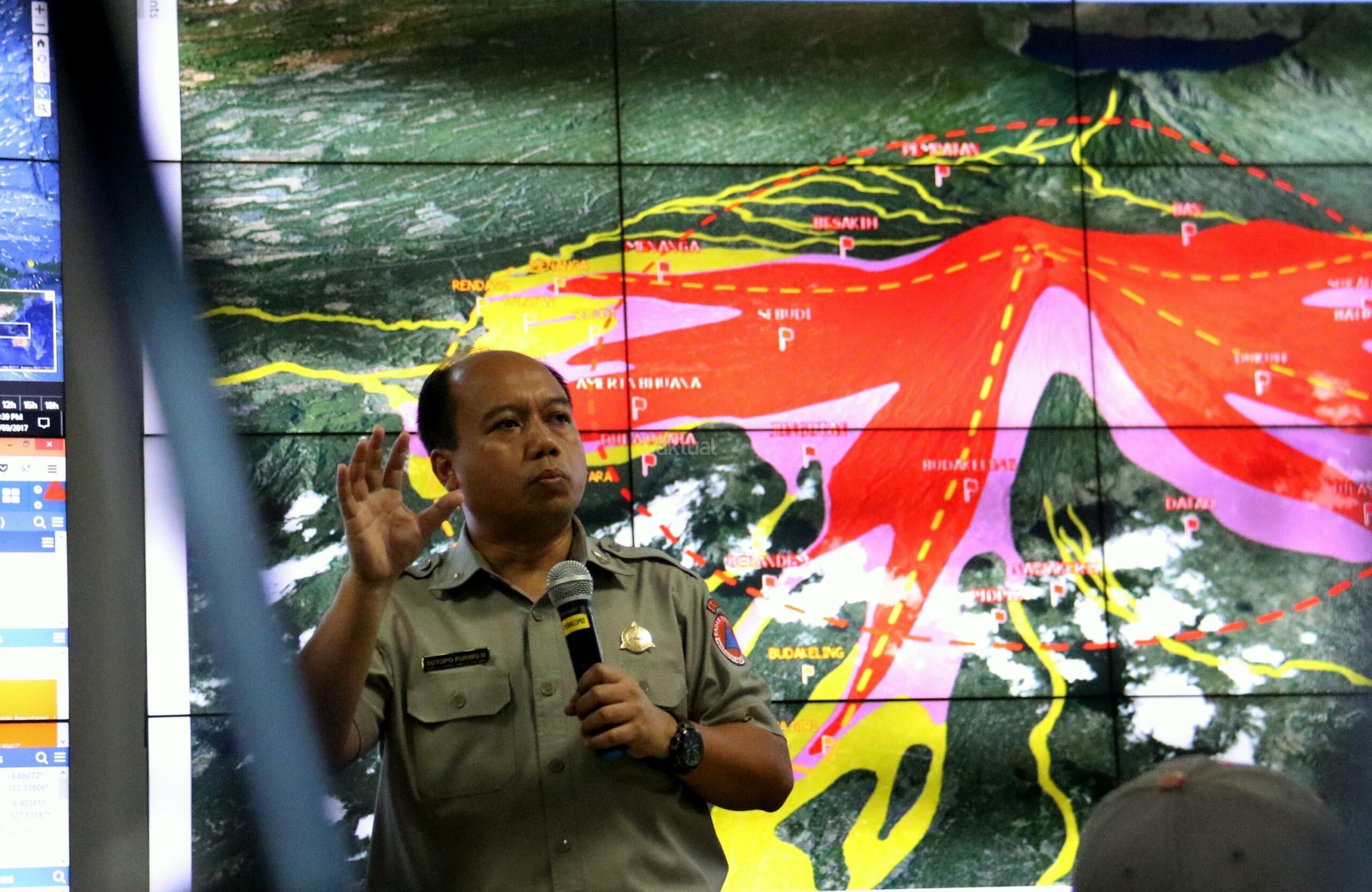 Kepala Humas BNPB Sutopo Nugroho saat memberikan keterangan persnya terkait kondisi terkini Gunung Agung di kantor Pusat BNPB, Jakarta, Senin (25/9/2017). Dalam jumpa persnya Badan Nasional Penanggulangan Bencana (BNPB) bahwa kondisi terkini Gunung Agung sudah masuk fase kritis, dimana fase potensi letusan sangat tinggi dan dapat terjadi dengan waktu tidak bisa diprediksi. AKTUAL/Munzir