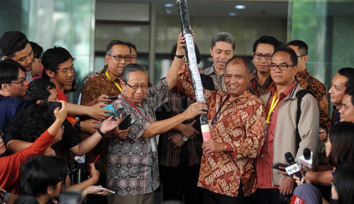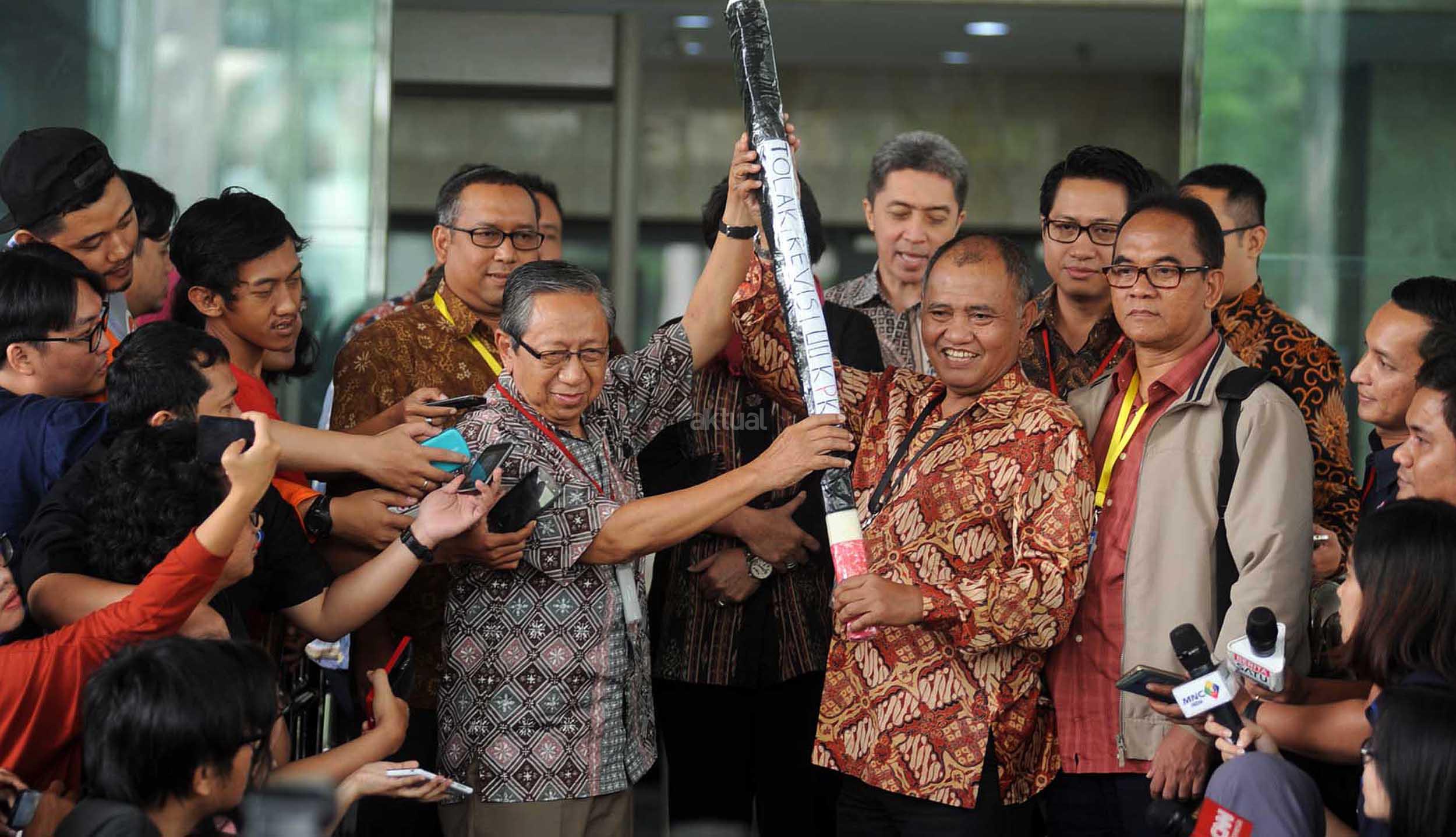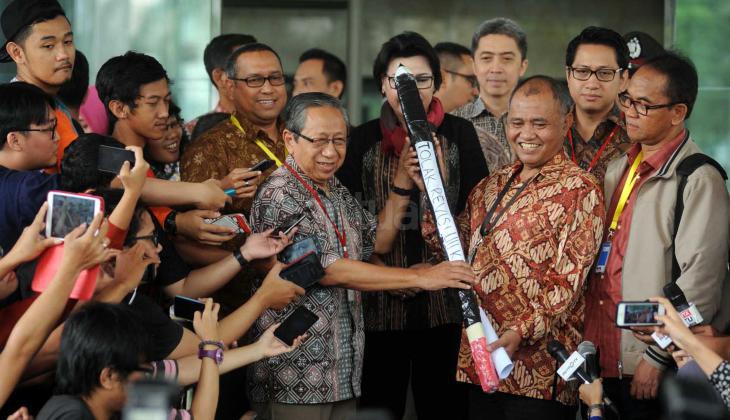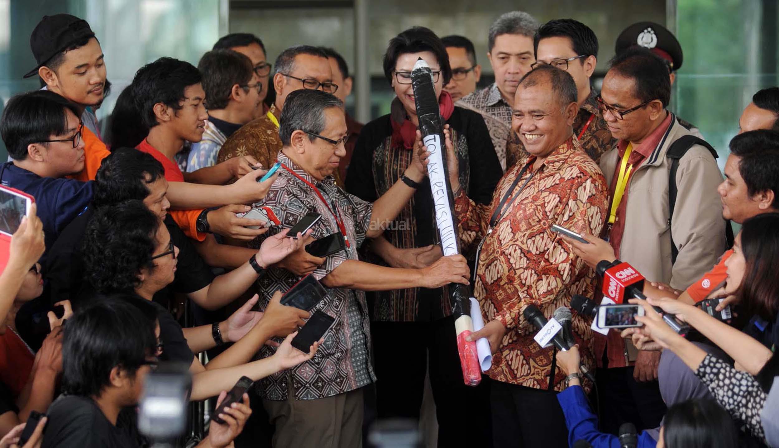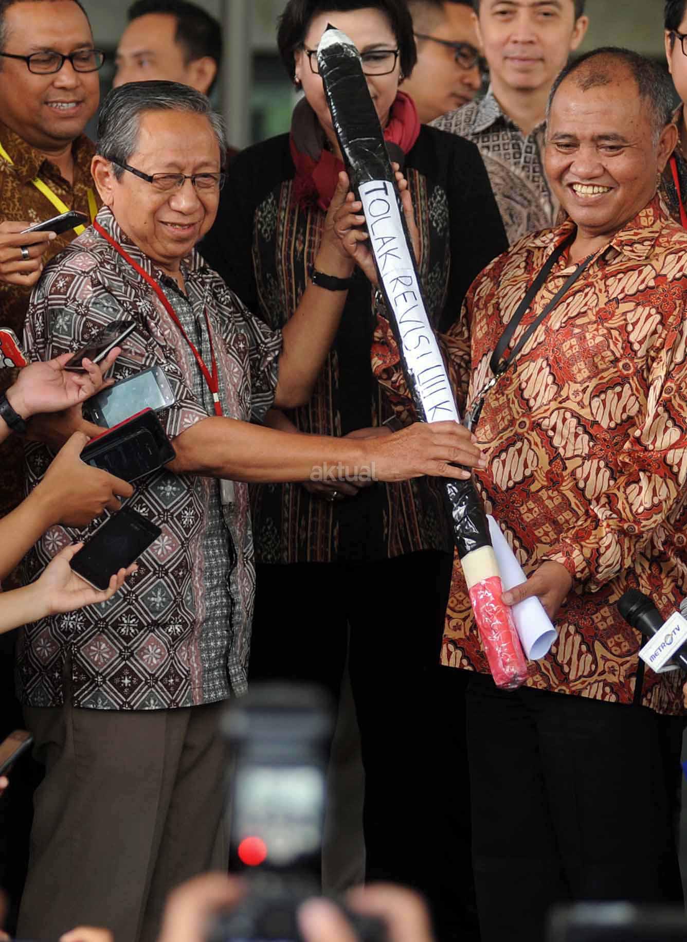 Profesor Bambang Widodo Umar bersama sejumlah guru besar dari beberapa universitas terkemuka menyerahkan "pensil raksasa" kepada Ketua Komisi Pemberantasan Korupsi (KPK) Agus Rahardjo sebagai simbol dukungan dari akademisi kampus kepada Komisi Pemberantasan Korupsi (KPK) di Kuningan, Jakarta Selatan, Jumat (19/2). Rencana DPR merevisi UU KPK ditolak guru besar dari sejumlah universitas. Pasalnya, sebagian besar isi draf revisi UU Nomor 30/2002 itu dianggap sebagai pelemahan upaya pemberantasan korupsi.